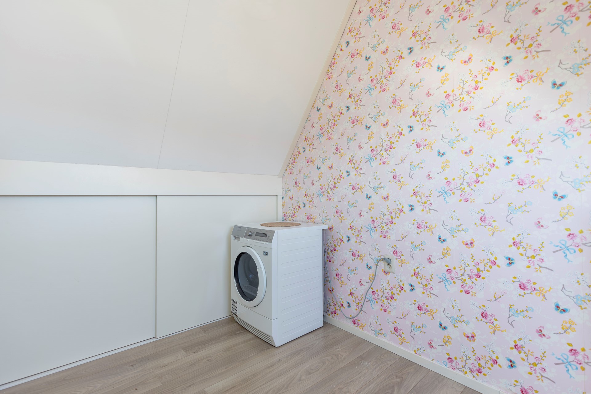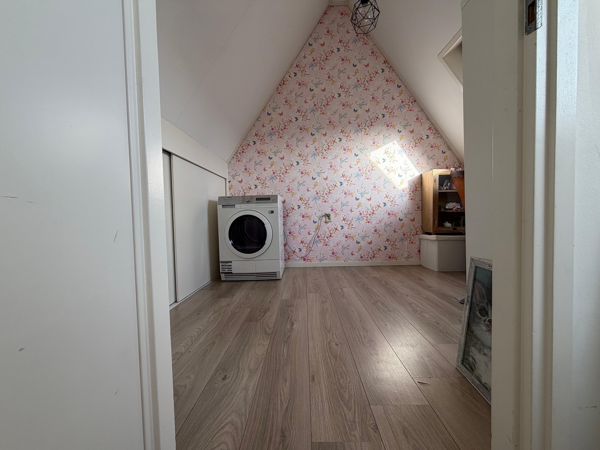 De zolderverdieping biedt verrassend veel ruimte. Op de overloop bevinden zich de cv-installatie en de aansluitingen voor wasmachine en droger, met daarnaast voldoende plek voor het creëren van een werkplek.
