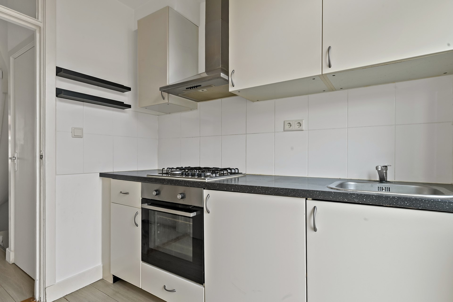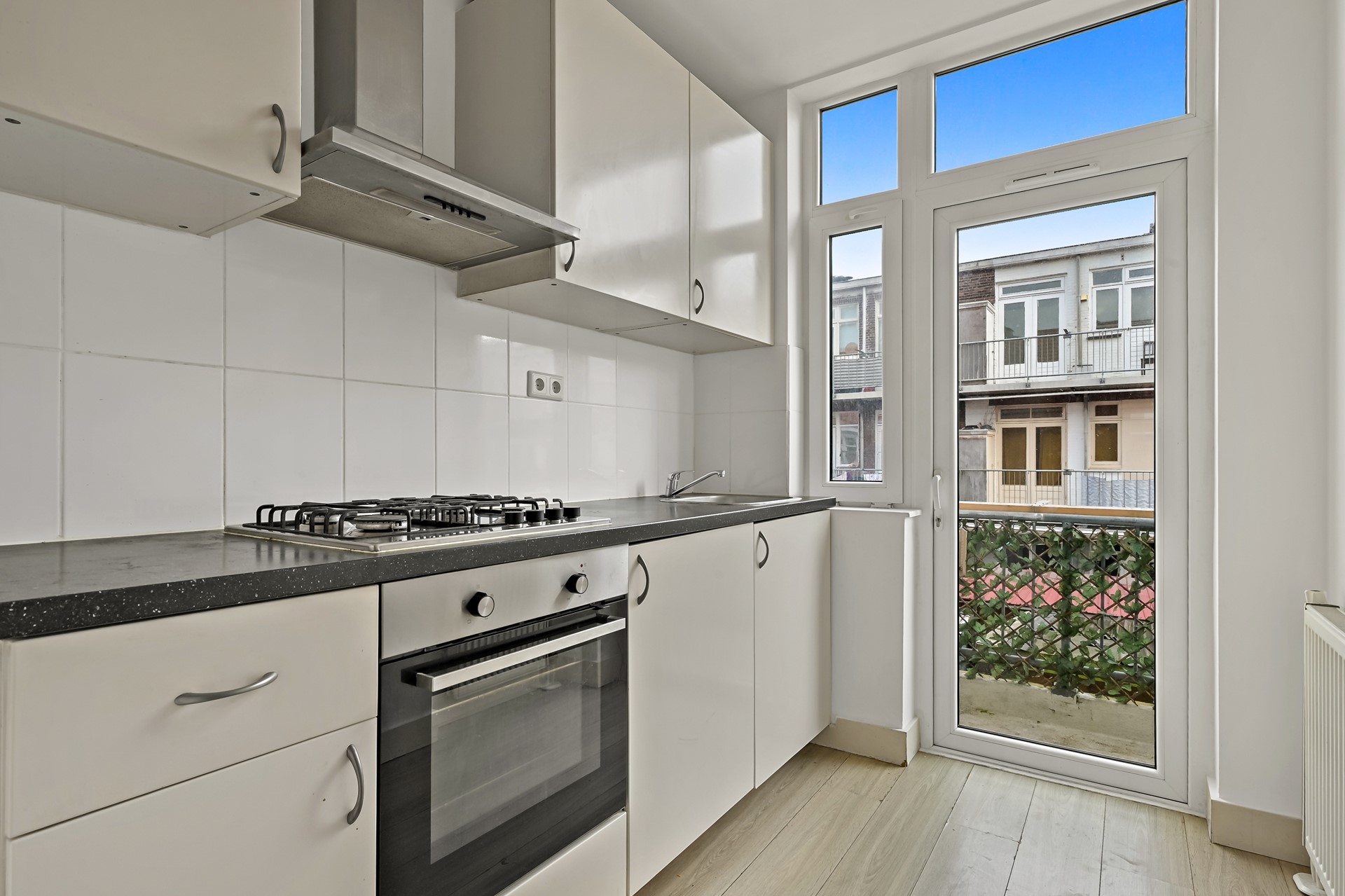 De keuken is tevens gelegen op de eerste etage, aan de achterzijde van de woning. De keuken is voorzien van een 4 pits gasfornuis, een elektrische oven en een afzuigkap (er is ruimte om een tafelmodel koelkast te plaatsen). De keuken heeft ruime opbergmogelijkheden.