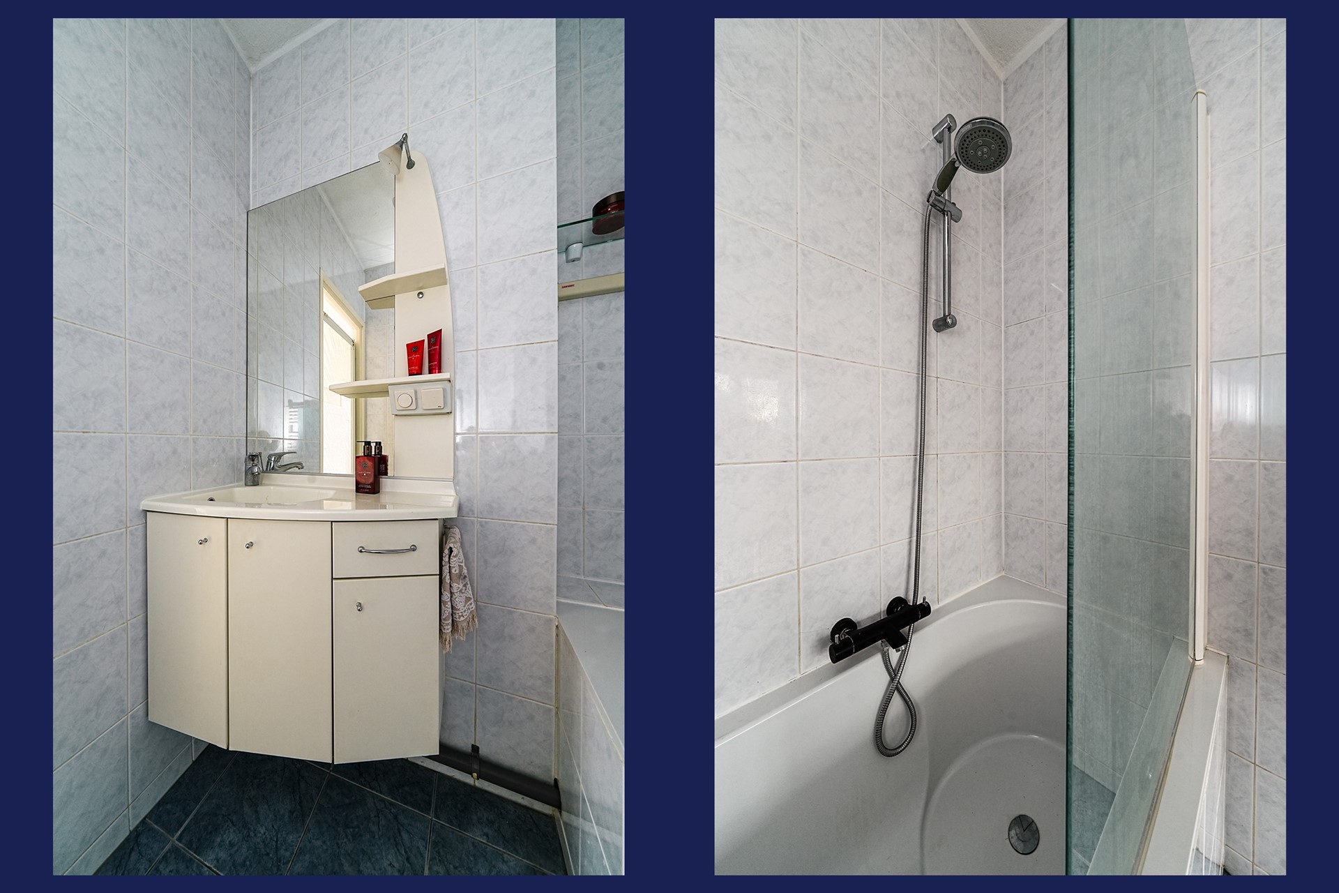 De badkamer is voorzien van een ligbad met thermostaat en handdouche, een wastafelmeubel en een handdoekenradiator. De badkamer is afgewerkt met lichtblauwe wand- en grote donkergrijze vloertegels.