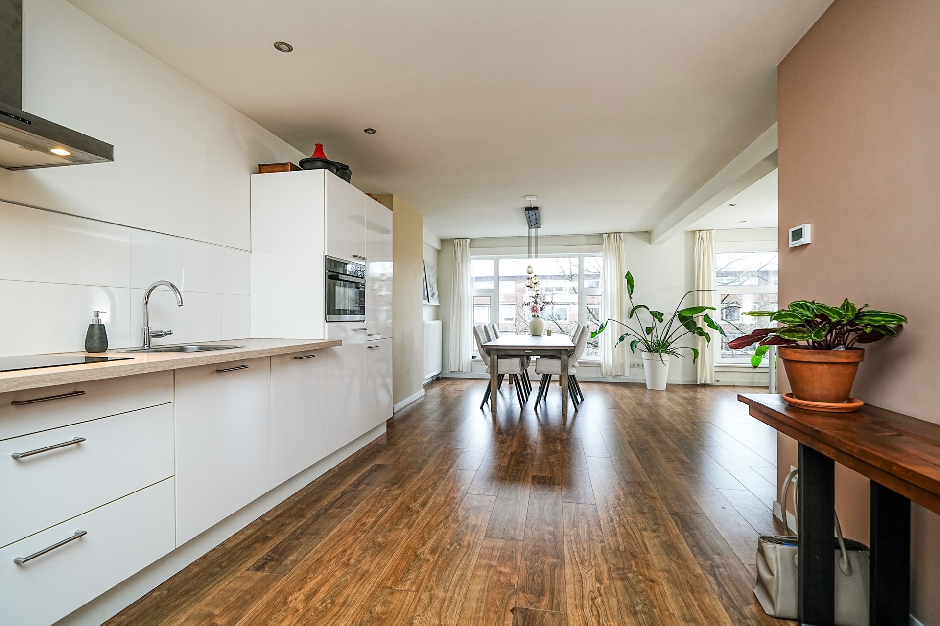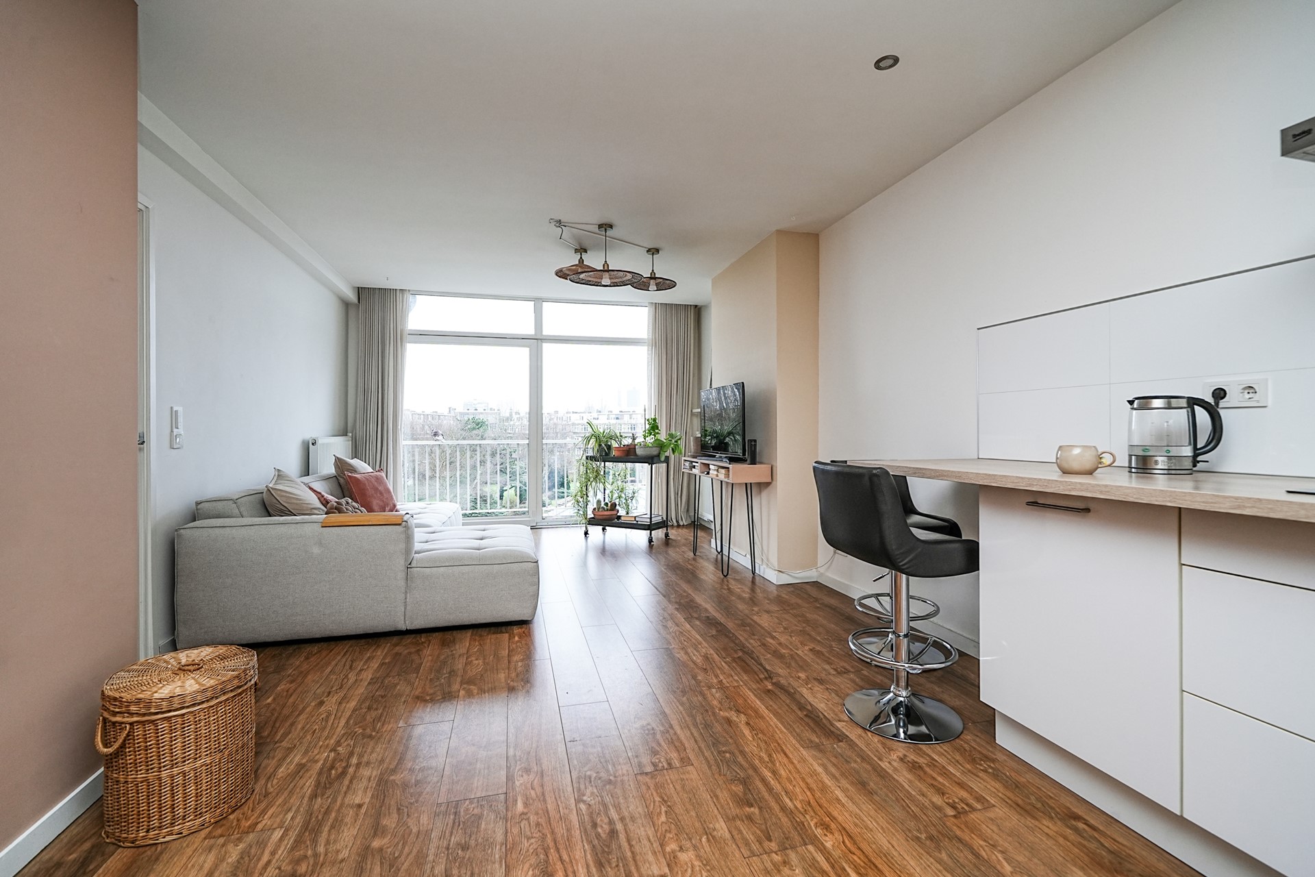 De woonkamer is heerlijk licht dankzij de grote raampartijen en heeft een verrassende, functionele indeling. Aan de voorzijde bevindt zich een gezellige eethoek met ruimte voor een werkplek. Centraal in de ruimte ligt de keuken, terwijl het comfortabele zitgedeelte aan de achterzijde is gesitueerd. Via de schuifpui bereikt u het balkon op het zuidoosten.