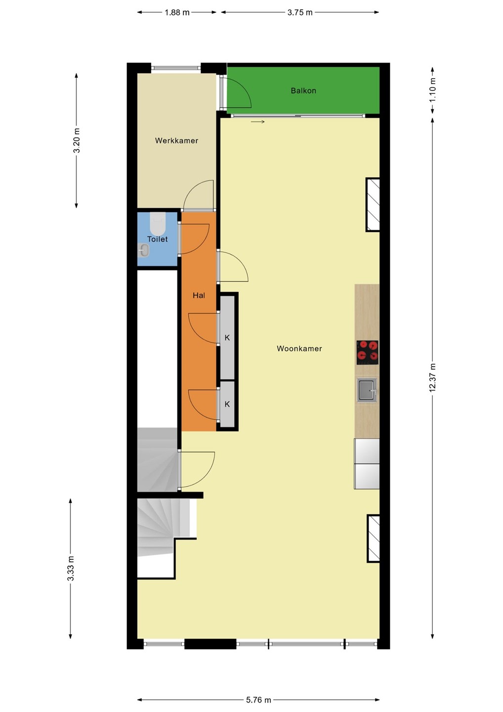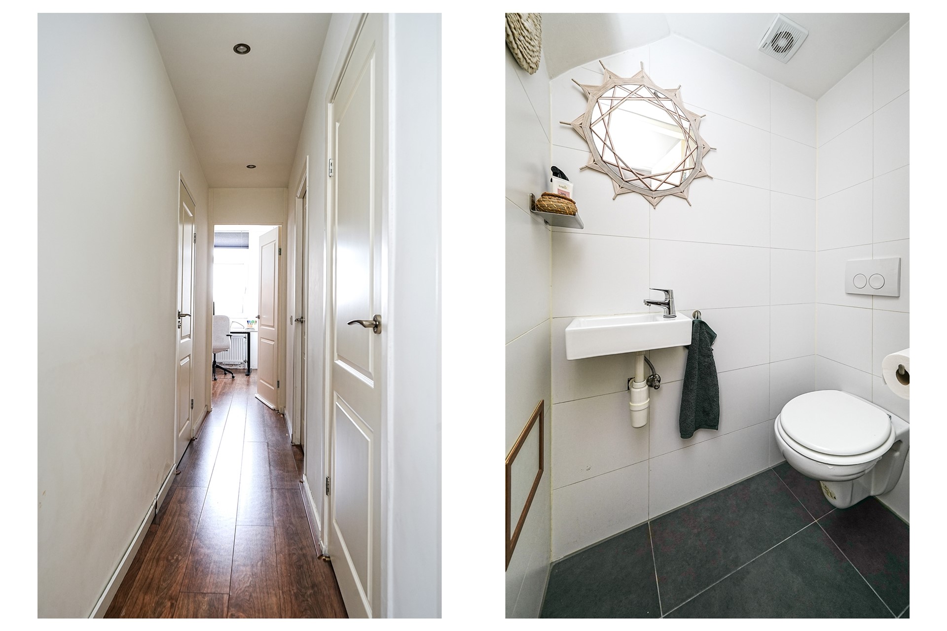 Bij binnenkomst valt direct de royale doorzonwoonkamer op, waar licht en ruimte centraal staan. De open hal en open keuken zorgen voor een speelse en moderne indeling. Vanuit de hal heeft u toegang tot het toilet, een praktische werkkamer en de trap naar de slaapverdieping. Daarnaast beschikt de hal over twee handige inbouwkasten.