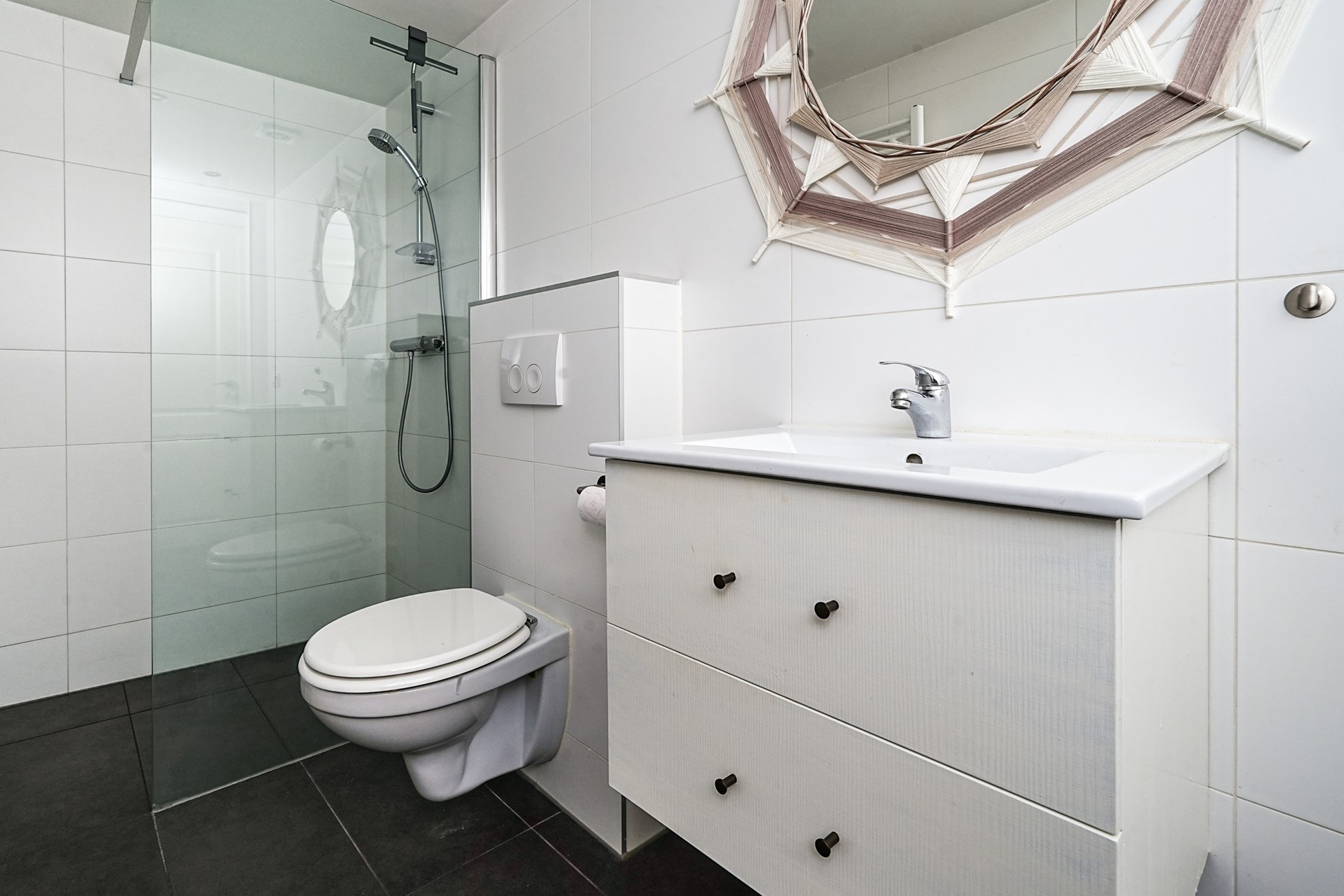 De moderne badkamer is uitgevoerd met grote zwarte vloertegels en witte wandtegels en beschikt over een ruime inloopdouche met thermostaatkraan, een wastafelmeubel, designradiator en een tweede toilet. Via een luik in de badkamer is het platte dak bereikbaar.