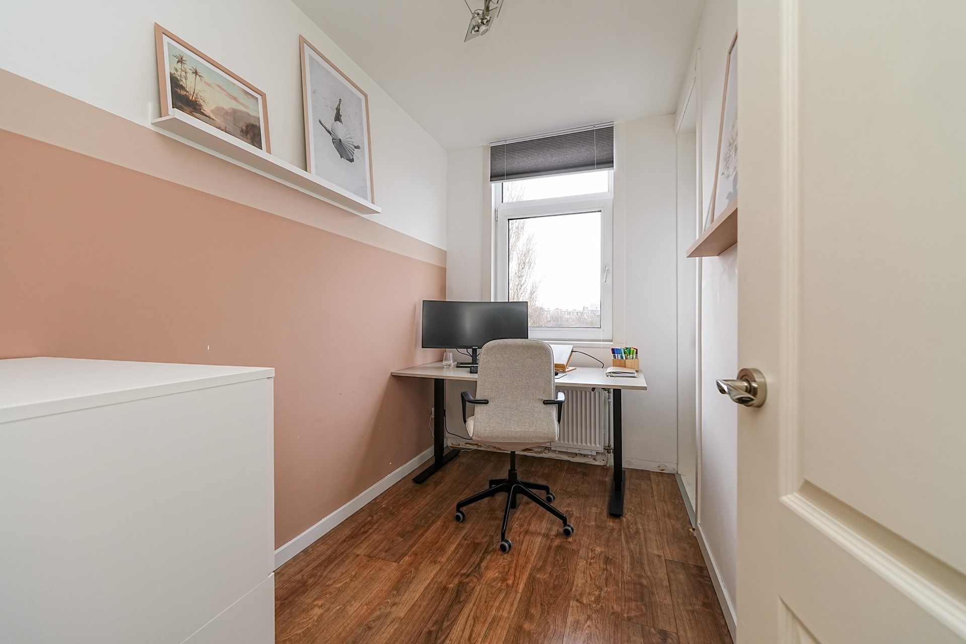 Via de open hal bereikt u de zijkamer, een ideale ruimte voor een logeerkamer, thuiswerkplek of studeerkamer. Deze kamer heeft bovendien een eigen toegang tot het balkon. Het separate toilet is modern uitgevoerd met een hangend closet en fonteintje.