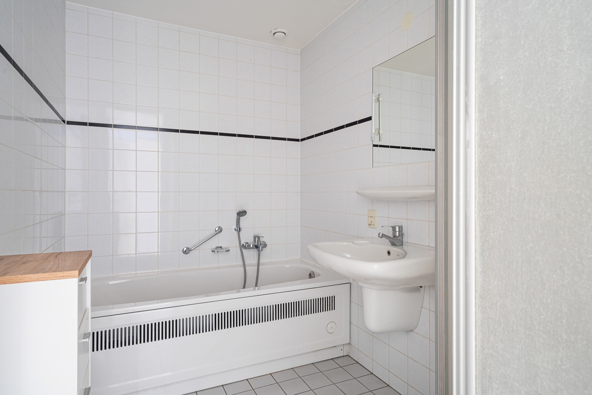The bathroom is functionally designed and finished with white wall tiles and light gray floor tiles. It is equipped with a shower with a glass partition, a sink with mirror, and a bathtub. The separate toilet is located in the hallway.