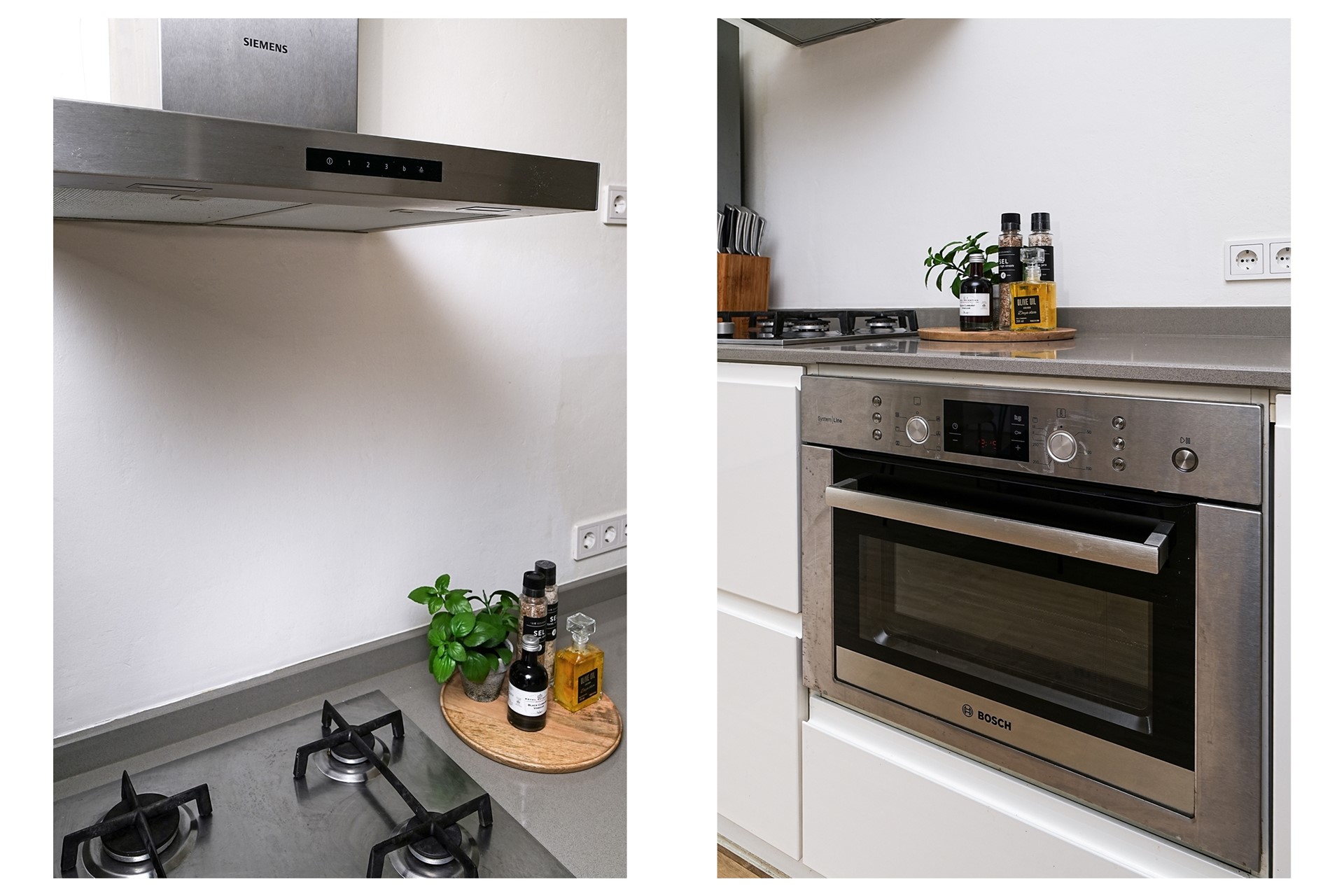 De open keuken aan de voorzijde is stijlvol uitgevoerd in hoogglans wit met een lichtgrijs werkblad en van alle gemakken voorzien, perfect voor lange avonden koken en gezellig tafelen.