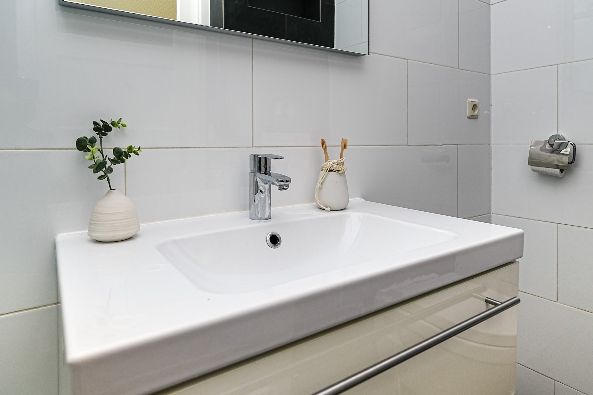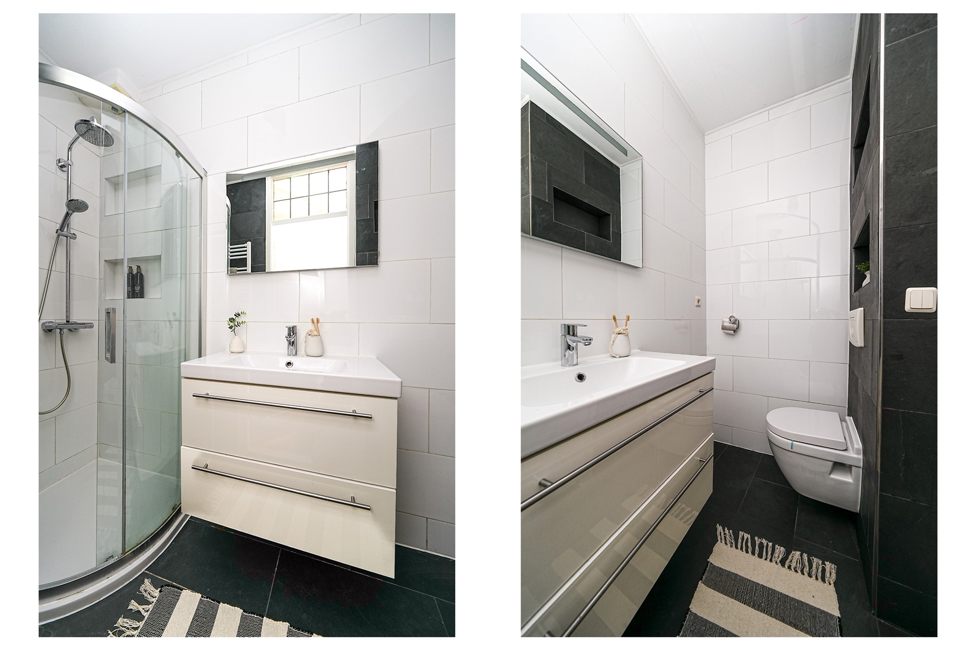 De badkamer is praktisch ingedeeld en voorzien van een douchehoek, toilet en een wastafelmeubel met lades. De wanden zijn volledig betegeld met witte wandtegels en de vloertegels zijn antraciet.