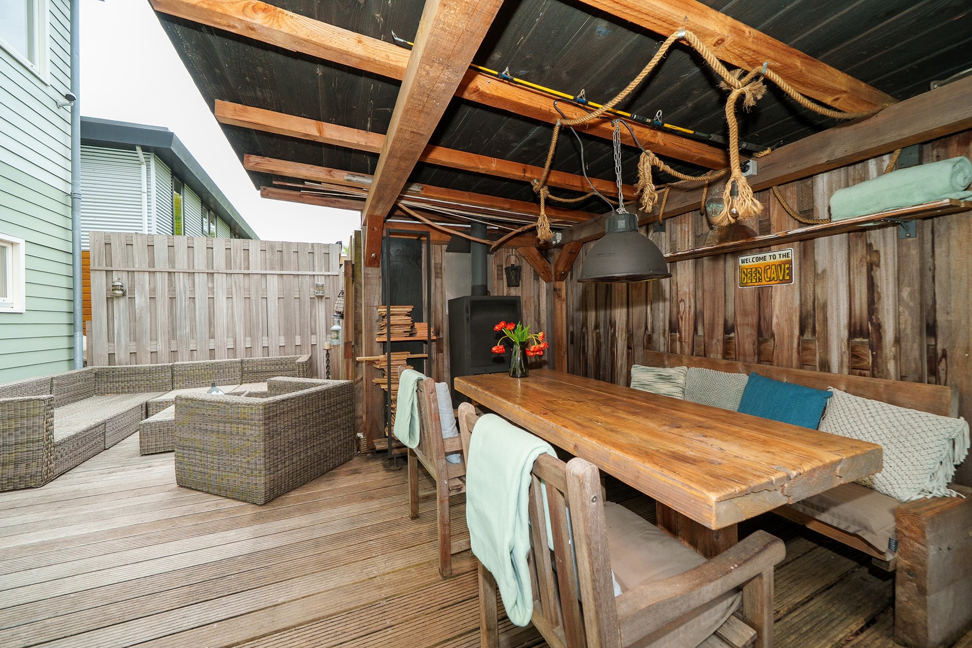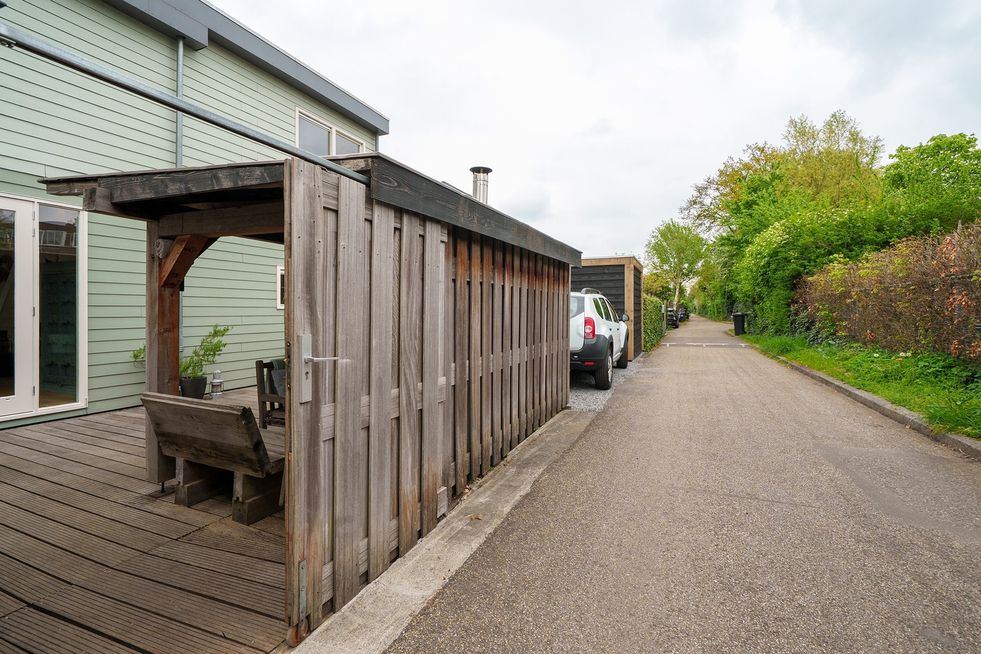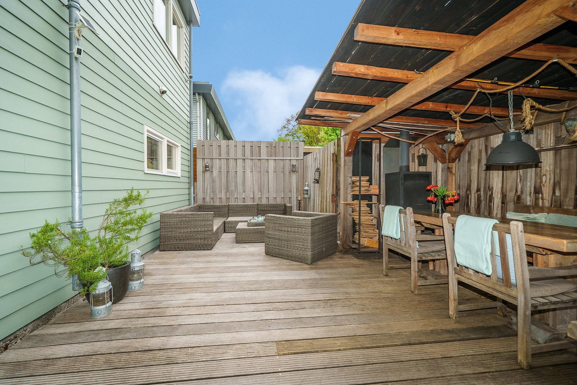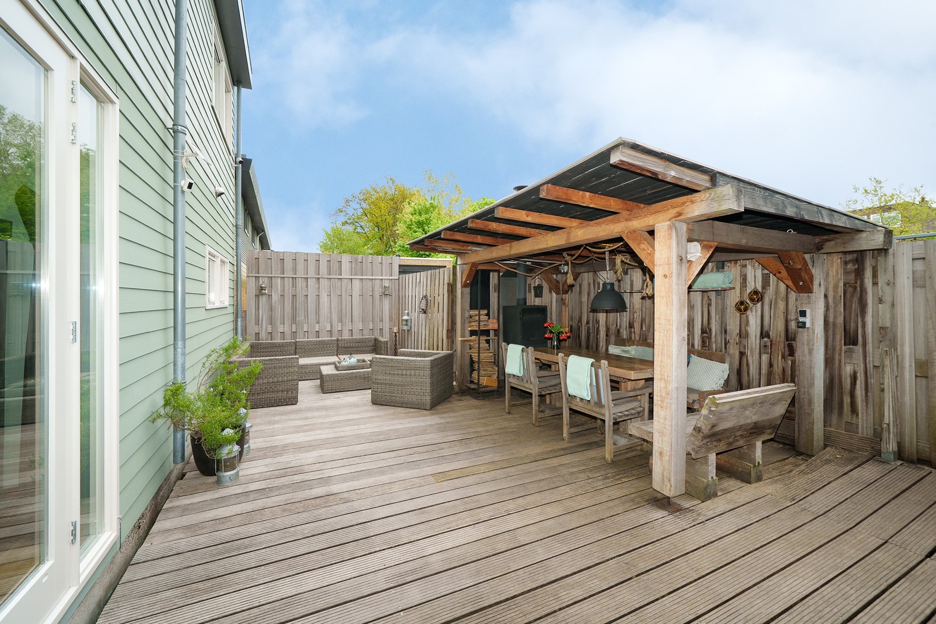 Aan de voorzijde beschikt de woonark over een verzorgde tuin met een mooie overkapping. De overkapping is voorzien van een houtkachel, waardoor het een heerlijke plek is om in elk seizoen te kunnen genieten van het buiten zijn. De tuin is netjes verzorgd, heeft een hardhouten terras en een schuur voor het neerzetten van fietsen of tuinspullen.