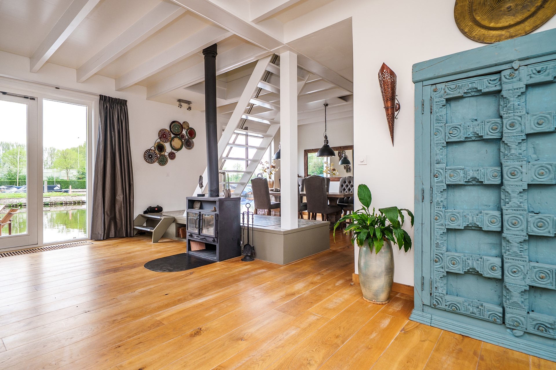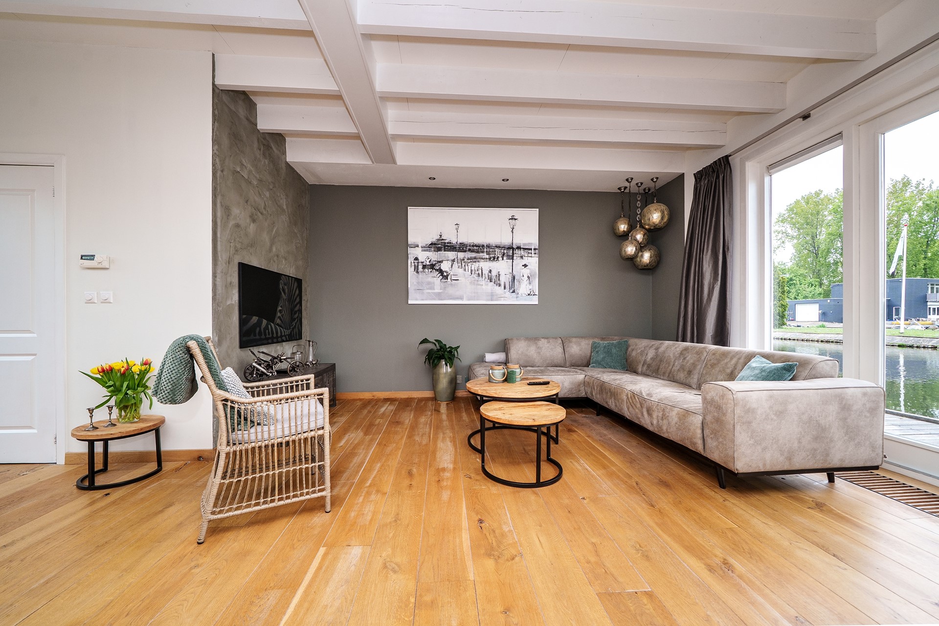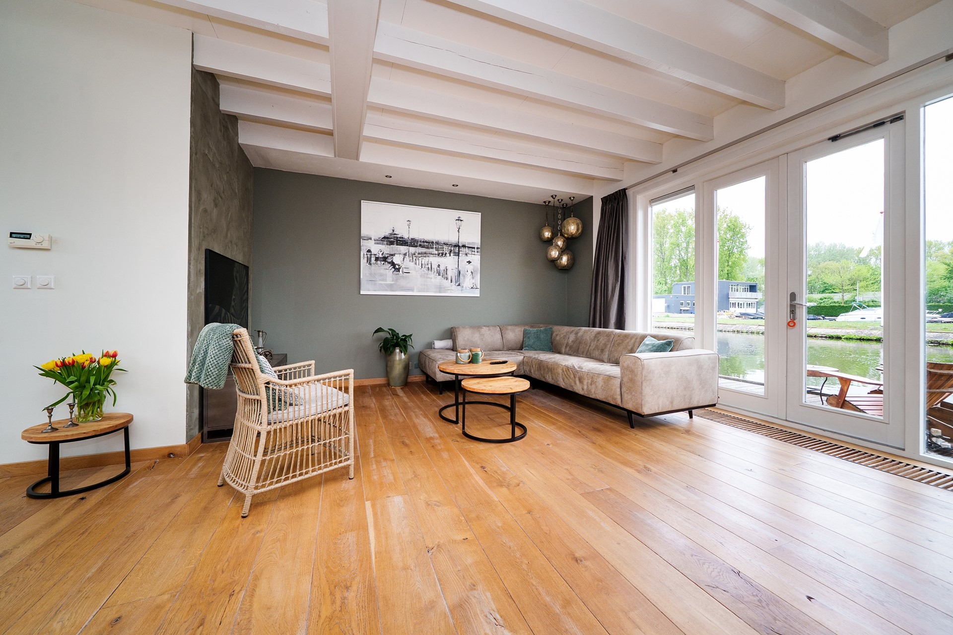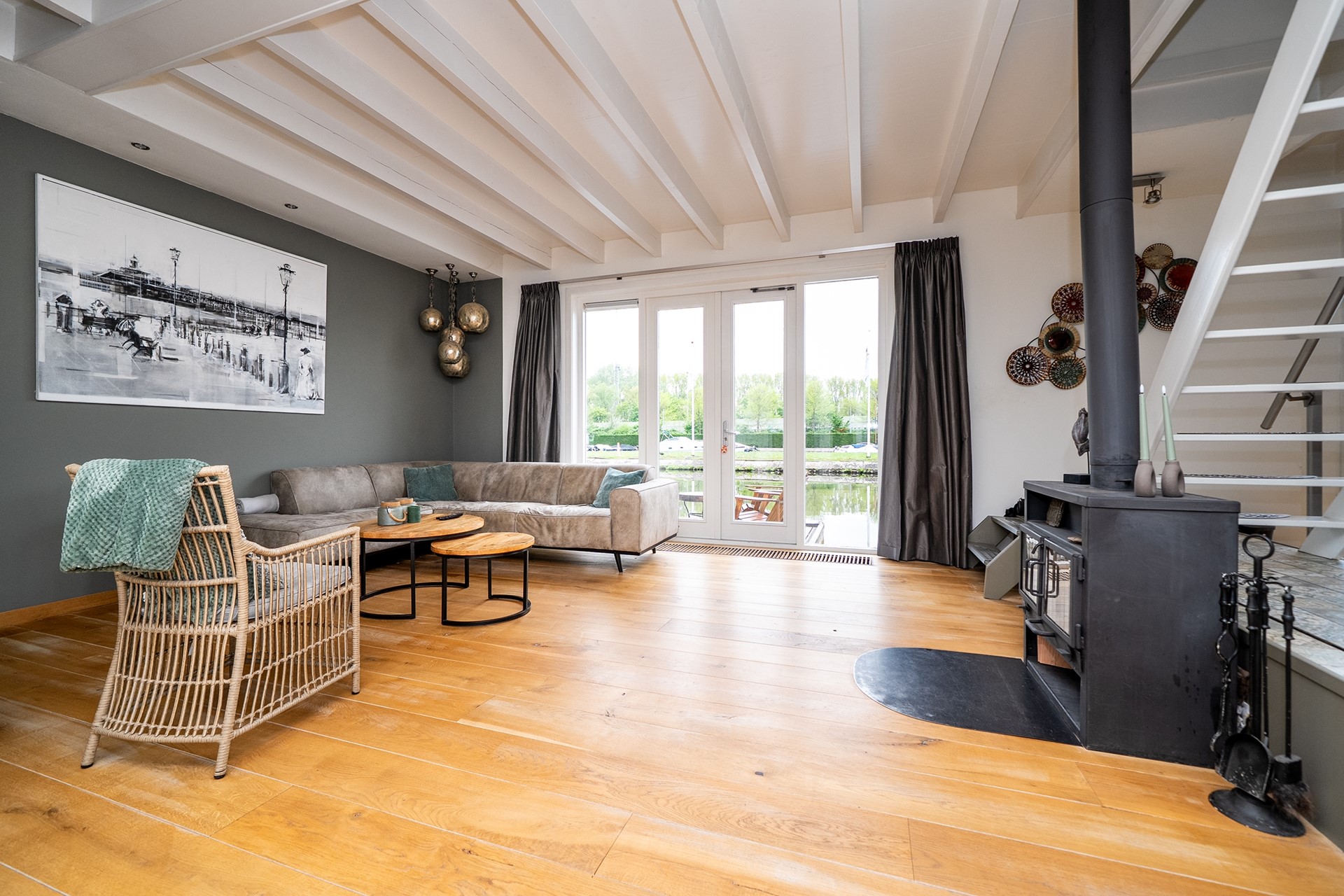 Ruime woonkamer met mooi uitzicht op het vaarwater en richting de jachthaven aan de overkant. Aan beide zijden zijn er openslaande deuren. De woonkamer heeft een mooie houten vloer die is doorgelegd over de gehele woonlaag. De wanden hebben een strakke afwerking, wat mooi combineert met het houten balken plafond. De inbouwspots zorgen voor extra sfeer. De woonkamer beschikt over een houtkachel die zorgt voor warmte, sfeer en gezelligheid.