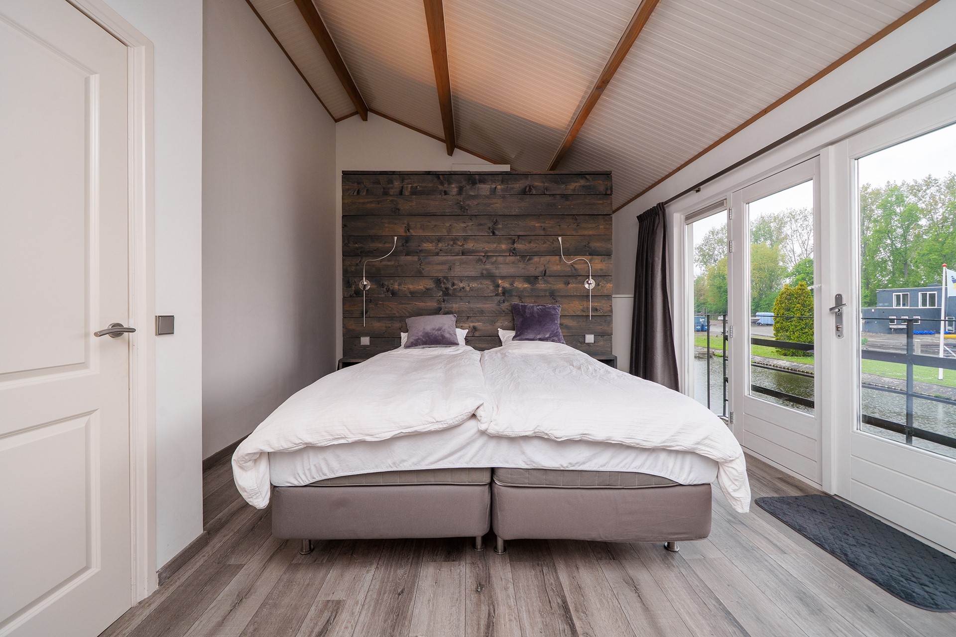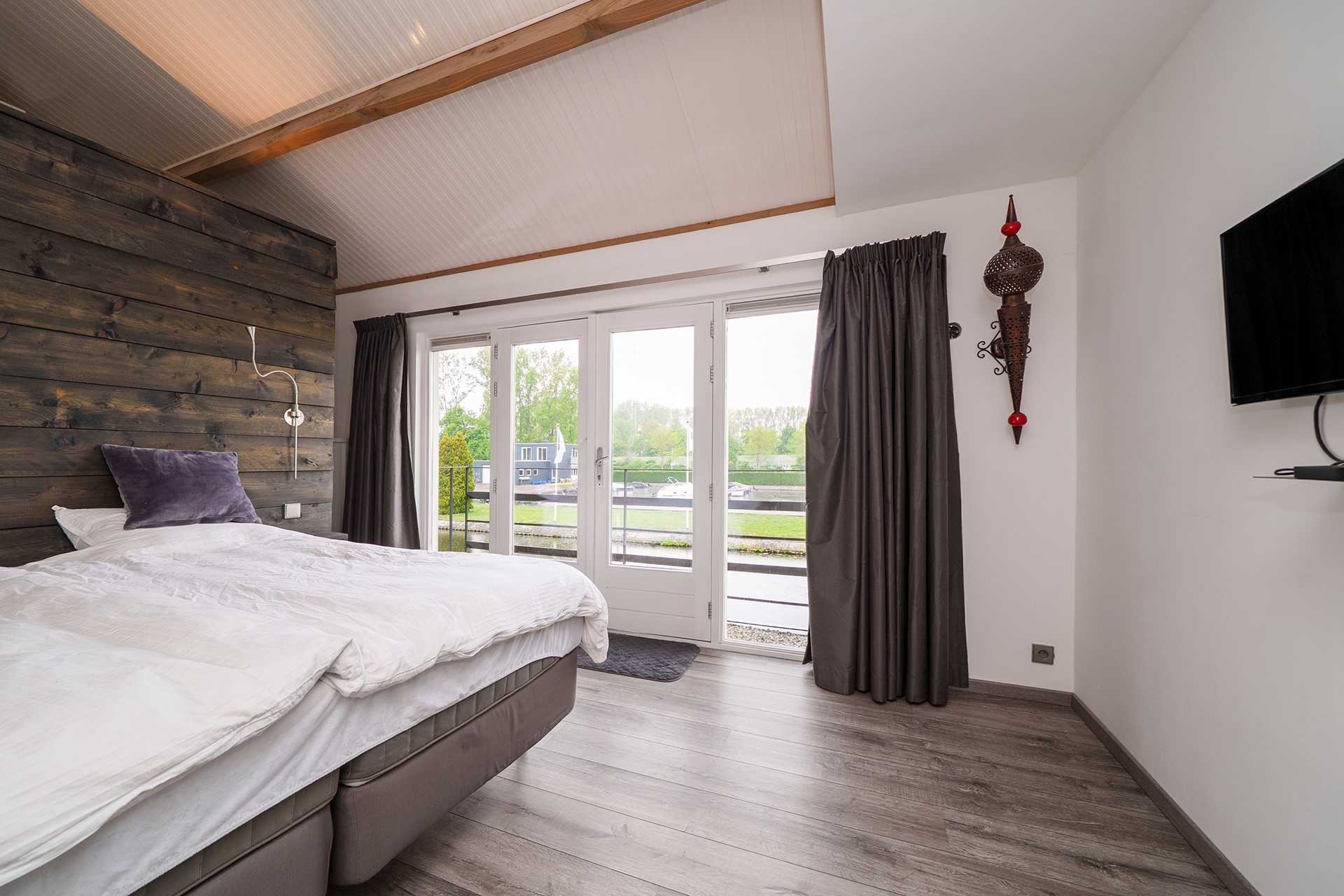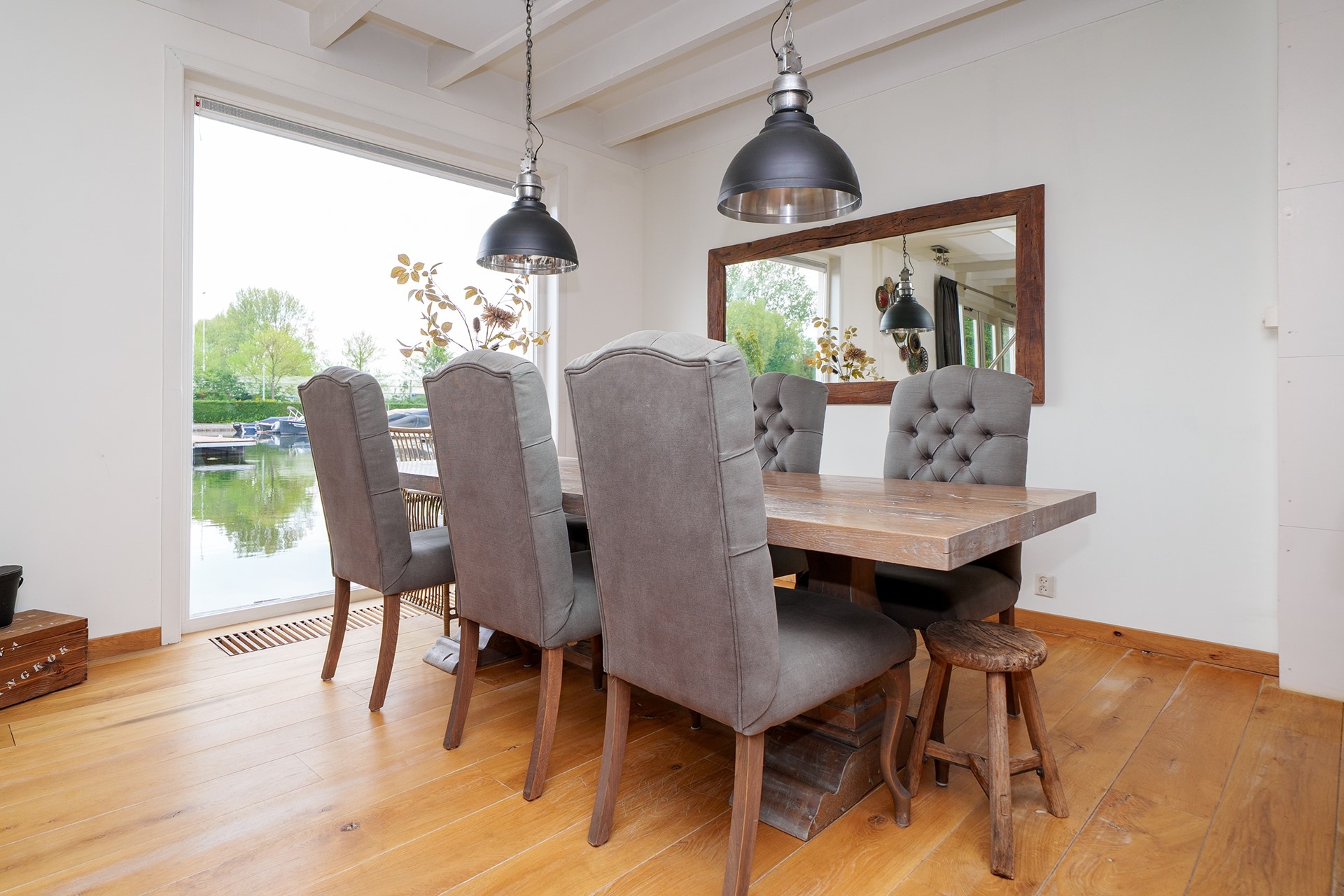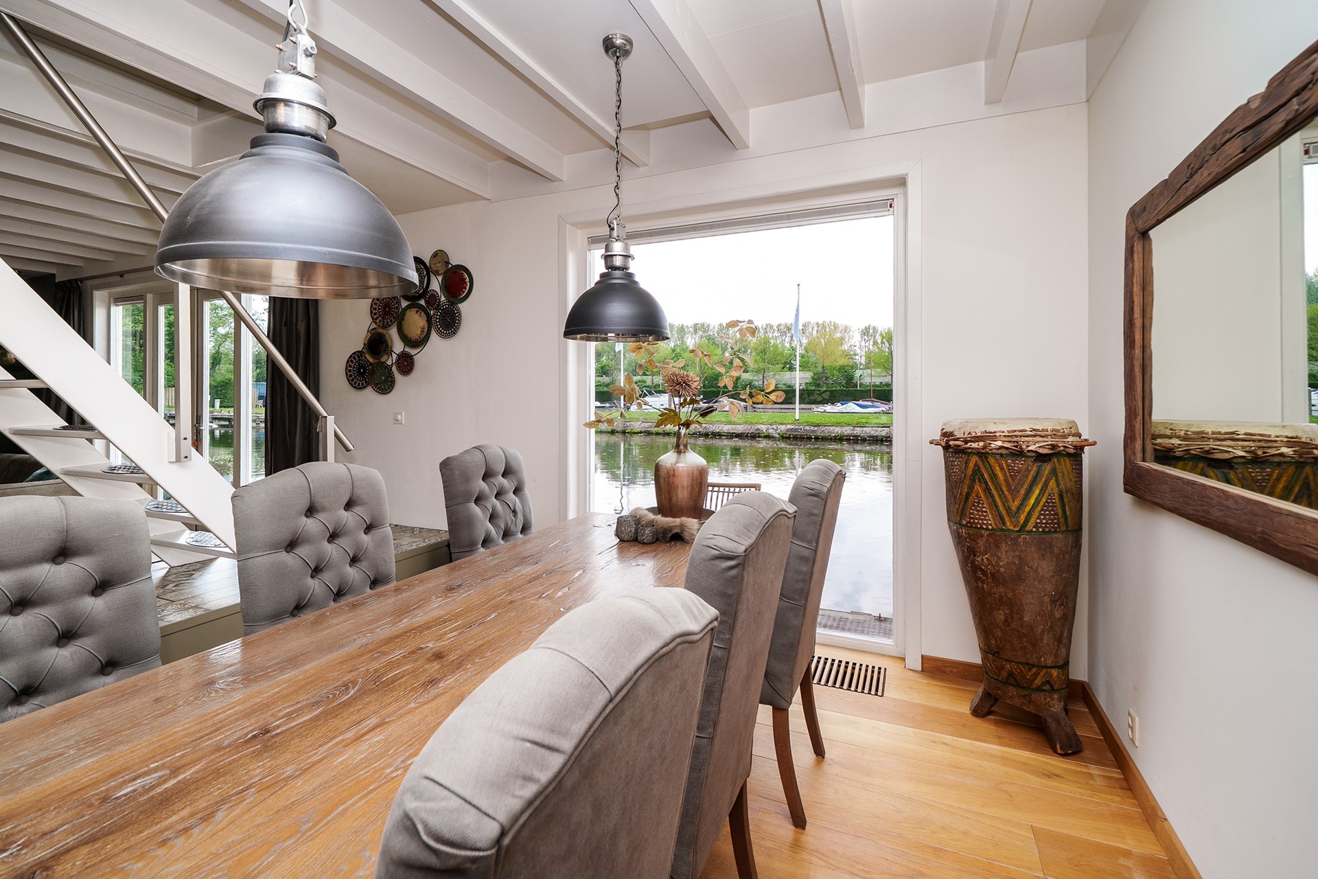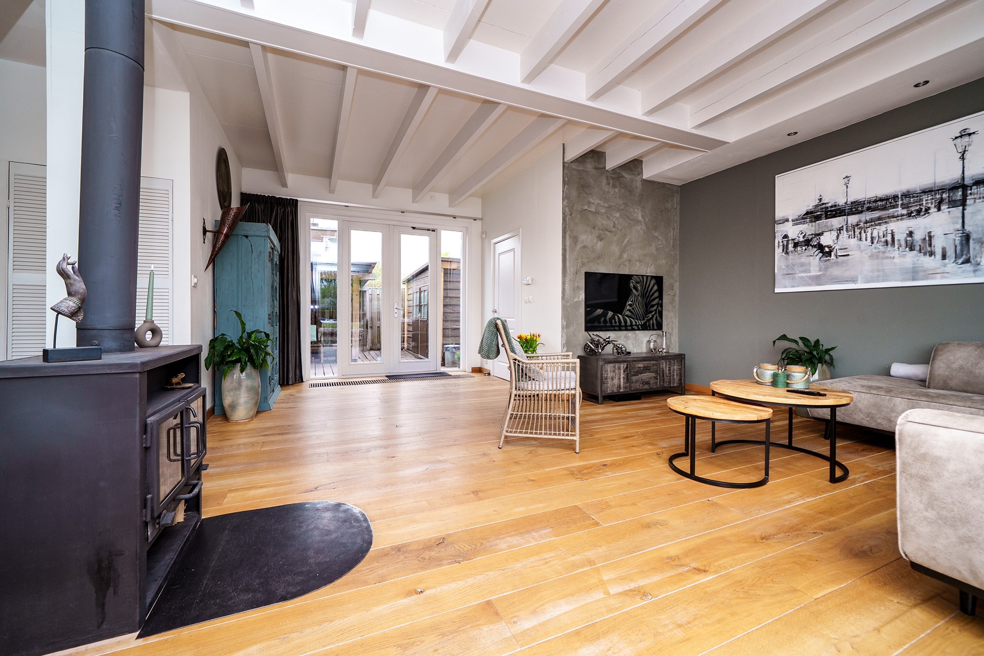 Ruime woonkamer met mooi uitzicht op het vaarwater en richting de jachthaven aan de overkant. Aan beide zijden zijn er openslaande deuren. De woonkamer heeft een mooie houten vloer die is doorgelegd over de gehele woonlaag. De wanden hebben een strakke afwerking, wat mooi combineert met het houten balken plafond. De inbouwspots zorgen voor extra sfeer. De woonkamer beschikt over een houtkachel die zorgt voor warmte, sfeer en gezelligheid.