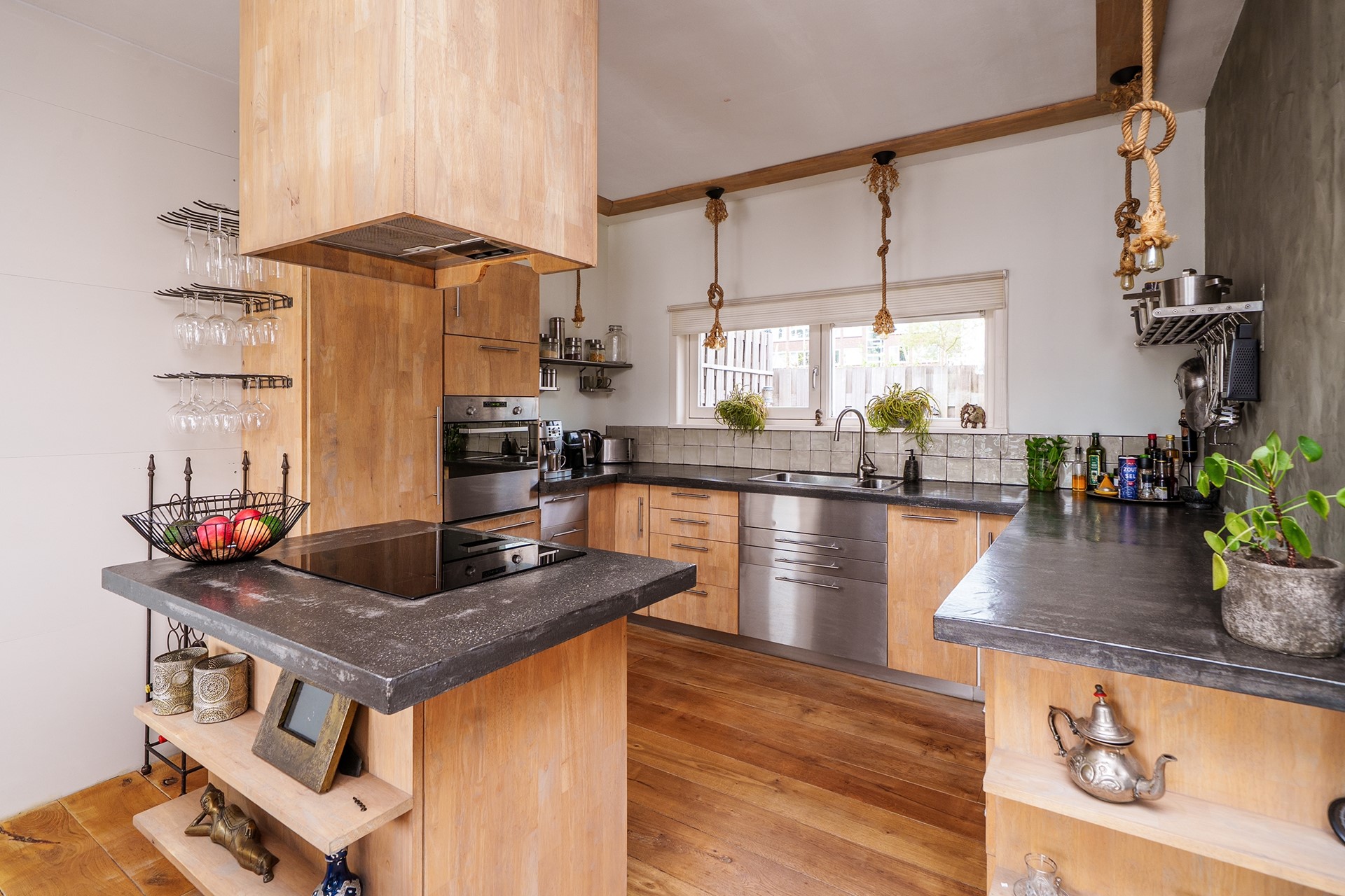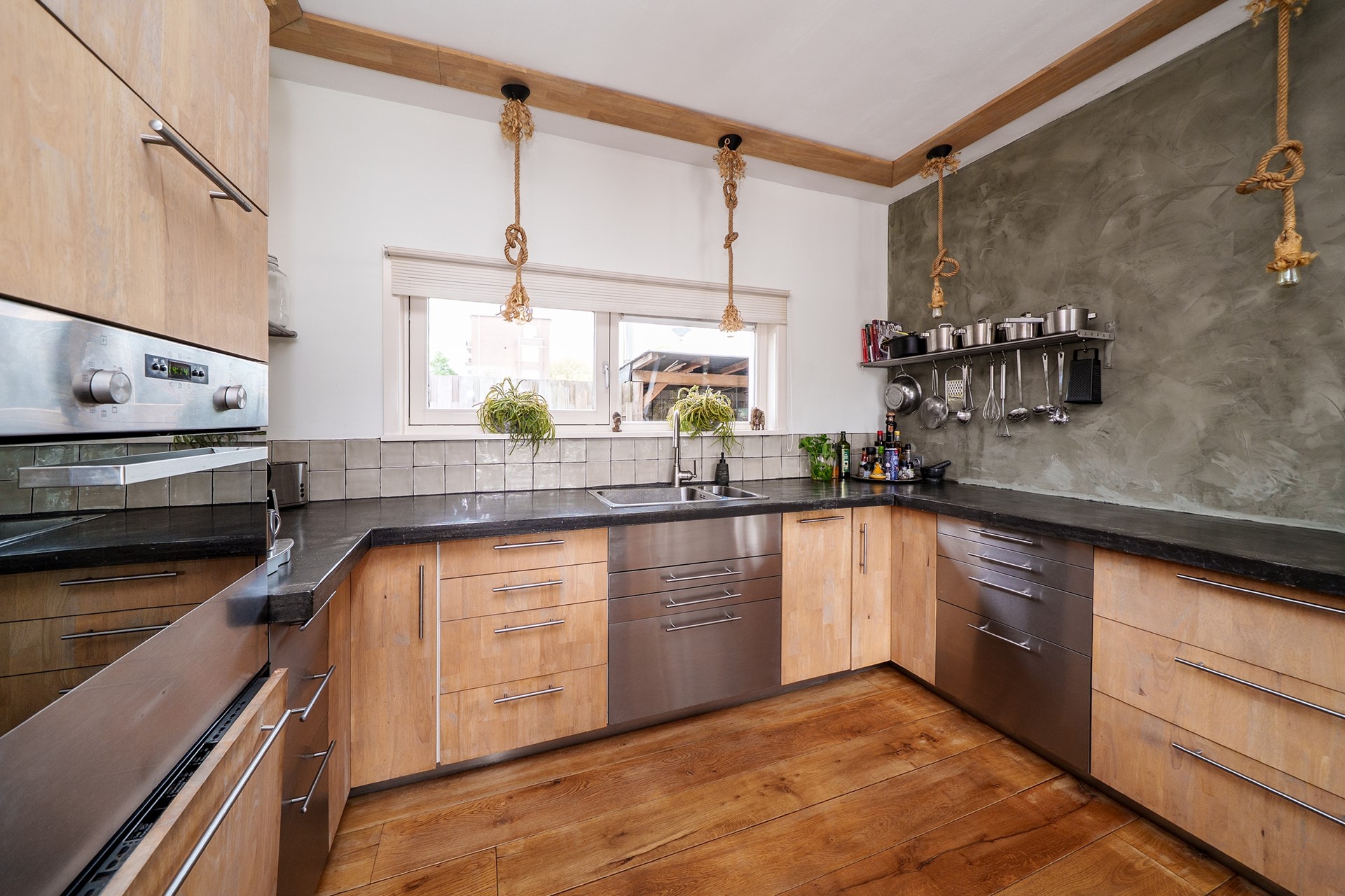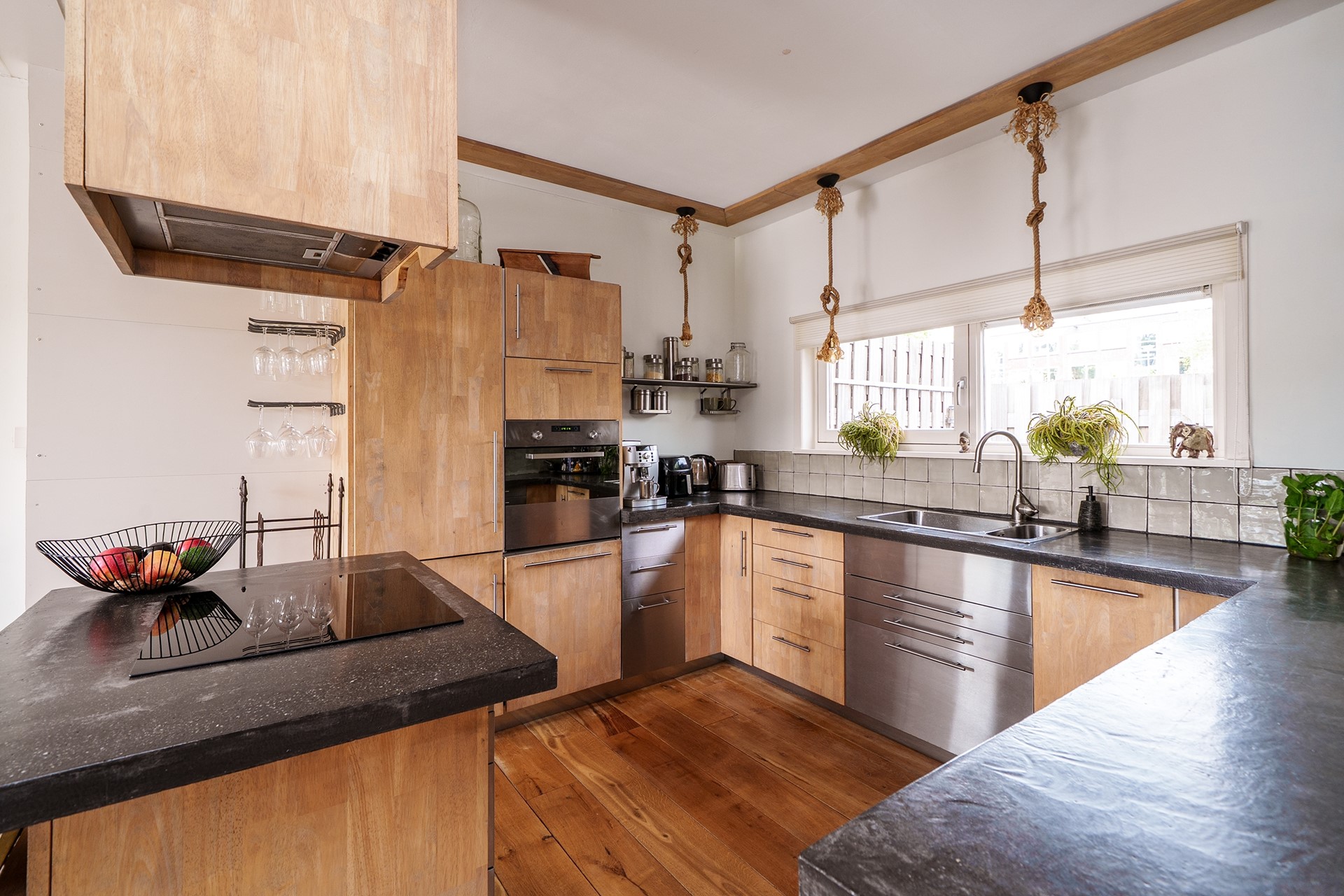 De keuken is luxe en van alle gemakken voorzien. Hout gecombineerd met RVS zorgt ervoor dat de keuken een warme, maar moderne uitstraling heeft. Het kookeiland beschikt over een inductiekookplaat met daarboven een mooi weggewerkte afzuigkap. De U-vorm beschikt over een combioven, vaatwasser, dubbele wastafel en voldoende opbergruimte. De ramen aan de voorzijde geven zicht op de voortuin . Het raam aan de achterzijde heeft het glasoppervlak tot aan de vloer, wat zorgt voor een mooie verbinding met het water.