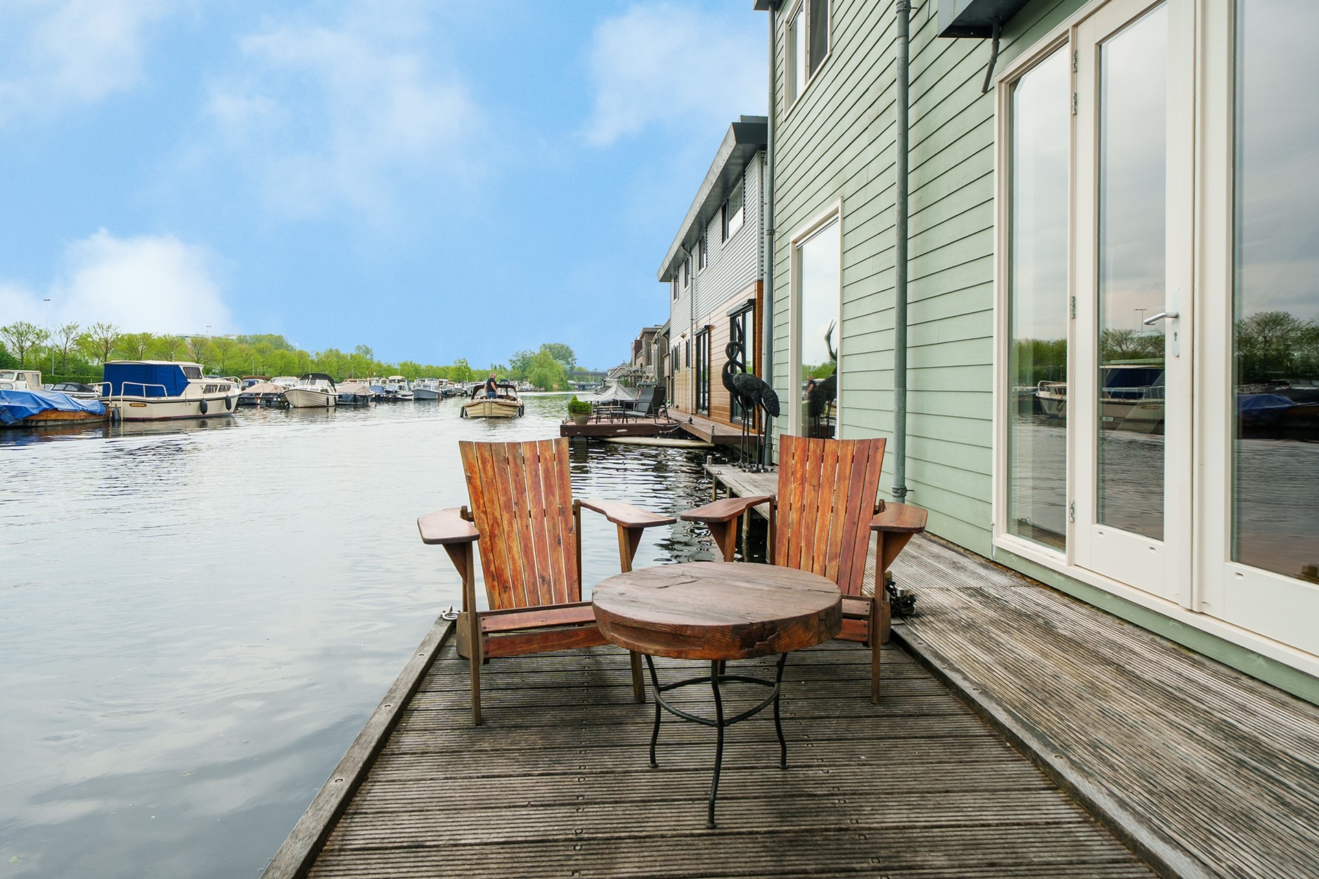 De houten vlonders zijn doorgelegd tot aan de achterzijde van de woonark. Dit terras is een fijne plek direct aan het water, waar je in alle privacy kunt genieten van de zon, het kabbelende water en voorbijvarende bootjes. Aan de aanlegsteiger is het mogelijk om je eigen boot aan te leggen. Vanuit het Gordelpad zijn mooie routes te varen.