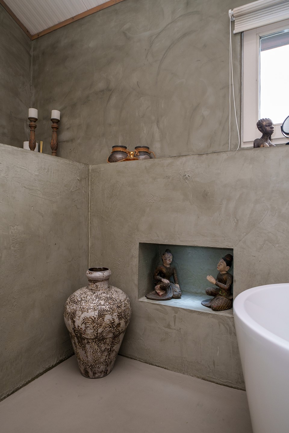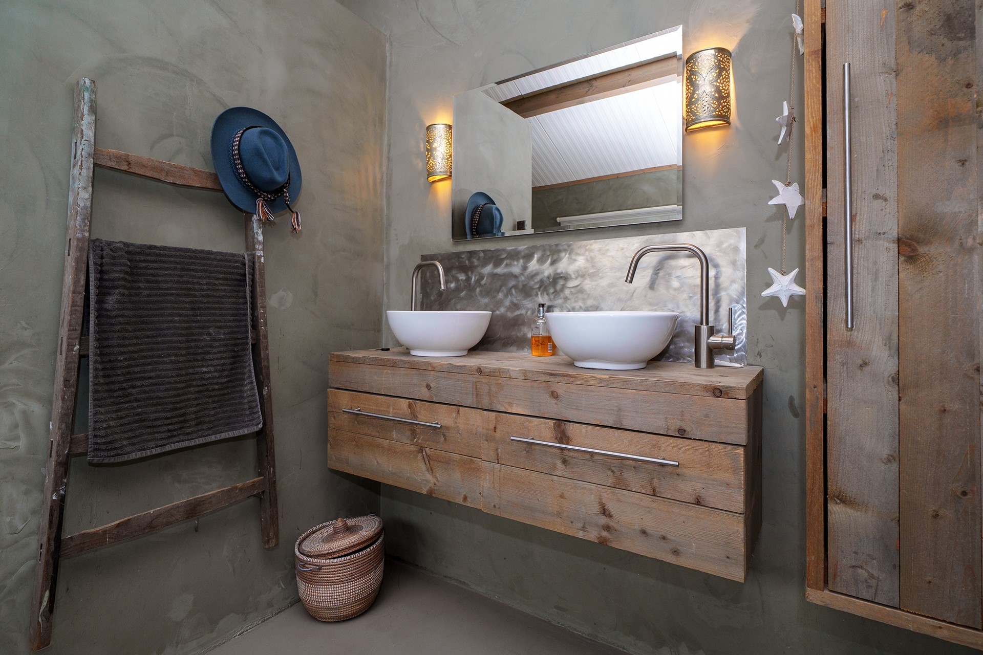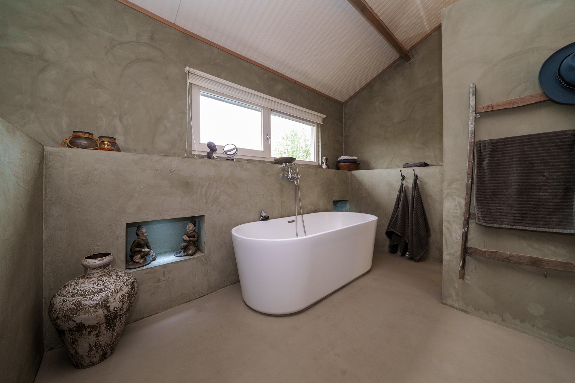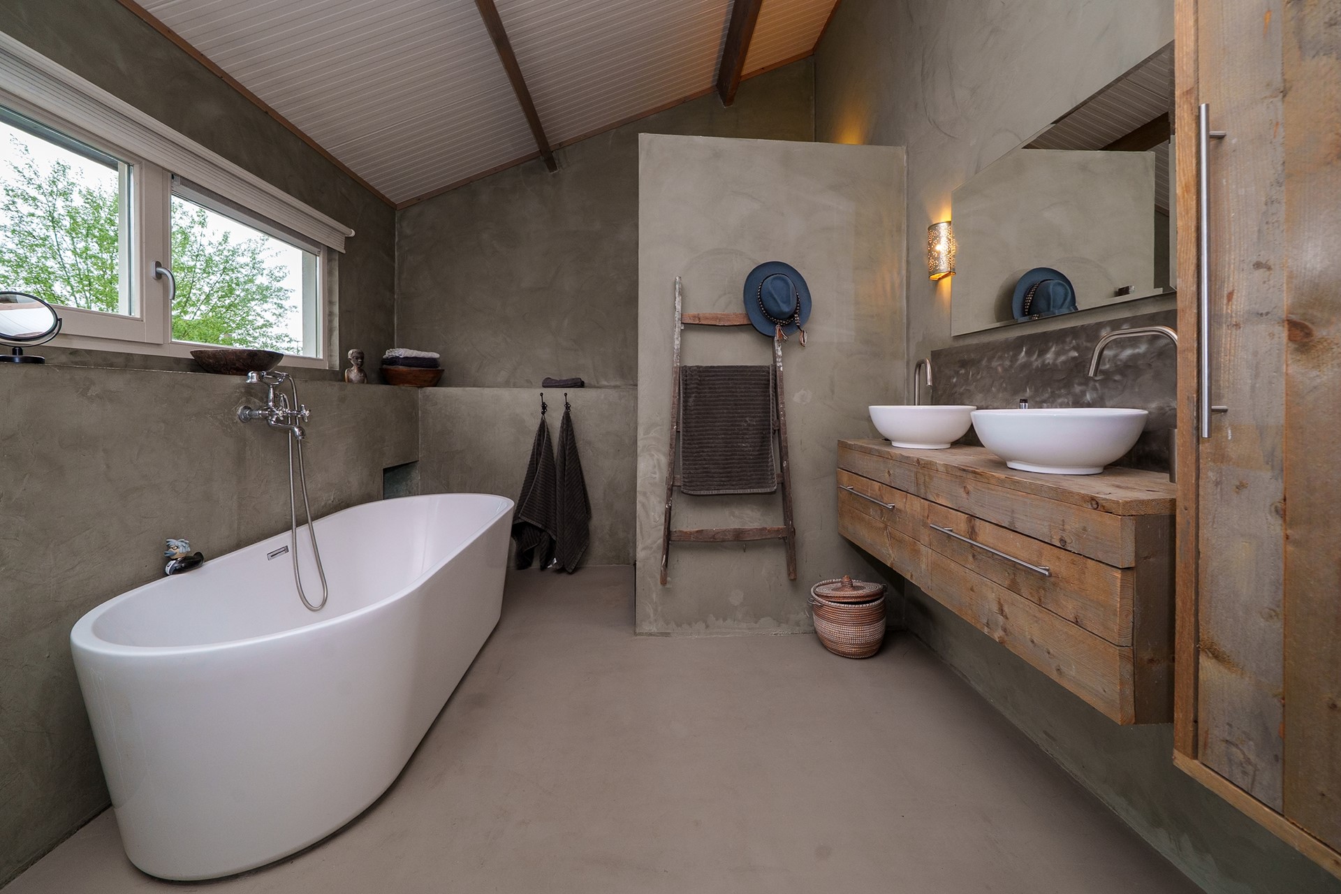 De luxe afgewerkte badkamer is voorzien van alle moderne gemakken en biedt een oase van comfort en ontspanning. Zo beschikt de badkamer over een losstaand ligbad, een wastafelmeubel met twee waskommen en een inloopdouche. Er zijn twee nissen met inbouwspots voor het neerzetten van bijvoorbeeld mooie kunstobjecten. Een badkamer met een heus Spa-gevoel.
