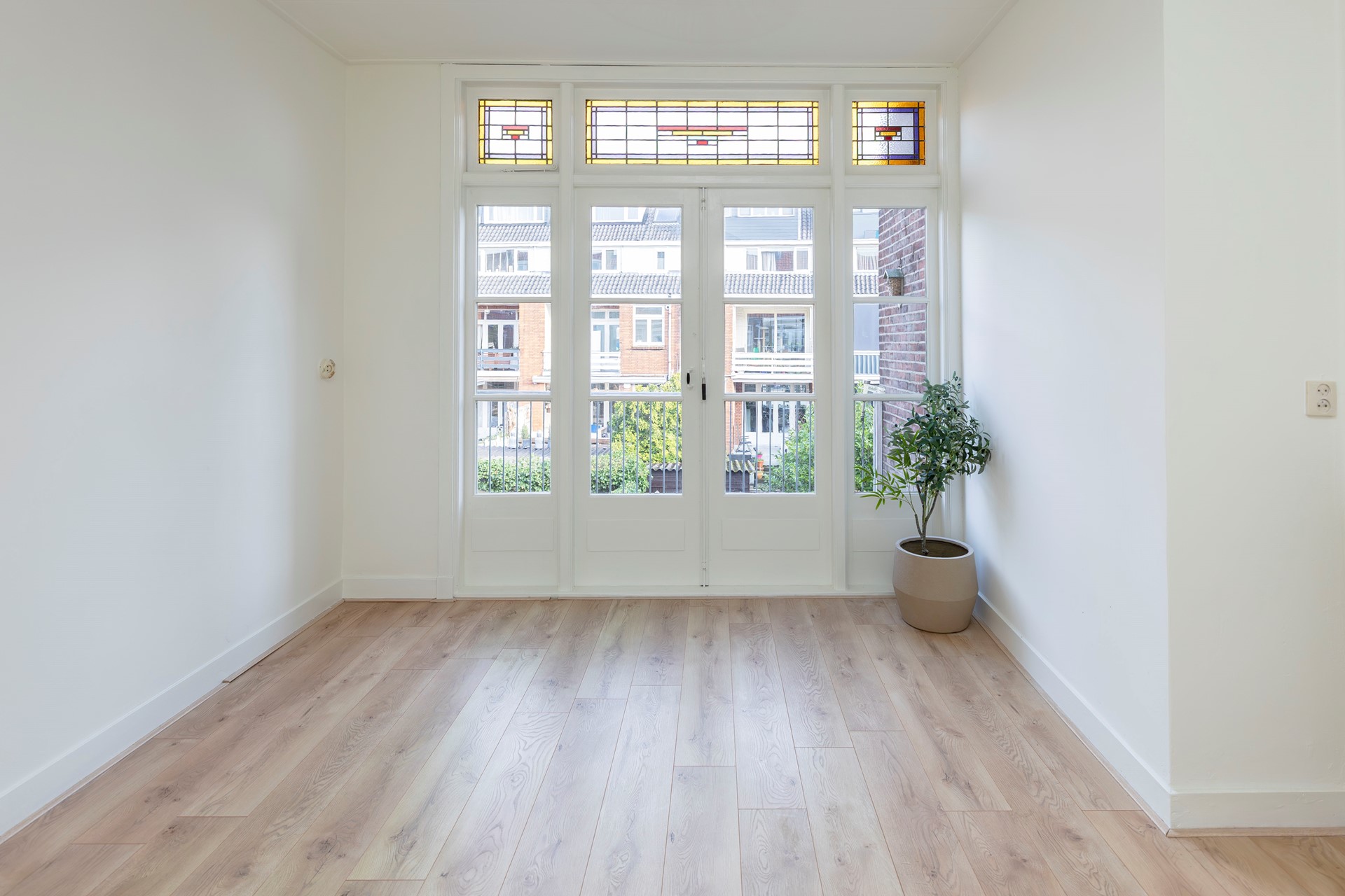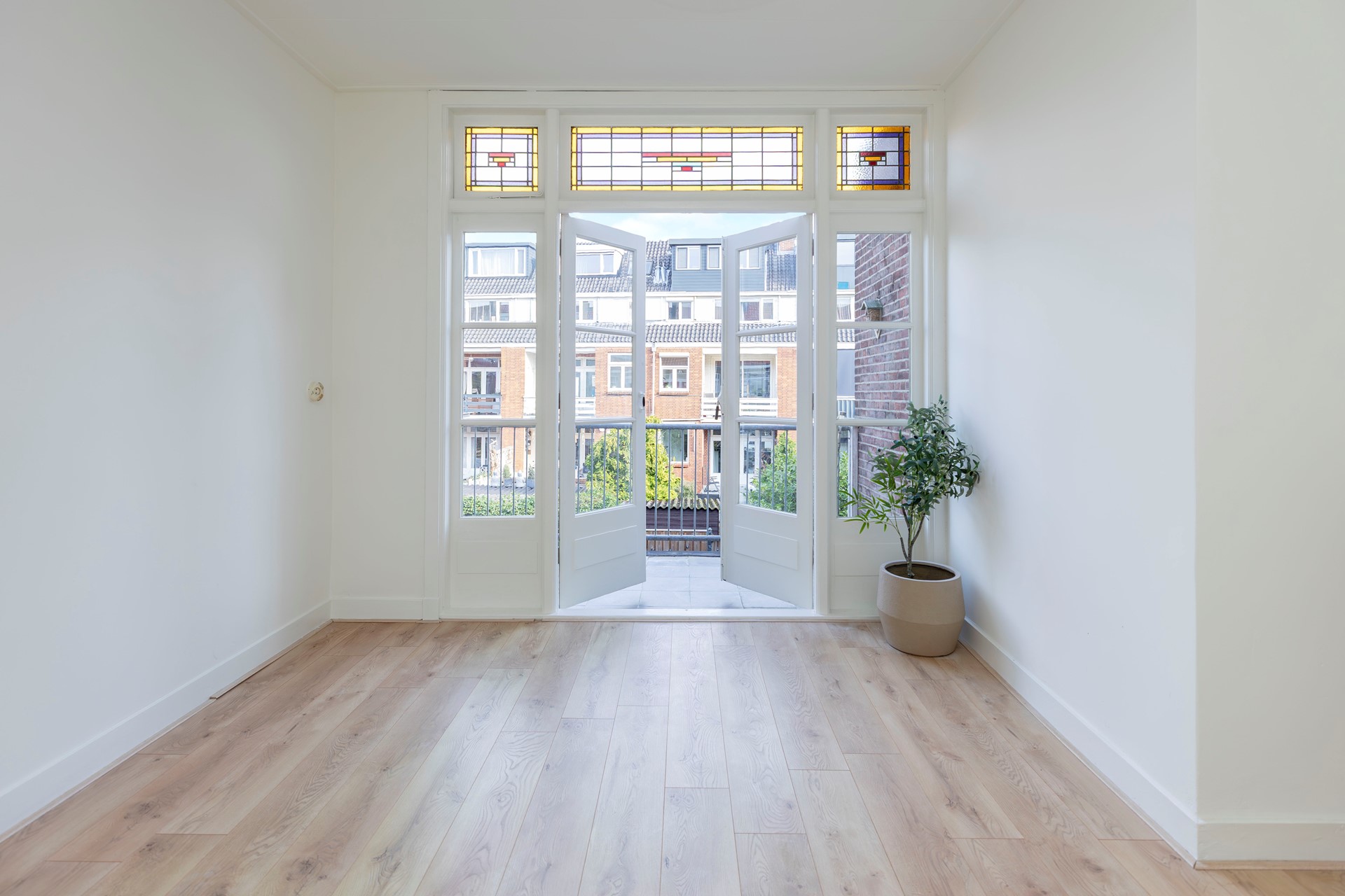 De achterkamer is een echte verrassing. Via klassieke openslaande deuren met glas-in-loodbovenramen stap je zo het beschutte terras op. Hier geniet je al vroeg in het seizoen van de ochtendzon met een kop koffie. Deze ruimte is veelzijdig: kies je voor een aparte eetkamer en zitkamer, een werkkamer, of misschien zelfs een extra slaapkamer? De mogelijkheden zijn er.
