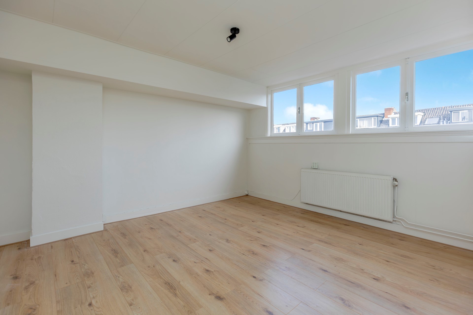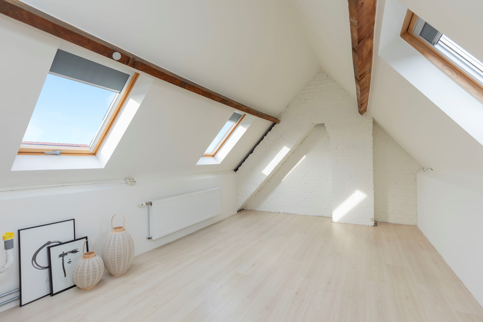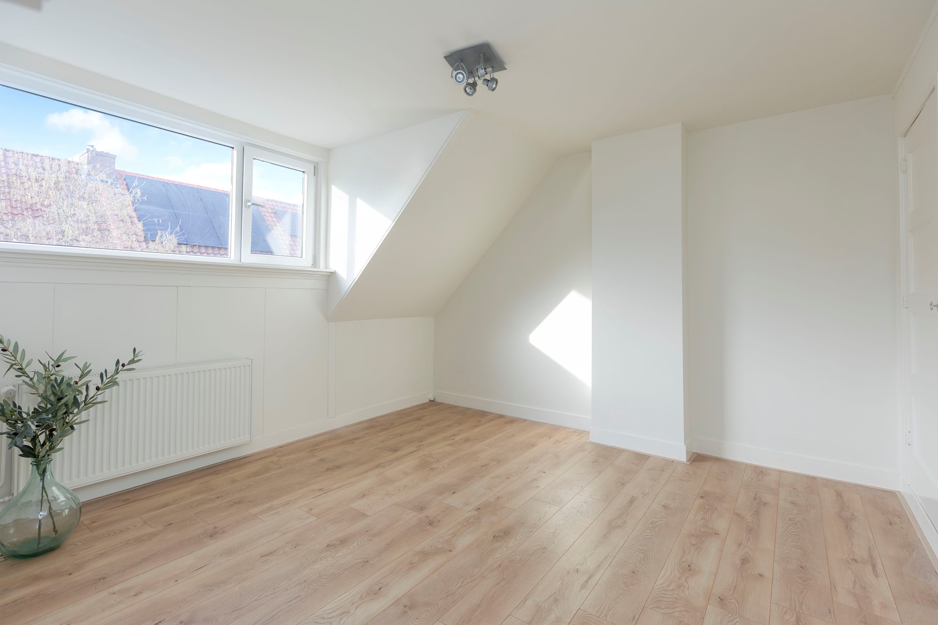 De zolderkamer is ronduit fantastisch. Dankzij drie grote dakramen is dit een heerlijk lichte ruimte. De wanden zijn strak gestukt en er is een laminaatvloer. Een ideale extra slaapkamer, studio, werkruimte of speelkamer.