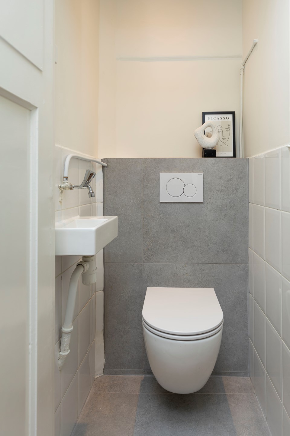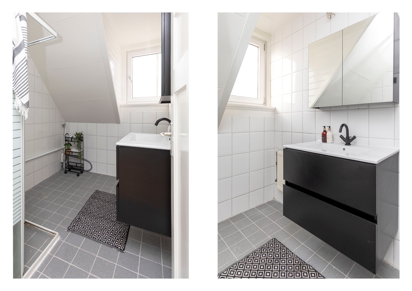 De badkamer ligt aan de voorzijde en is verzorgd uitgevoerd met witte wandtegels, grijze vloertegels, een douchehoek en een wastafelmeubel.