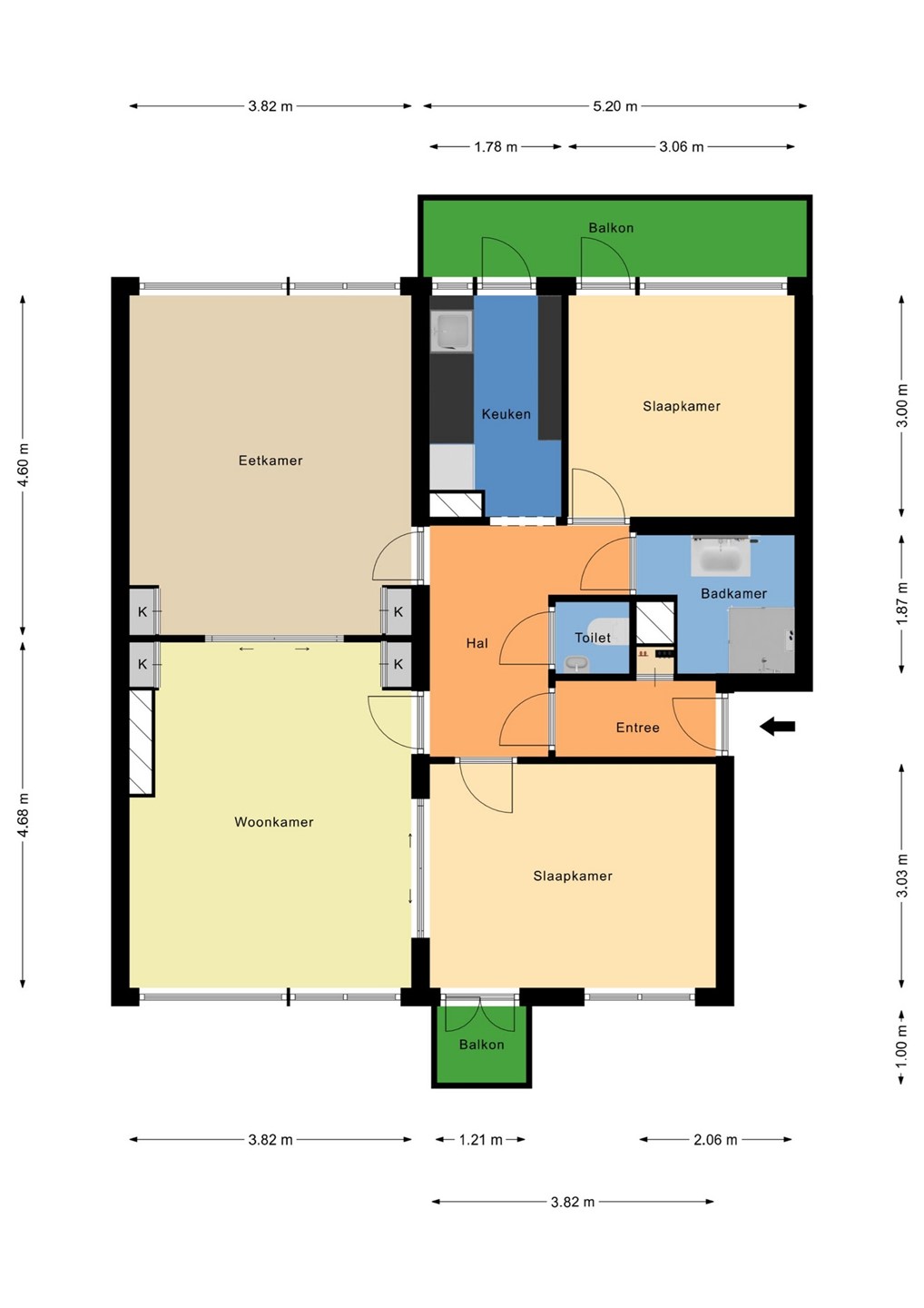 De woning beschikt over twee slaapkamers, beide netjes afgewerkt. De slaapkamer aan de voorzijde heeft toegang tot een balkon op het noordoosten. De slaapkamer aan de achterzijde biedt directe toegang tot het ruime balkon aan de achterzijde.