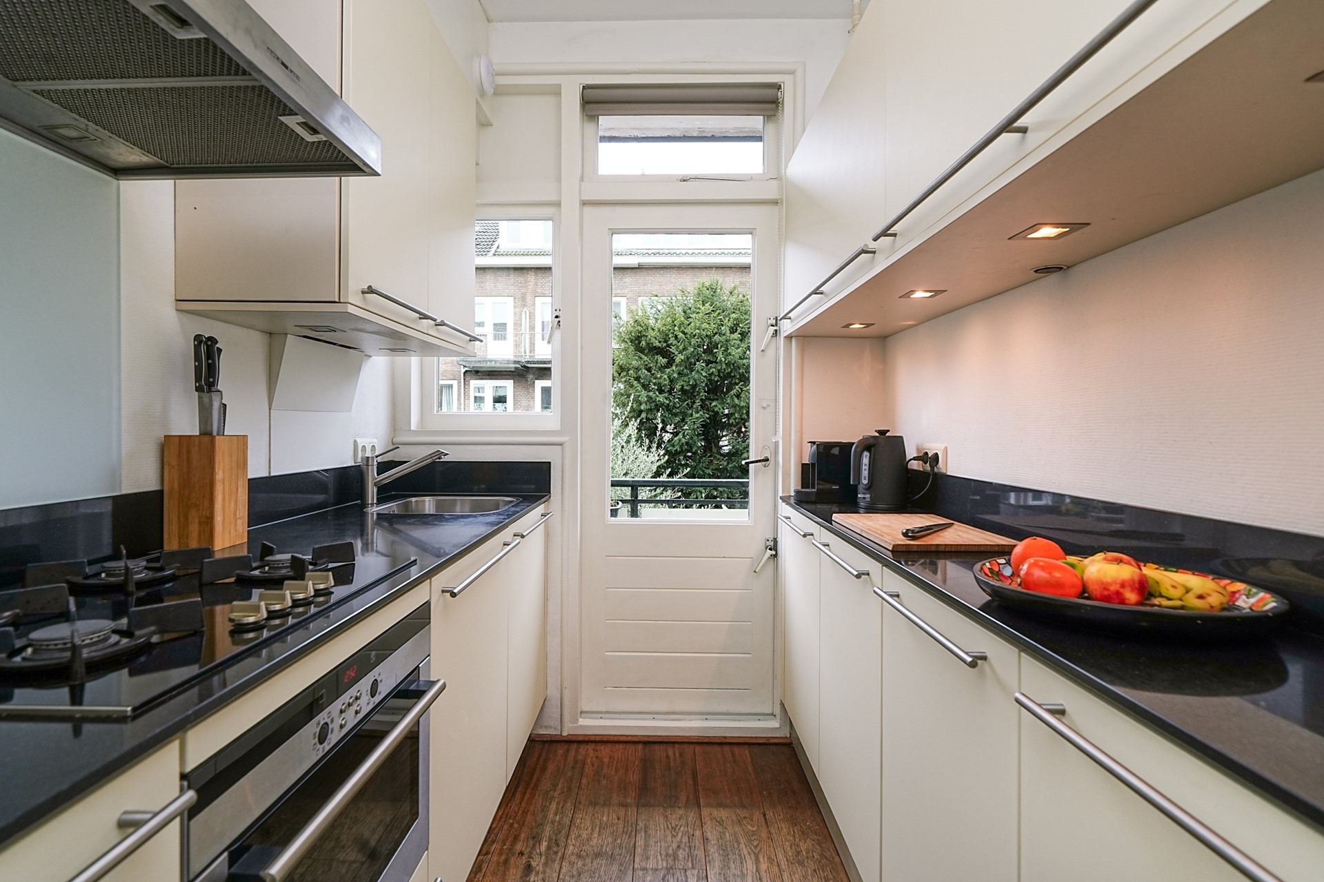 De moderne keuken, eveneens aan de achterzijde, is van alle gemakken voorzien: een koelkast, vriezer, vaatwasser, oven en 4-pits gasfornuis. De combinatie van boven- en onderkasten, sfeervolle inbouwspots en een hoogglans zwart natuurstenen werkblad maakt dit een heerlijke plek om te koken. Vanuit de keuken stap je zo het zonnige balkon op het zuidwesten op, waar je van de middag tot laat in de avond van de zon kunt genieten.