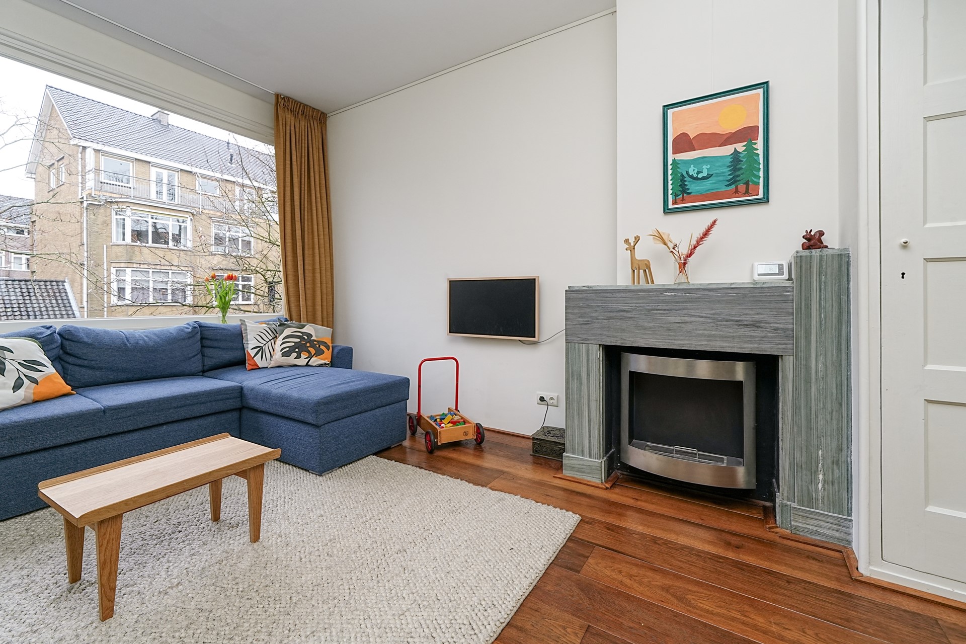 De lichte en royale woonkamer aan de voorzijde beschikt over grote raampartijen met uitzicht op de rustige en groene Lumeystraat. Een heerlijke plek om te ontspannen of gasten te ontvangen. De natuurstenen schouw met ethanolhaard zorgt voor extra sfeer.