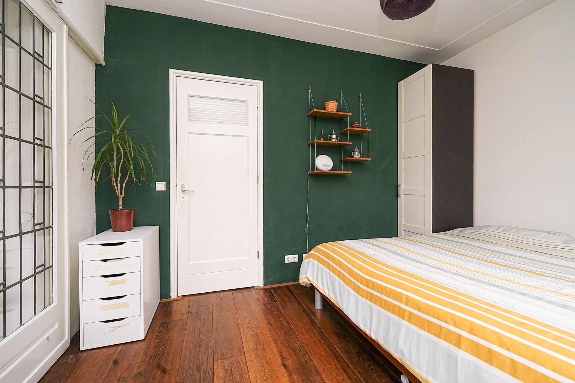 Vanuit de woonkamer bereik je zowel de achterkamer (momenteel in gebruik als eetkamer) als de slaapkamer aan de voorzijde. Beide ruimtes zijn afgescheiden met prachtige en-suite schuifdeuren met glas-in-loodramen, helemaal in jaren ’30-stijl. Tussen de woon- en eetkamer bevinden zich bovendien vaste kasten met paneeldeuren en boven de ensuiteschuifdeuren bevindt zich nog een flinke opbergruimte.