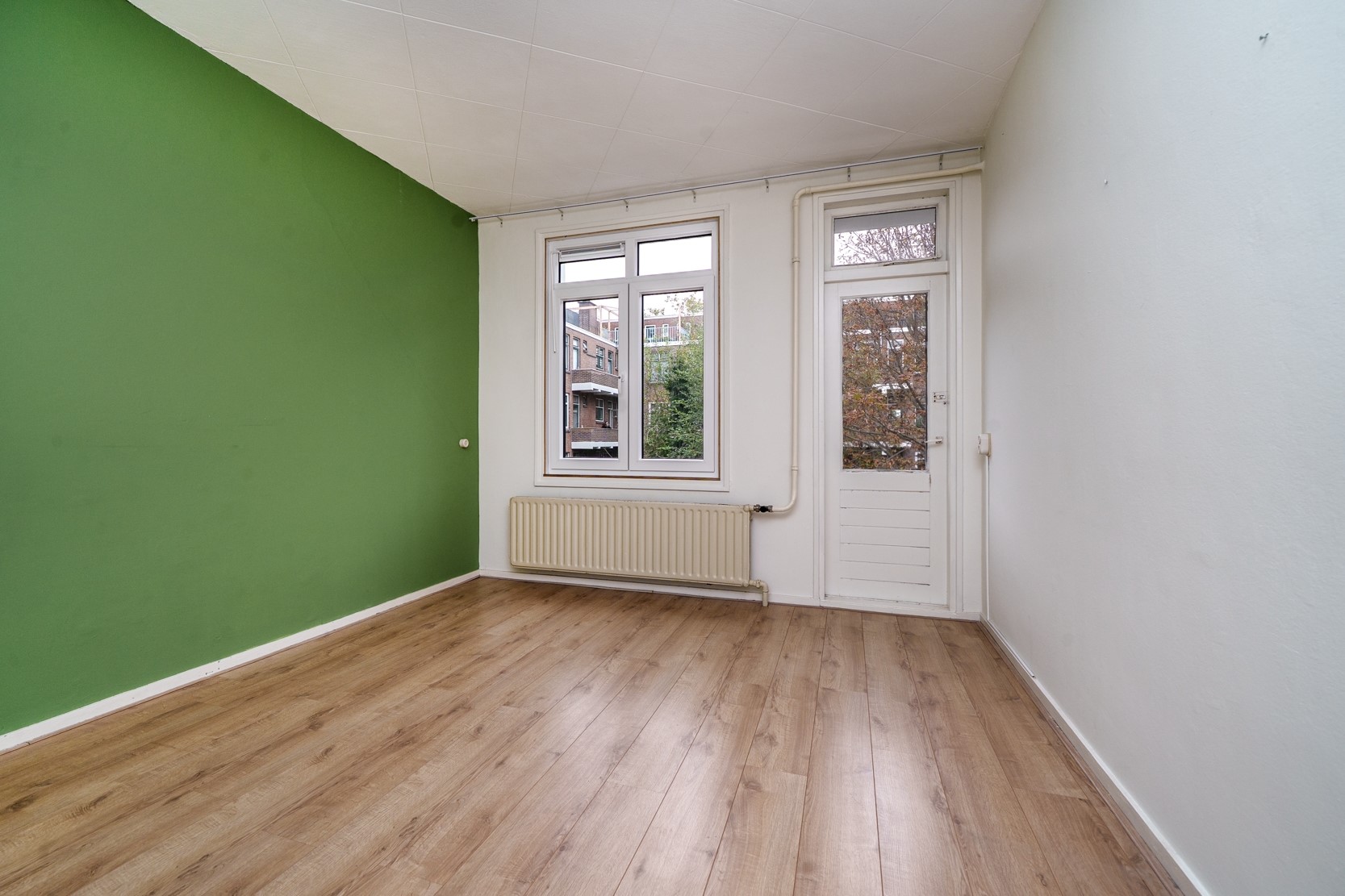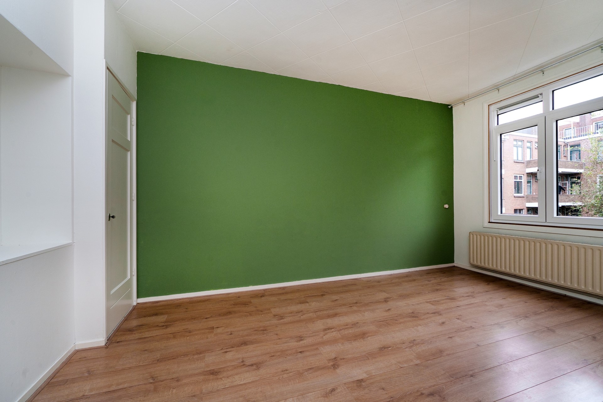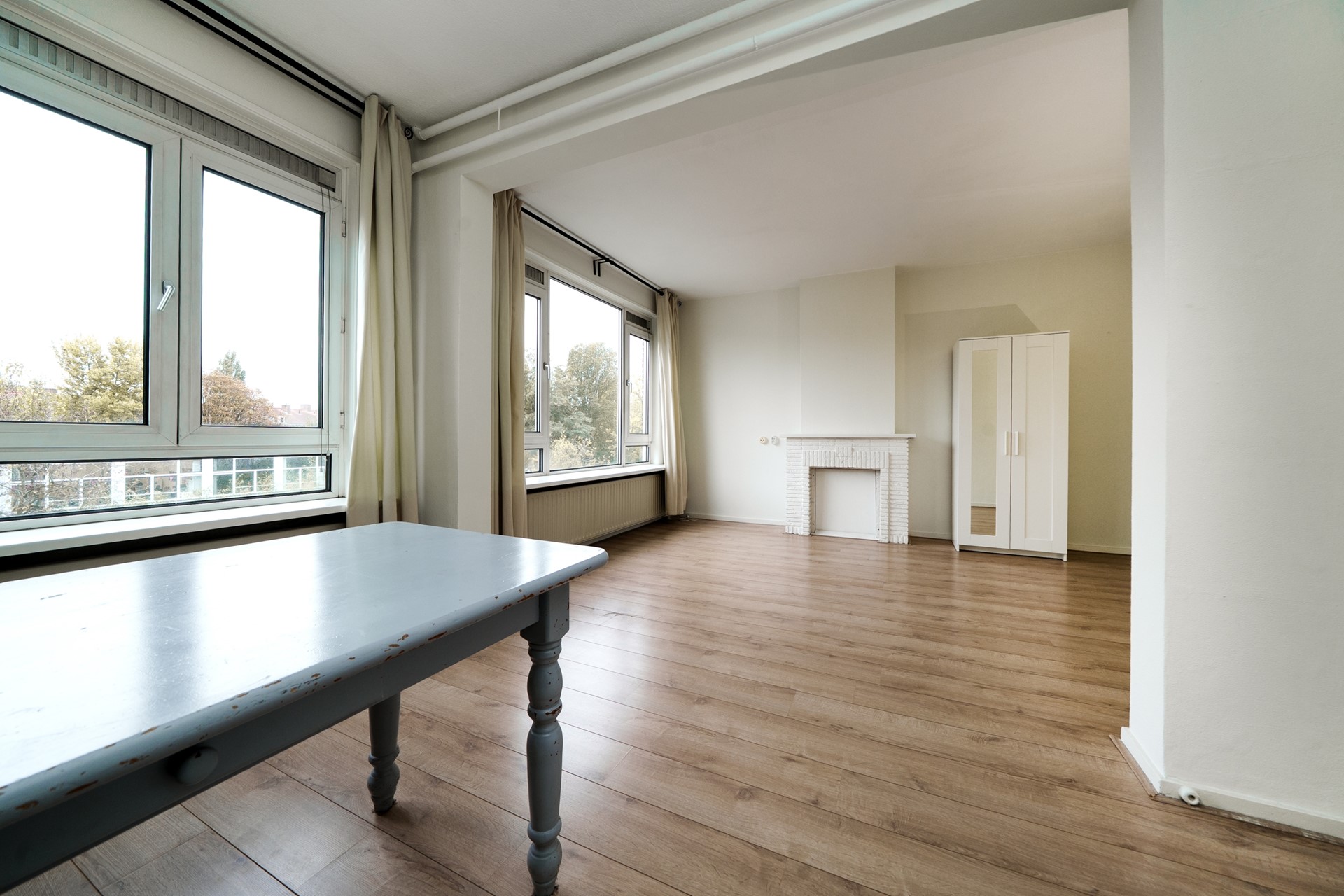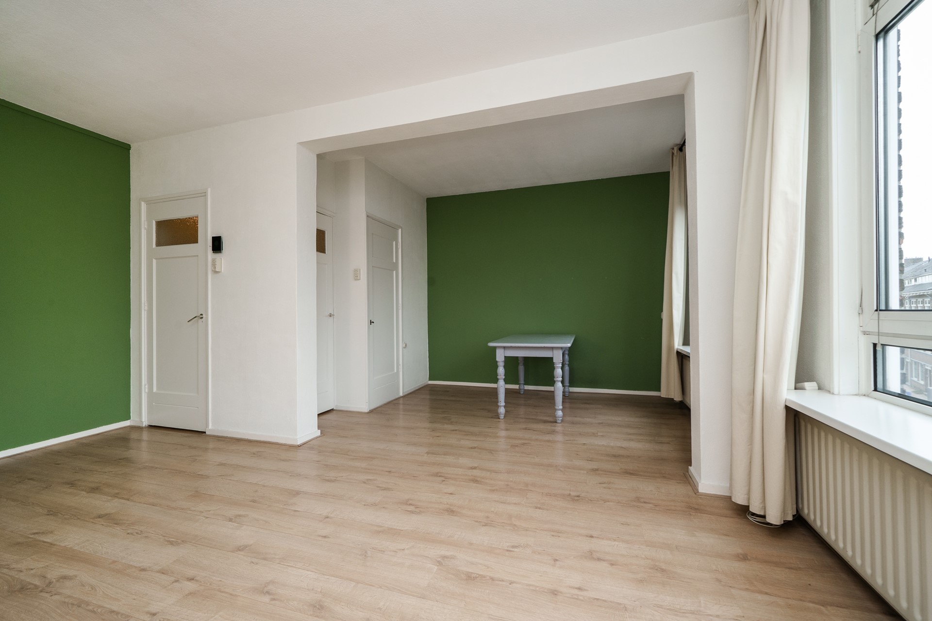 De ruime woonkamer is gelegen aan de voorzijde van de woning en biedt veel lichtinval middels de grote raampartijen met uitzicht richting de mooie Statensingel. De ramen zijn voorzien van nieuwe kunststof kozijnen, dubbele beglazing en brede vensterbanken. Voorheen bestond de woonkamer uit 2 kamers en dit is uiteraard terug te brengen. De woonkamer is voorzien van een inbouw opbergkast en een schouw.