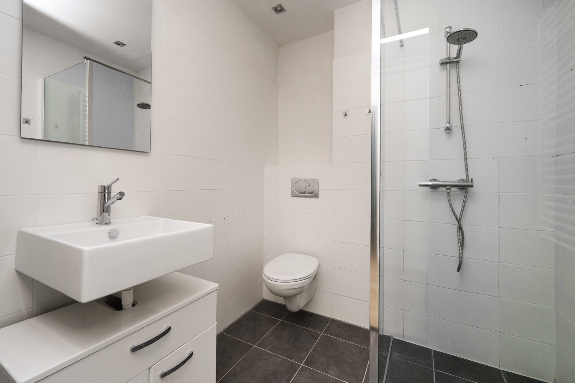 De badkamer is voorzien van donker grijze vloertegels en witte muurtegels, zwevend toilet, design radiator, inloopdouche met glazen wand, spiegel, wastafel en afzuiginstallatie.