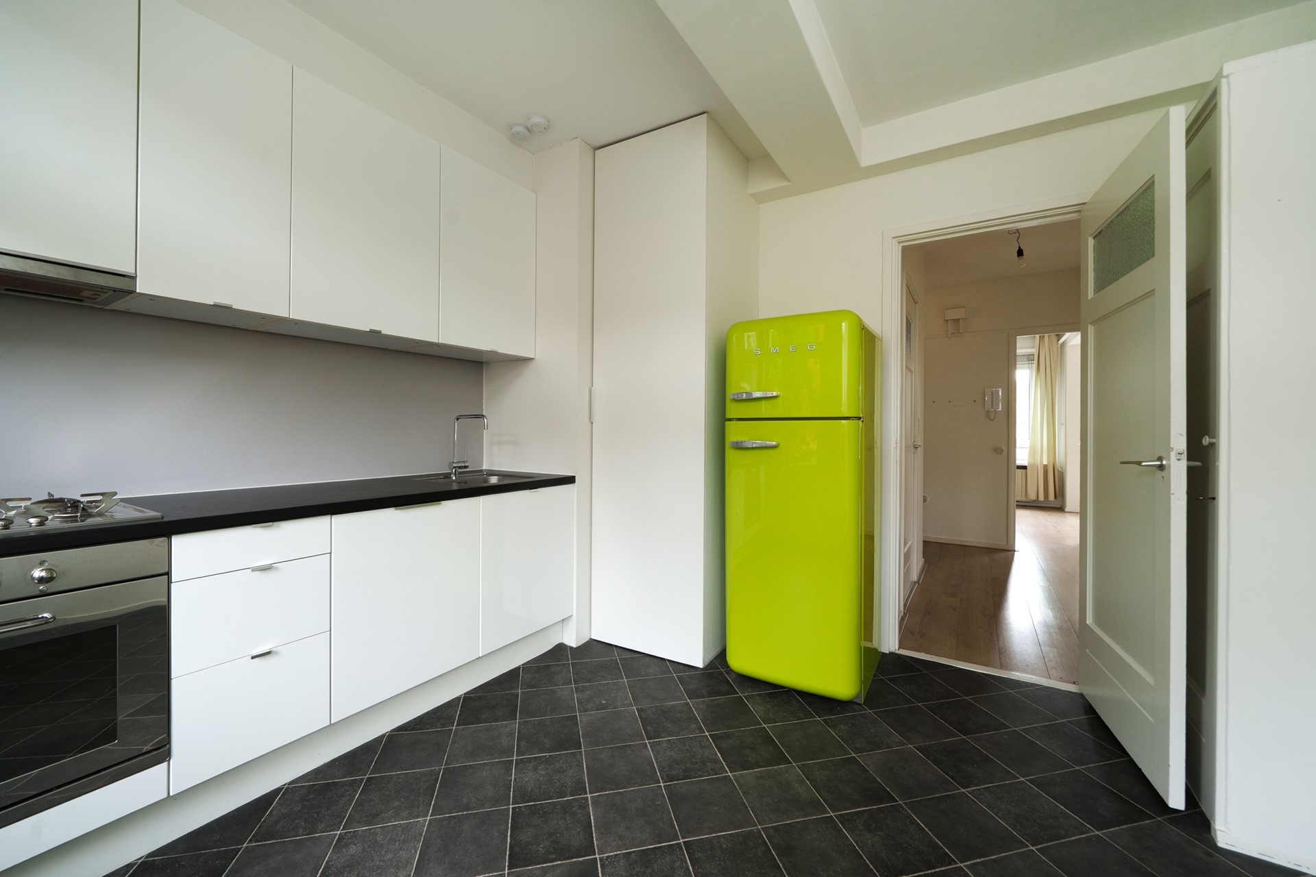 De royale woonkeuken is gelegen aan de achterzijde. De keuken is voorzien van hoogglans witte onder- en bovenkasten met zwart aanrechtblad, 4-pits gasfornuis en oven van het merk Smeg, afzuigkap en vaatwasser. Daarnaast is er in de keuken een opbergkast met de wasmachineaansluiting. Vanuit de keuken is er toegang op balkon gelegen op het noordwesten (middag/avond zon) met uitzicht op de verzorgde binnentuinen.