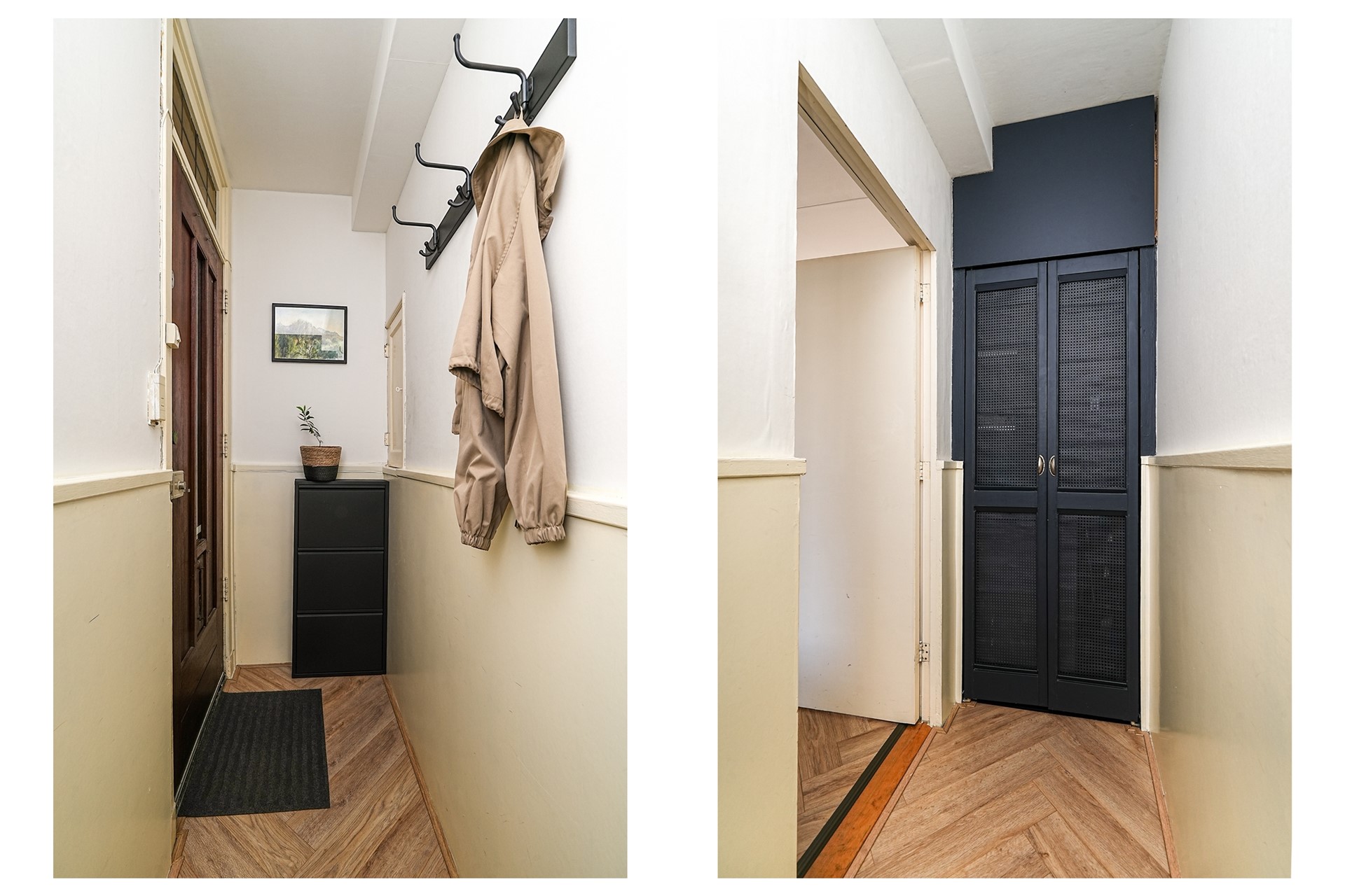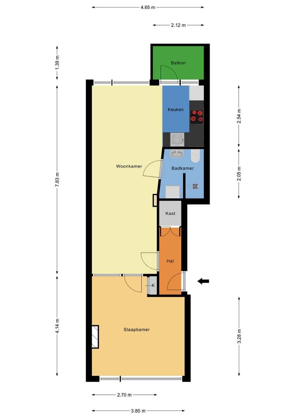 Via de voordeur betreedt u de hal, die toegang biedt tot de lichte woonkamer en een praktische, ruime bergkast. De woonkamer vormt het hart van de woning en geeft toegang tot de slaapkamer, badkamer en open keuken.