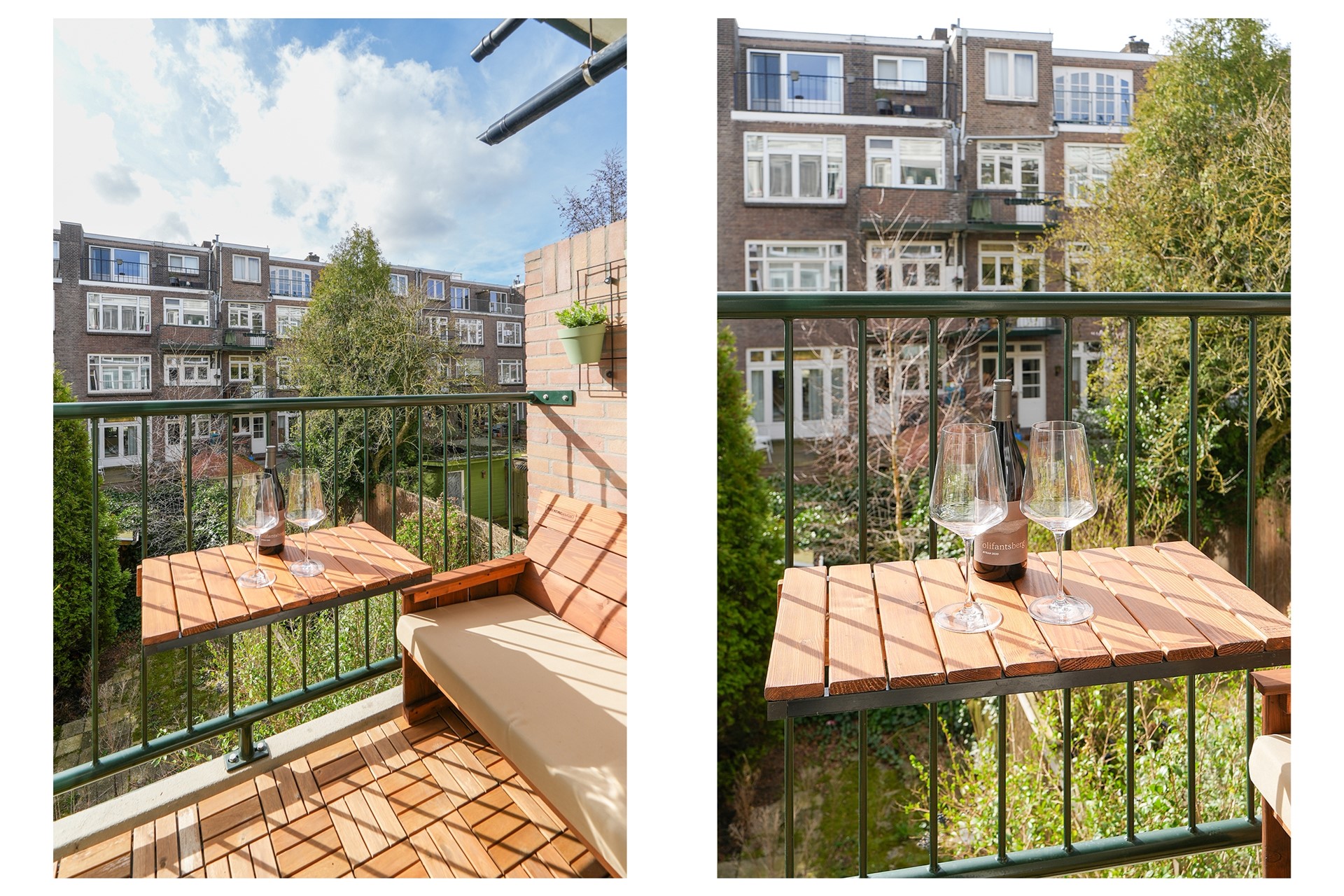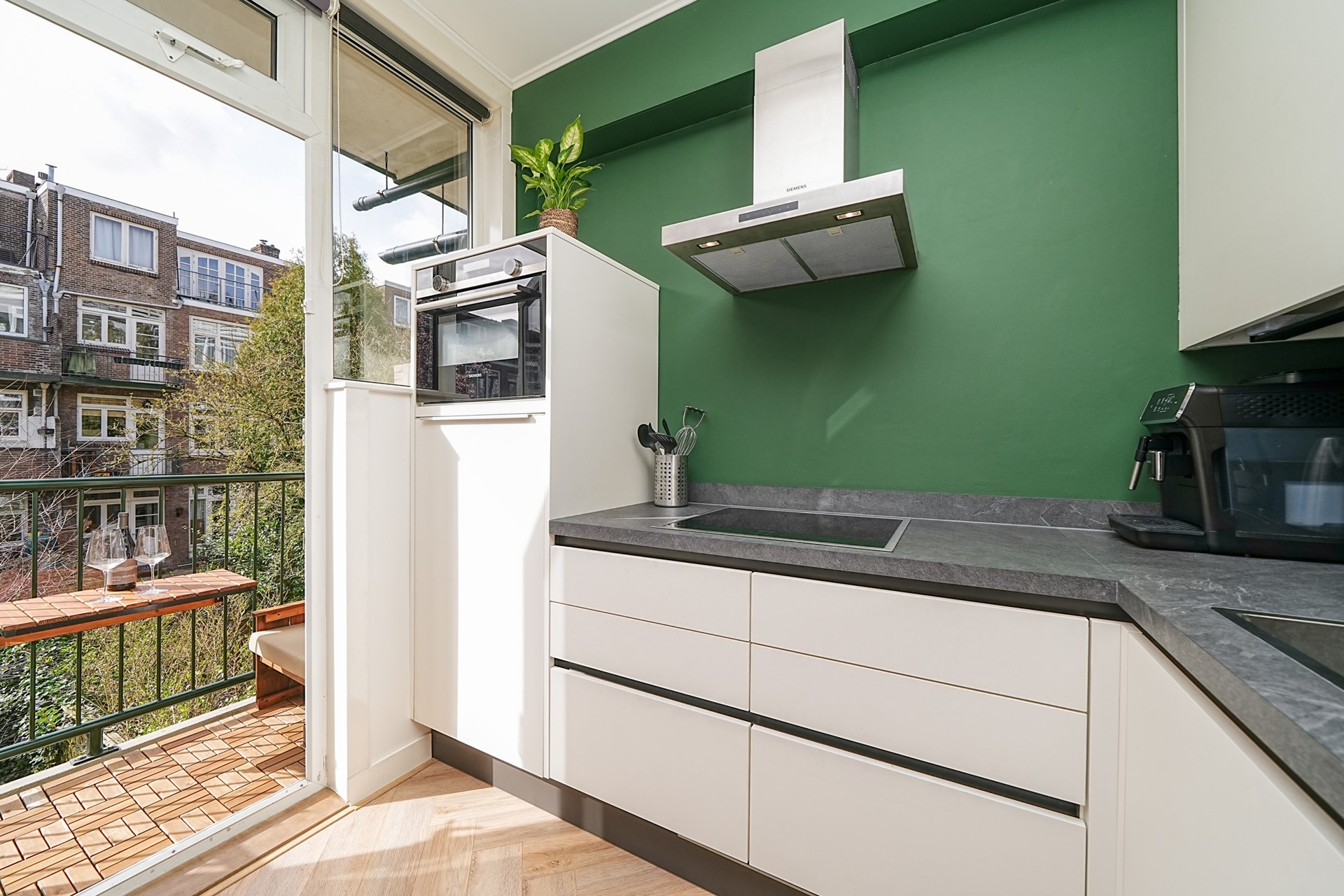 Via de keukendeur bereikt u het balkon op het zuidwesten: een heerlijke plek om te ontspannen in de middag- en avondzon, met uitzicht over de groene en gezellige binnentuinen.