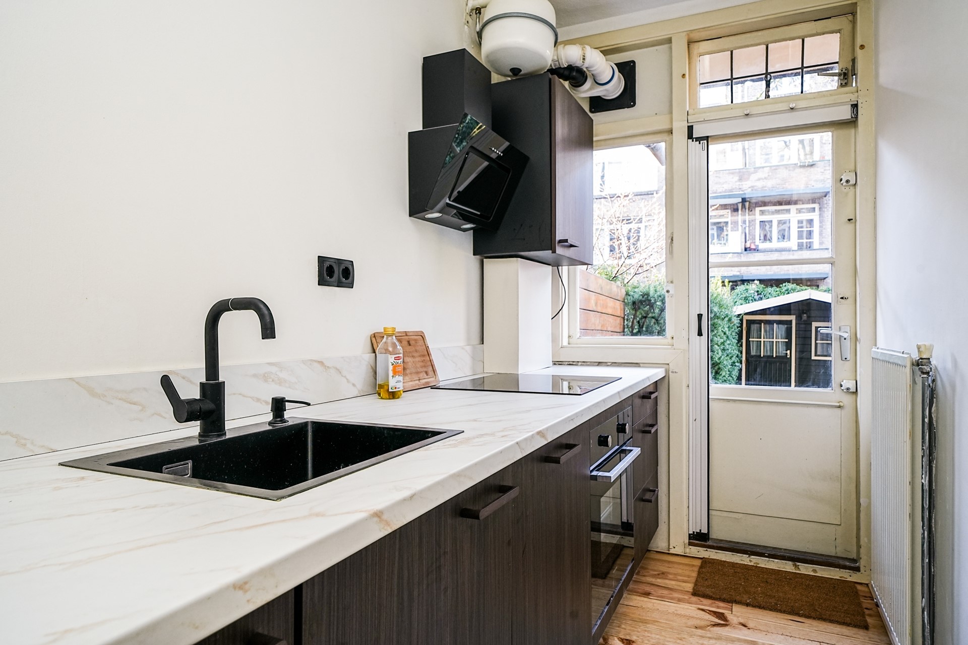 De recent vernieuwde keuken (Ikook) aan de achterzijde is modern uitgevoerd in een donkerbruine kleurstelling met natuursteenlook aanrechtblad en voorzien van alle gemakken: koelkast, inductiekookplaat, oven, vaatwasser en een bijpassende zwarte afzuigkap. Het leidingwerk en de elektriciteit in de keuken zijn recent vervangen. Vanuit de keuken is er directe toegang tot de achtertuin.