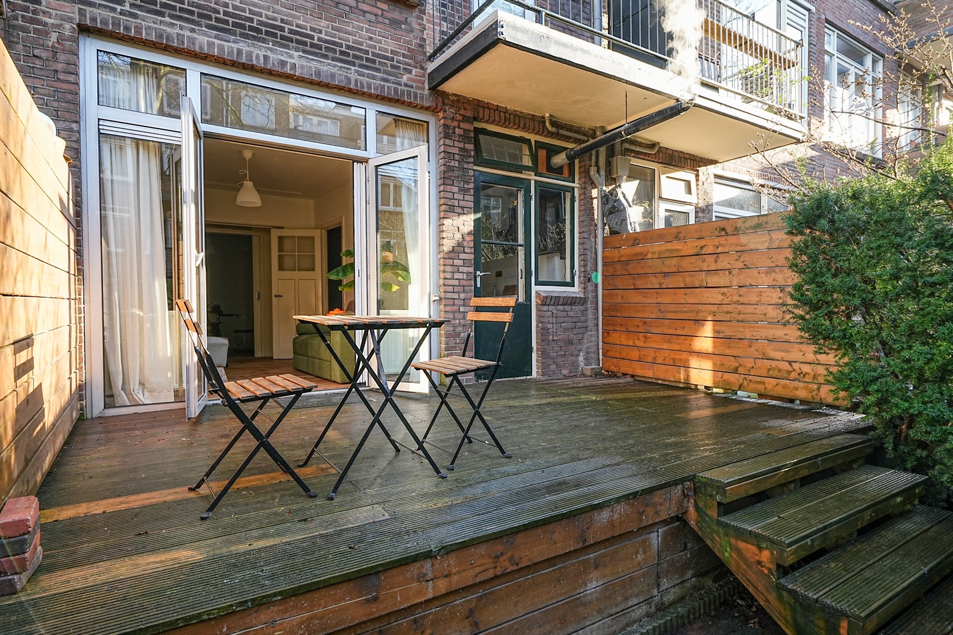 De zonnige achtertuin vormt een verlengstuk van de woonkamer. De veranda nodigt uit tot lange zomeravonden en via een trap bereikt u de lagergelegen tuin. Dankzij de westelijke ligging is het hier heerlijk vertoeven tot zonsondergang.