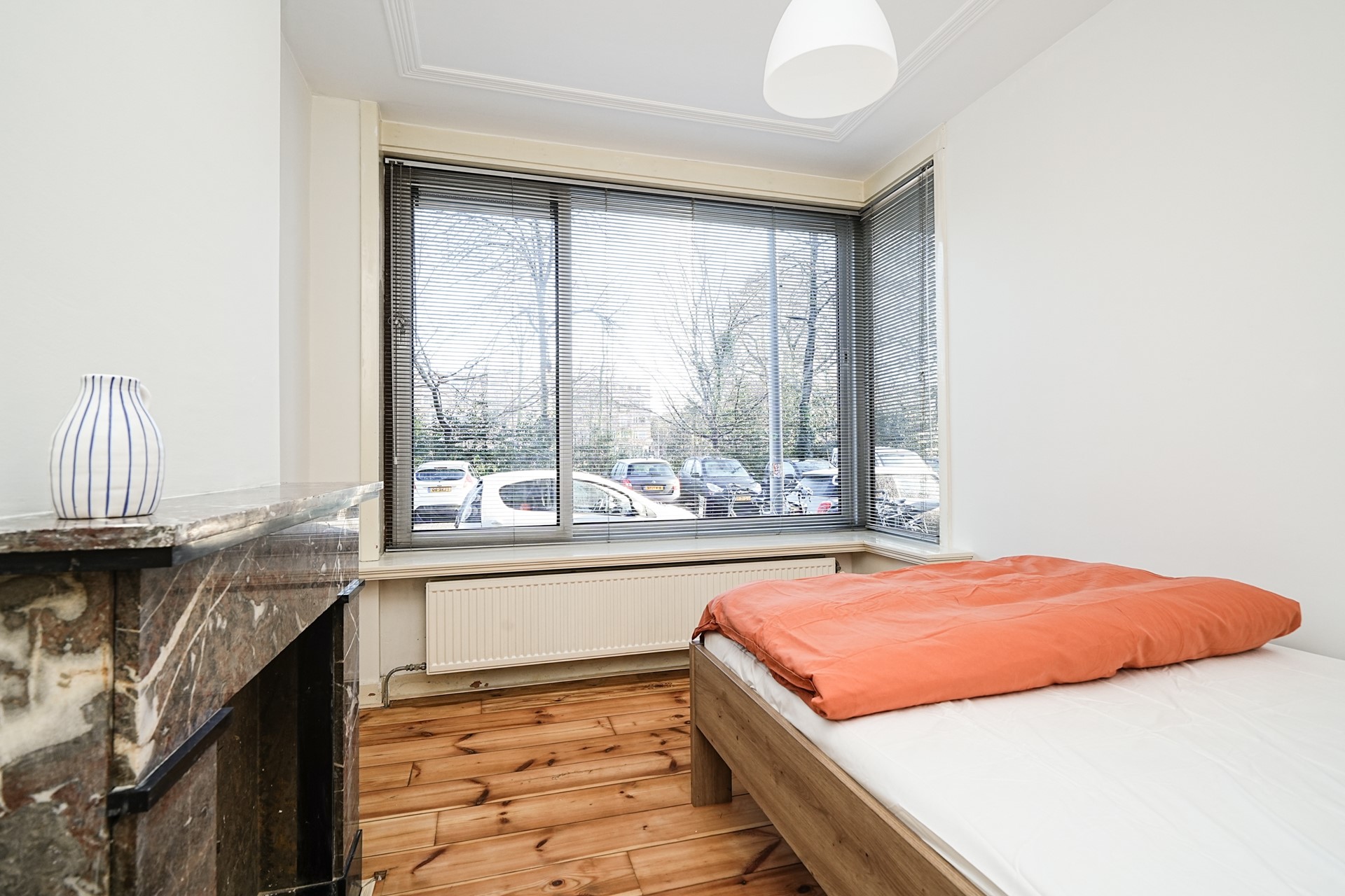 Aan de voorzijde ligt de ruime slaapkamer, een fijne en rustige plek om te ontspannen. De wand die de eetkamer van de woonkamer scheidt is recent vernieuwd. Het is een hele fijne slaapkamer en de originele marmeren schouw en plafondlijsten geven ook hier karakter en charme.