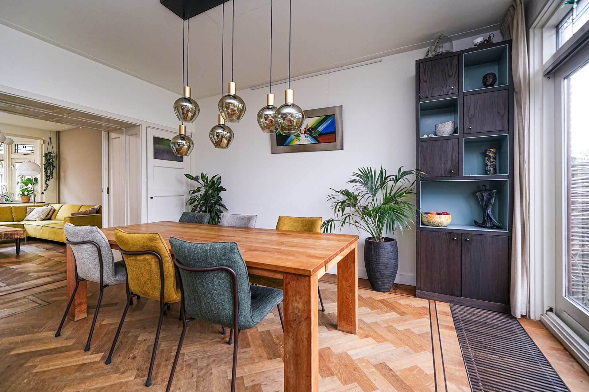 De woonkamer en eetkamer zijn van elkaar gescheiden door een fraaie kamer-en-suite met glas-in-loodramen en vaste kasten. Ook de eetkamer is afgewerkt in dezelfde stijlvolle lijn als de woonkamer. Vanuit hier geeft een ruime schuifpui toegang tot de tuin en het vrije uitzicht over het water, wat de ruimte bijzonder geschikt maakt voor lange diners met familie en vrienden.