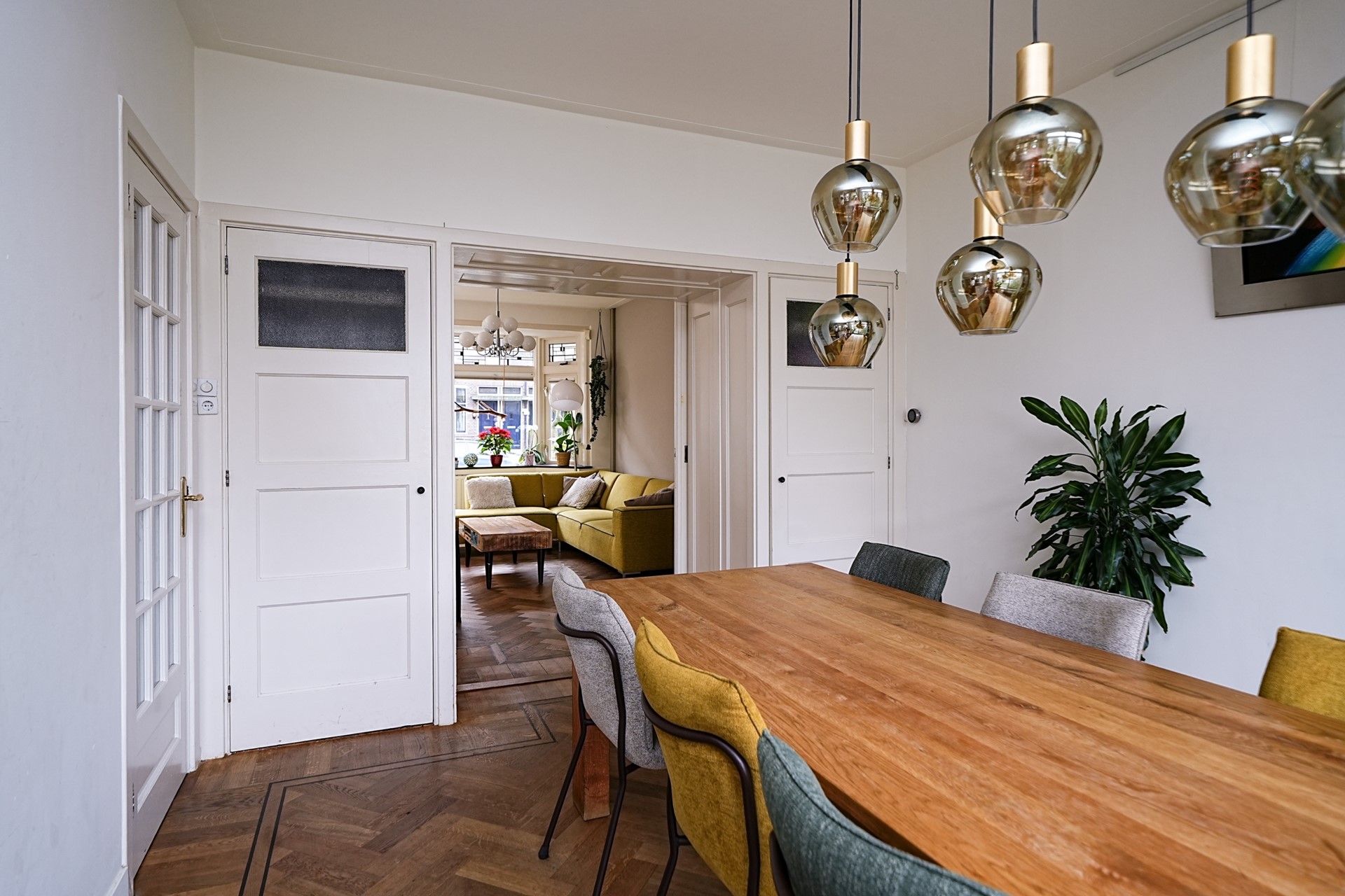 Bij binnenkomst valt meteen de prettige lichtinval en de rijke jaren ’30 uitstraling op. Hoge plafonds, glas-in-lood bovenramen en een warme, huiselijke sfeer kenmerken deze verdieping. De visgraat gelegde en deels nog originele parketvloer met zwarte bies en de strak gestuukte wanden maken het geheel compleet.