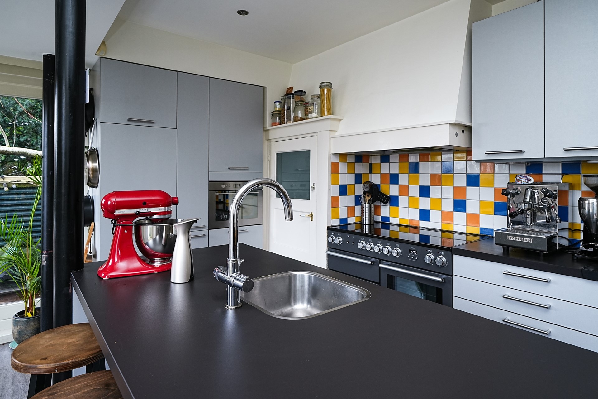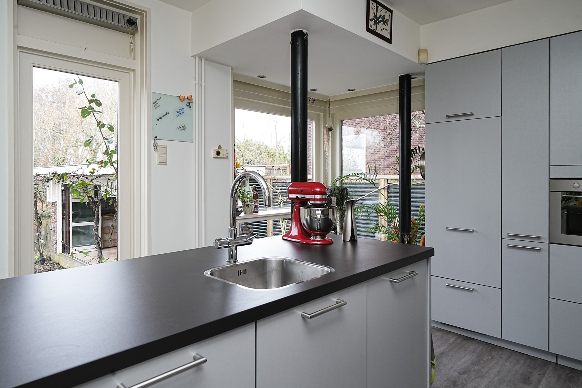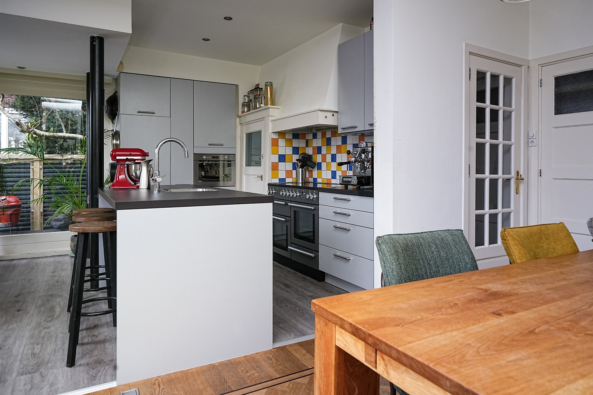 De open keuken is modern en luxe uitgevoerd en beschikt over een kookeiland, waardoor koken en samenzijn naadloos in elkaar overlopen. Er is prettig contact met de eetkamer en fraai uitzicht op de tuin. Het kookeiland is voorzien van veel kastruimte, een vaatwasser en een spoelbak met mengkraan en kokend-waterkraan. De hoge kastenwand aan de zijkant beschikt over een koelkast, vriezer en oven. Daarnaast is er een vrijstaand inductie fornuis met twee ovens, een grill, een afzuigkap en volop opbergruimte. Grote raampartijen aan de achter- en zijkant zorgen voor veel licht en zicht op de achtertuin.