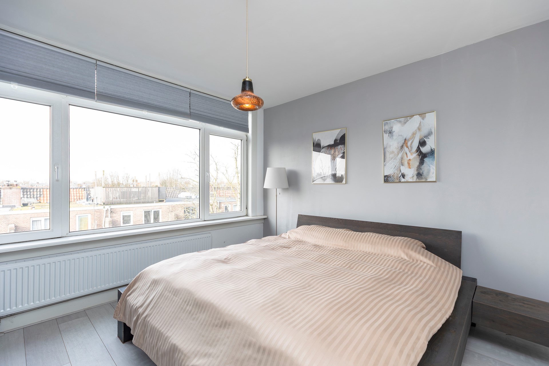 De royale hoofdslaapkamer is opvallend licht dankzij de grote ramen en biedt volop ruimte voor een tweepersoonsbed en een grote garderobekast.