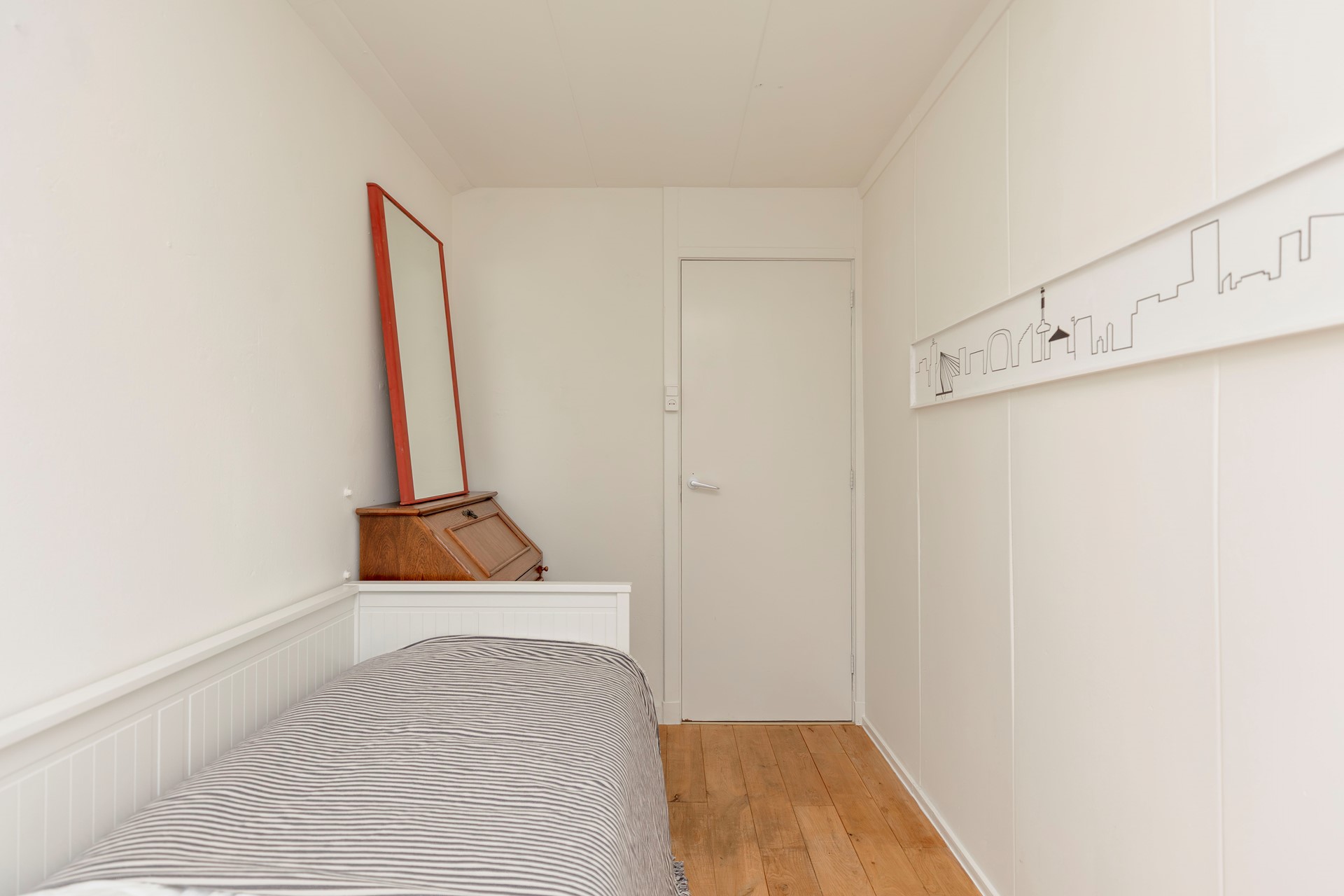 De hoofdslaapkamer is ruim opgezet en biedt moeiteloos plaats aan een groot tweepersoonsbed. Ook hier zorgen de houten vloer en strak gestucte wanden voor een verzorgde en rustige uitstraling. De tweede kamer heeft dezelfde nette afwerking en heeft de aansluitingen voor de wasmachine en