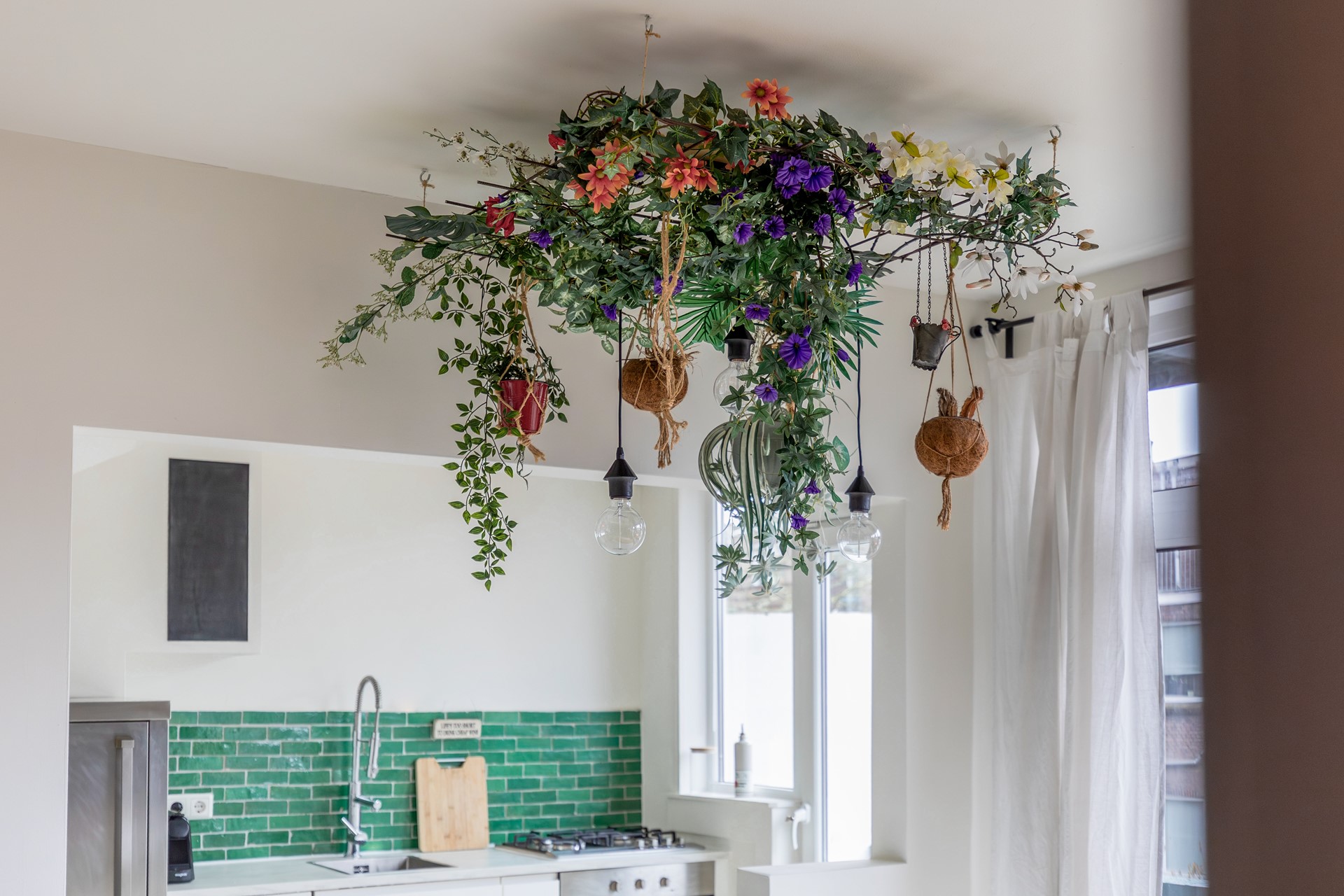 De witte keuken is praktisch én stijlvol ingericht. U beschikt over een oven, gaskookplaat en volop bergruimte. Het keukenblok staat in open verbinding met de woonkamer en biedt extra werkruimte én een gezellige plek om aan te zitten.