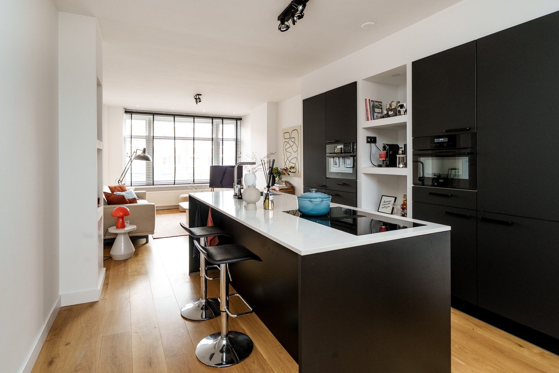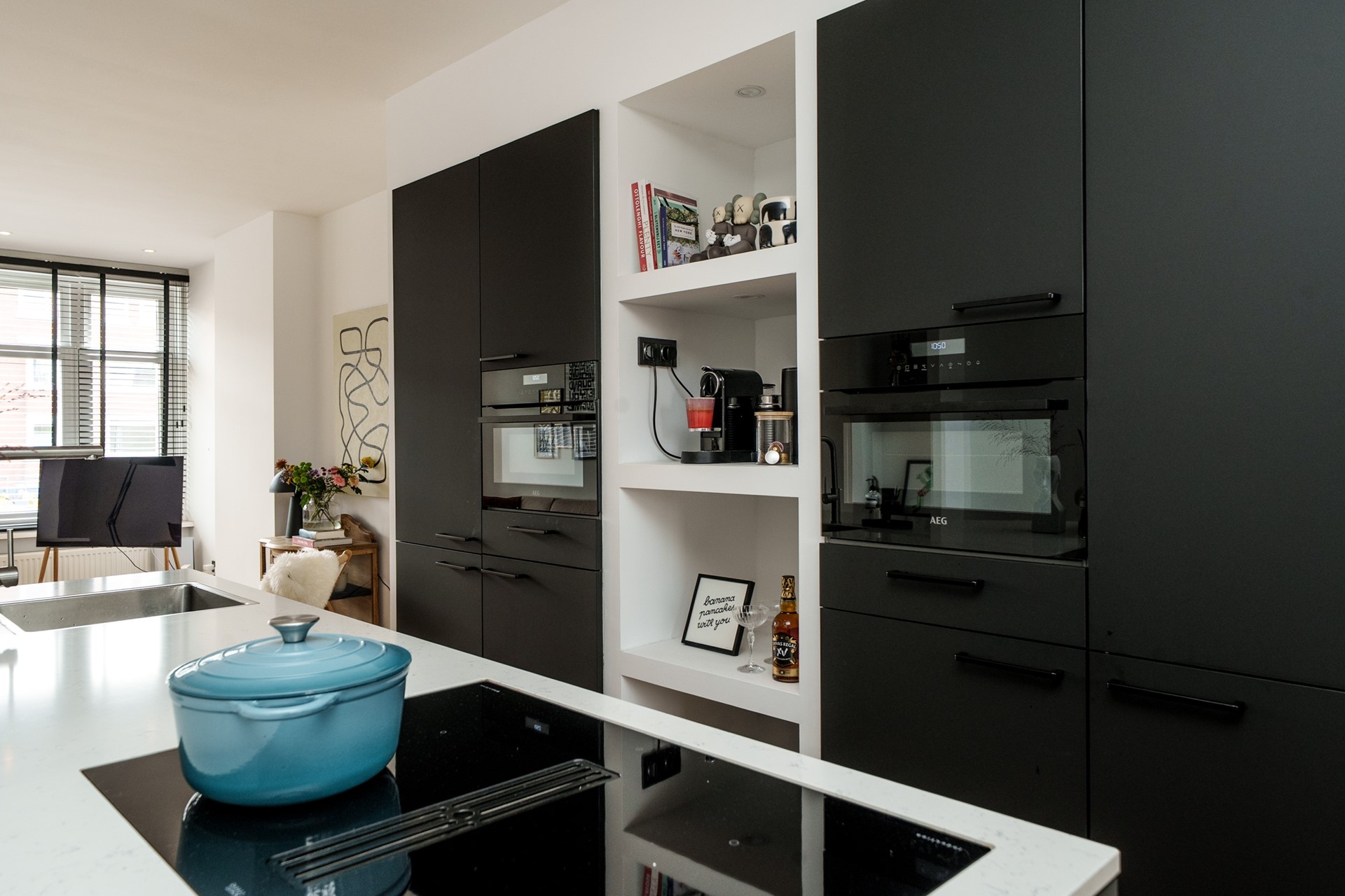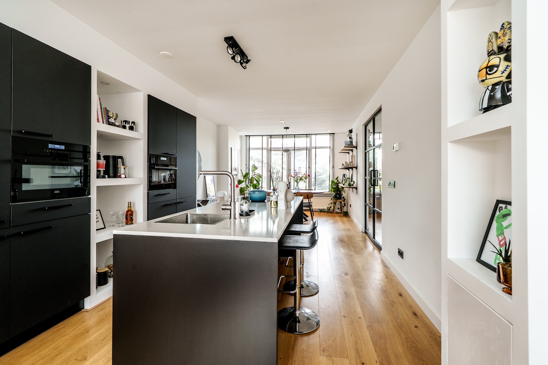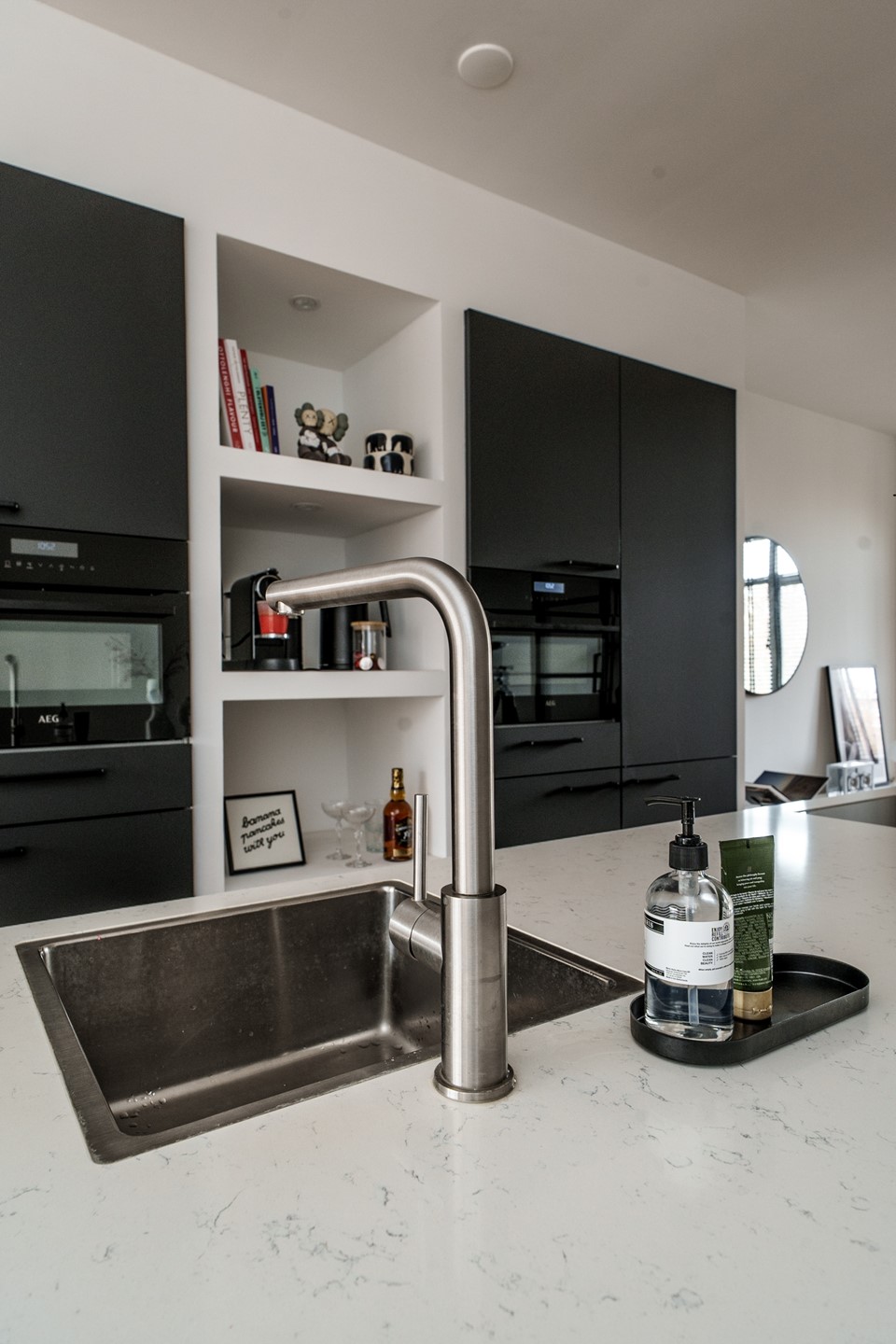 De keuken is uitgevoerd in zwart en afgewerkt met een wit natuurstenen werkblad, wat mooi past bij uitstraling van de zwartstalen deuren. Het kookeiland biedt niet alleen extra werkruimte, maar ook plek voor barkrukken, ideaal voor gezellige borrels of een snel ontbijt.