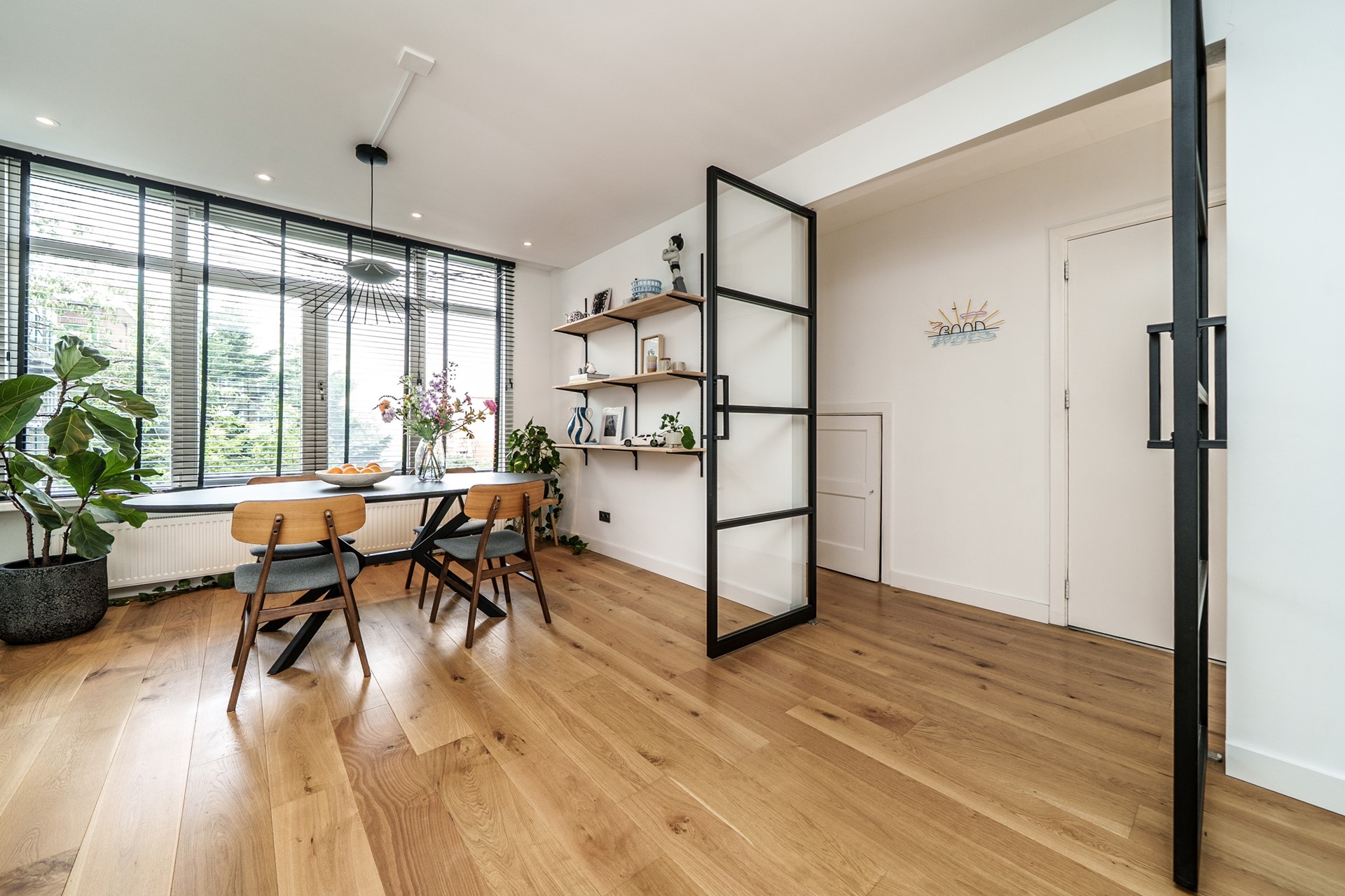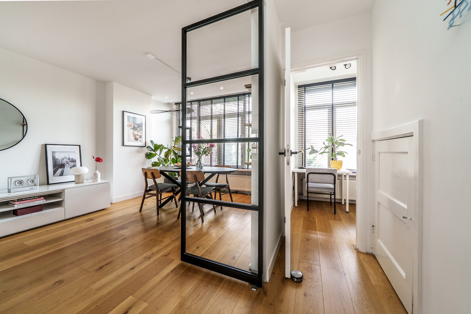 De hal geeft, middels prachtige openslaande glazen deuren met zwartstalen kozijnen, toegang tot de royale woonkamer met zit- en eetgedeelte en de luxe open keuken. De gehele verdieping is voorzien van een mooie houten vloer, terwijl de wanden en plafonds strak zijn gestukt. Dit zorgt voor een moderne, stijlvolle basis.