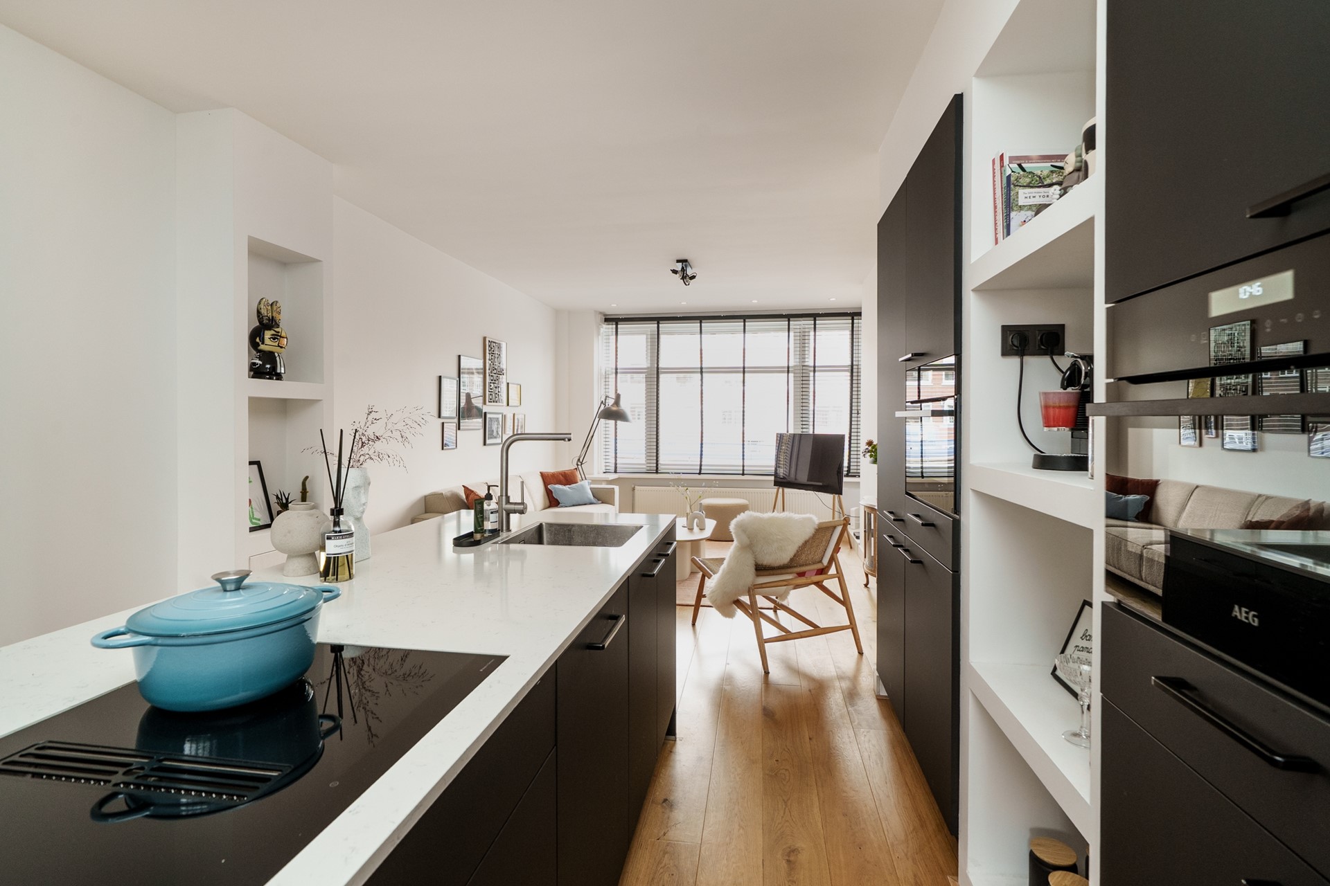 Uiteraard is de keuken voorzien van hoogwaardige inbouwapparatuur, waaronder een inductiekookplaat met ingebouwde afzuiging, vaatwasser, koelkast met vriezer, spoelbak met mengkraan en meer dan voldoende kastruimte.