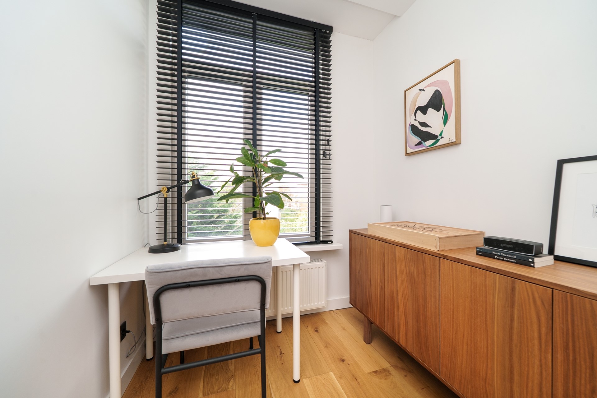 De hal biedt toegang tot twee extra kamers die uitstekend gebruikt kunnen worden als thuiswerkplek, studeerkamer of logeerkamer. Verder vindt u hier een vaste kast, een modern toilet en de trap naar de bovenverdieping.