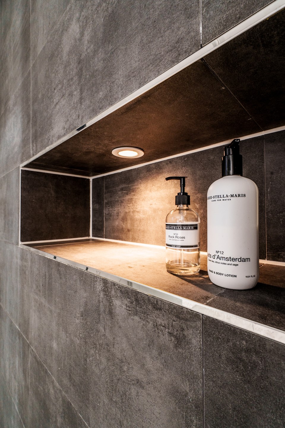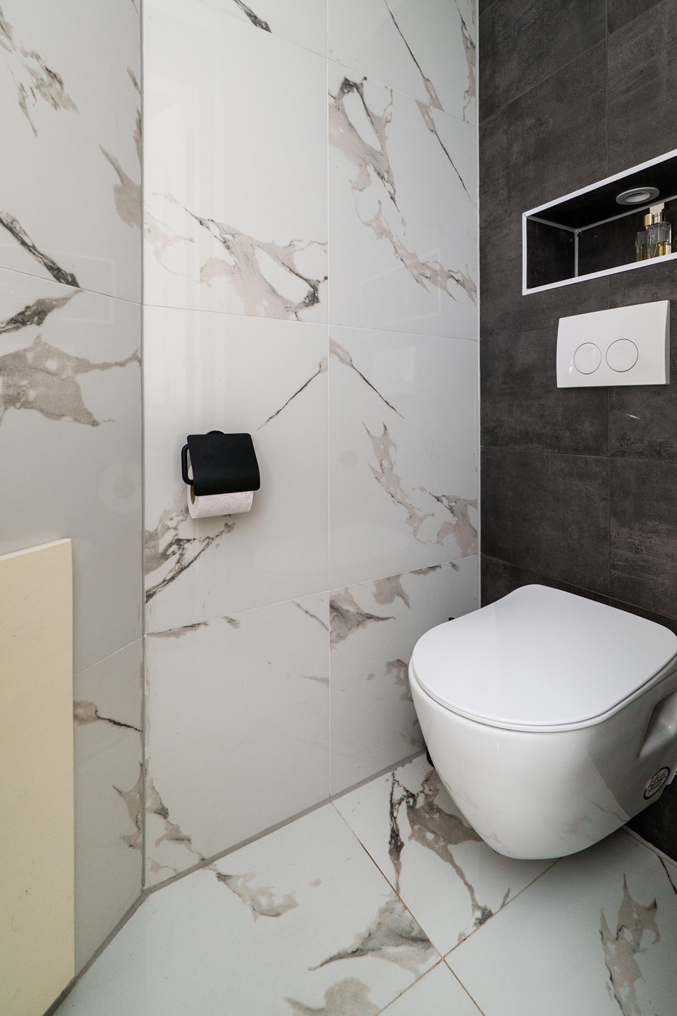De luxe badkamer straalt pure elegantie uit en is ingericht met een ruime inloopdouche, een modern wastafelmeubel met spiegel en een tweede toilet. De badkamer heeft een fraaie afwerking in marmerlook tegels, gecombineerd met stijlvolle zwarte details en kranen. Inbouwspots zorgen voor een fijne, rustige sfeer.