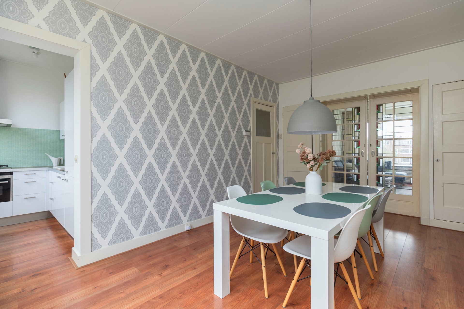 De eetkamer biedt royaal plaats aan een grote eettafel – dé plek voor lange diners, gezellige borrels en waardevolle familiemomenten. Vanuit hier loopt u door naar de open keuken, opgesteld in een praktische hoekopstelling.