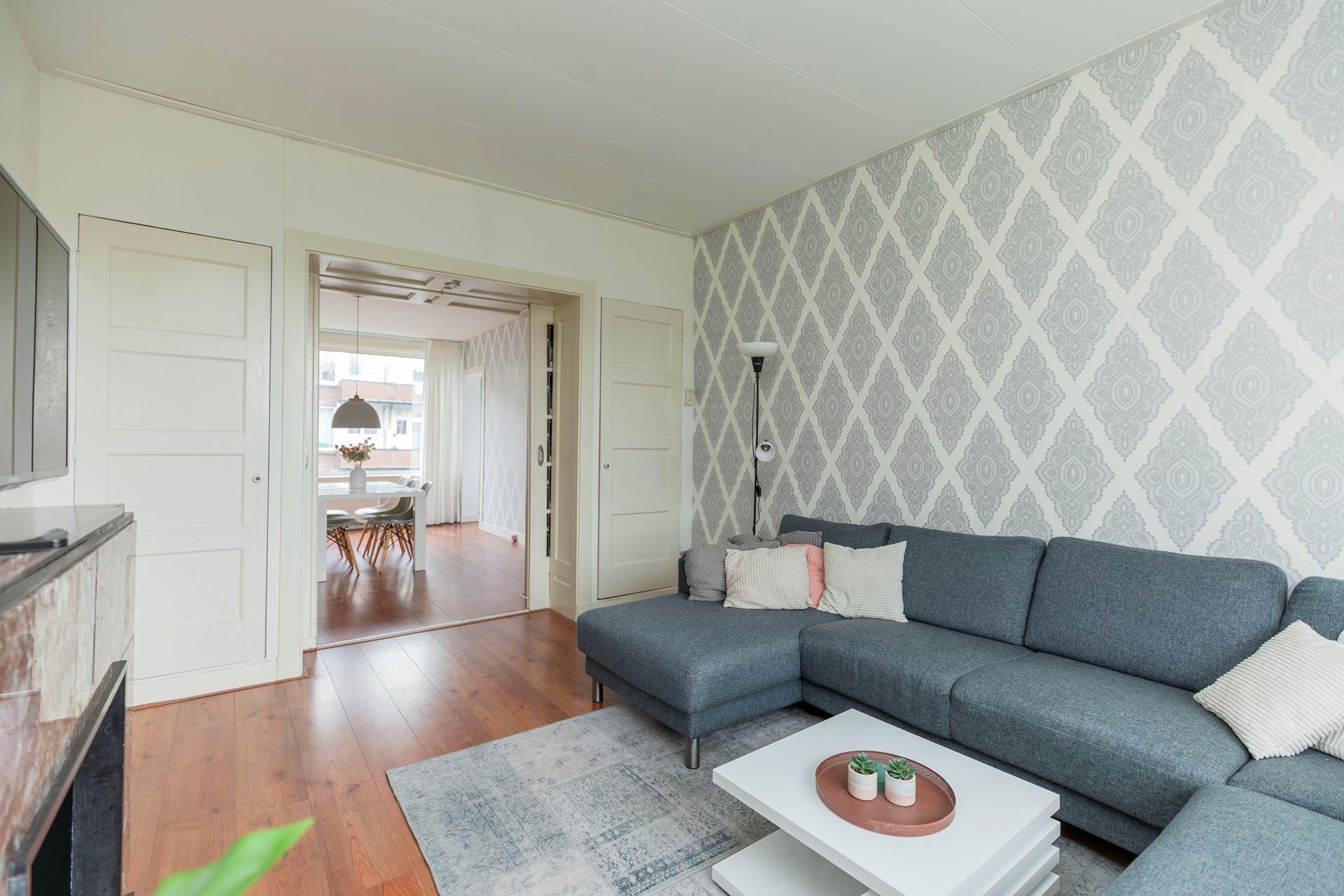 In combinatie met de houtlook laminaatvloer en strak afgewerkte wanden ontstaat hier een frisse, warme en uitnodigende sfeer.