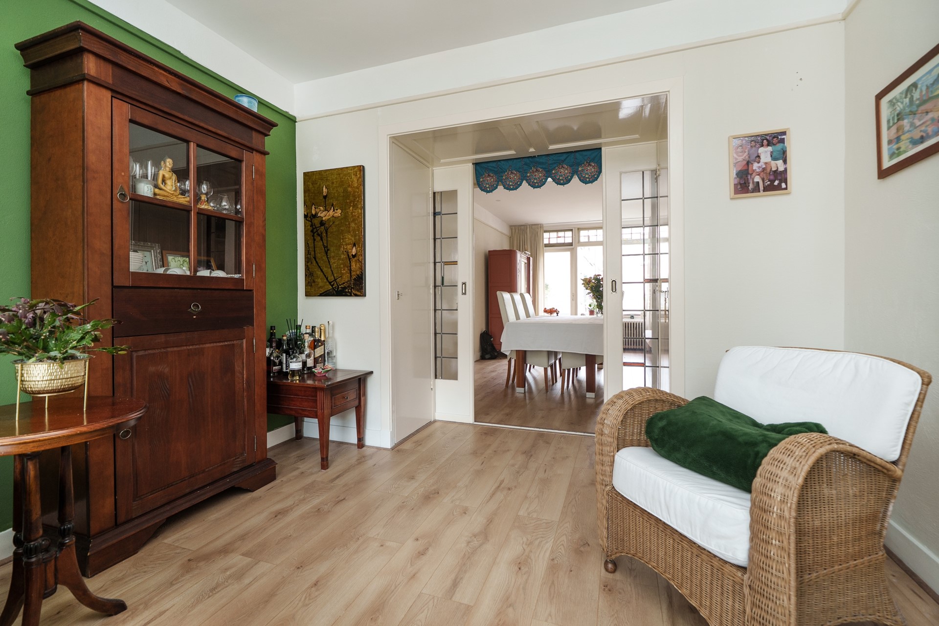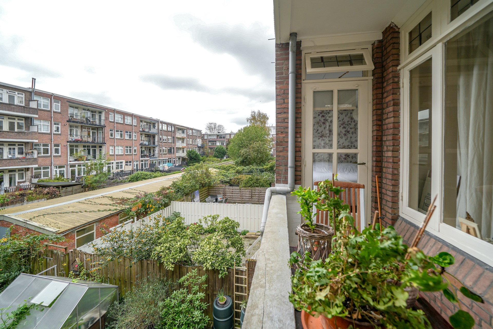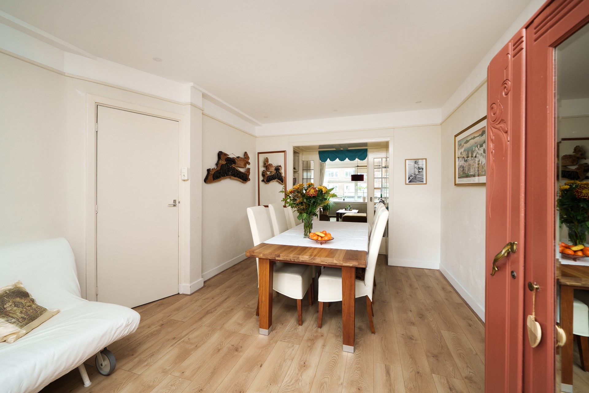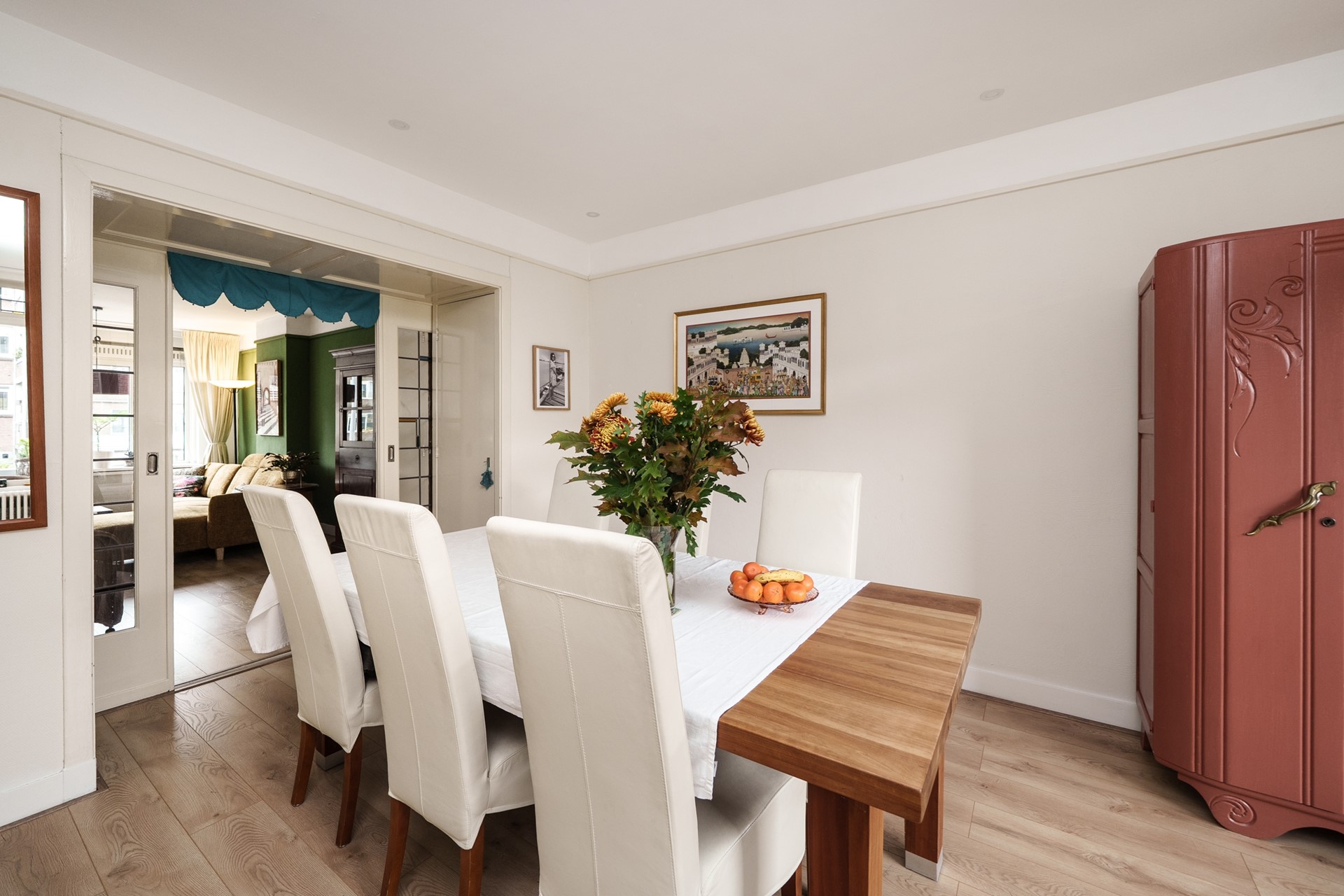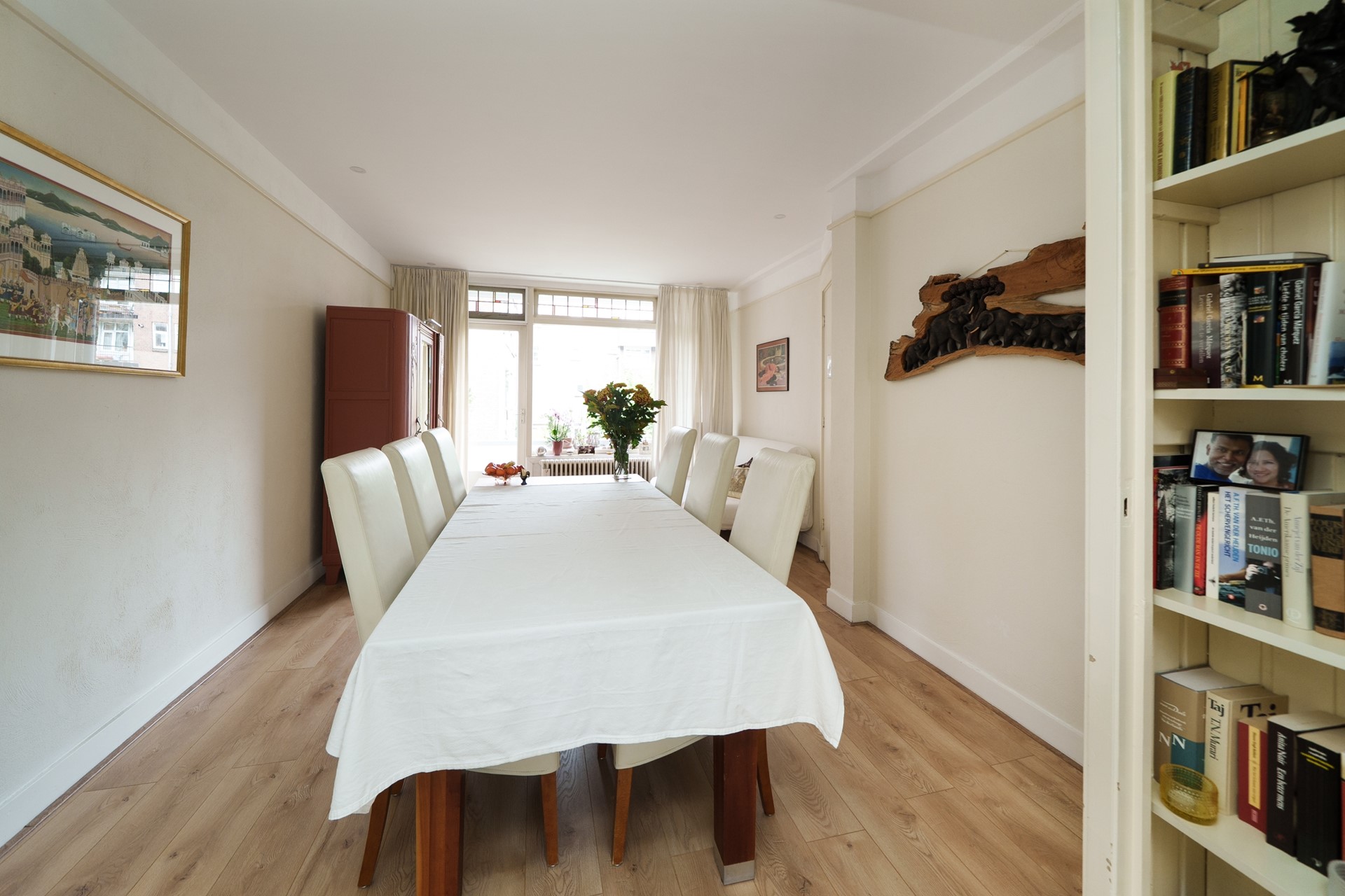 Via de originele ensuite-schuifdeuren kom je in de ruime eetkamer, die ook uitstekend gebruikt kan worden als extra slaapkamer of werkkamer. Vanuit deze kamer stap je zo het balkon op, een fijne buitenplek met uitzicht op de groene binnentuinen. Hier kun je ’s ochtends genieten van een kop koffie in de zon of ’s avonds ontspannen met een goed boek. Het balkon is gelegen op het noordwesten.