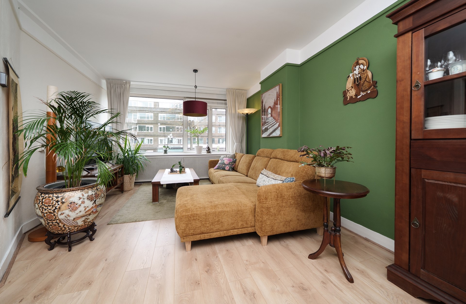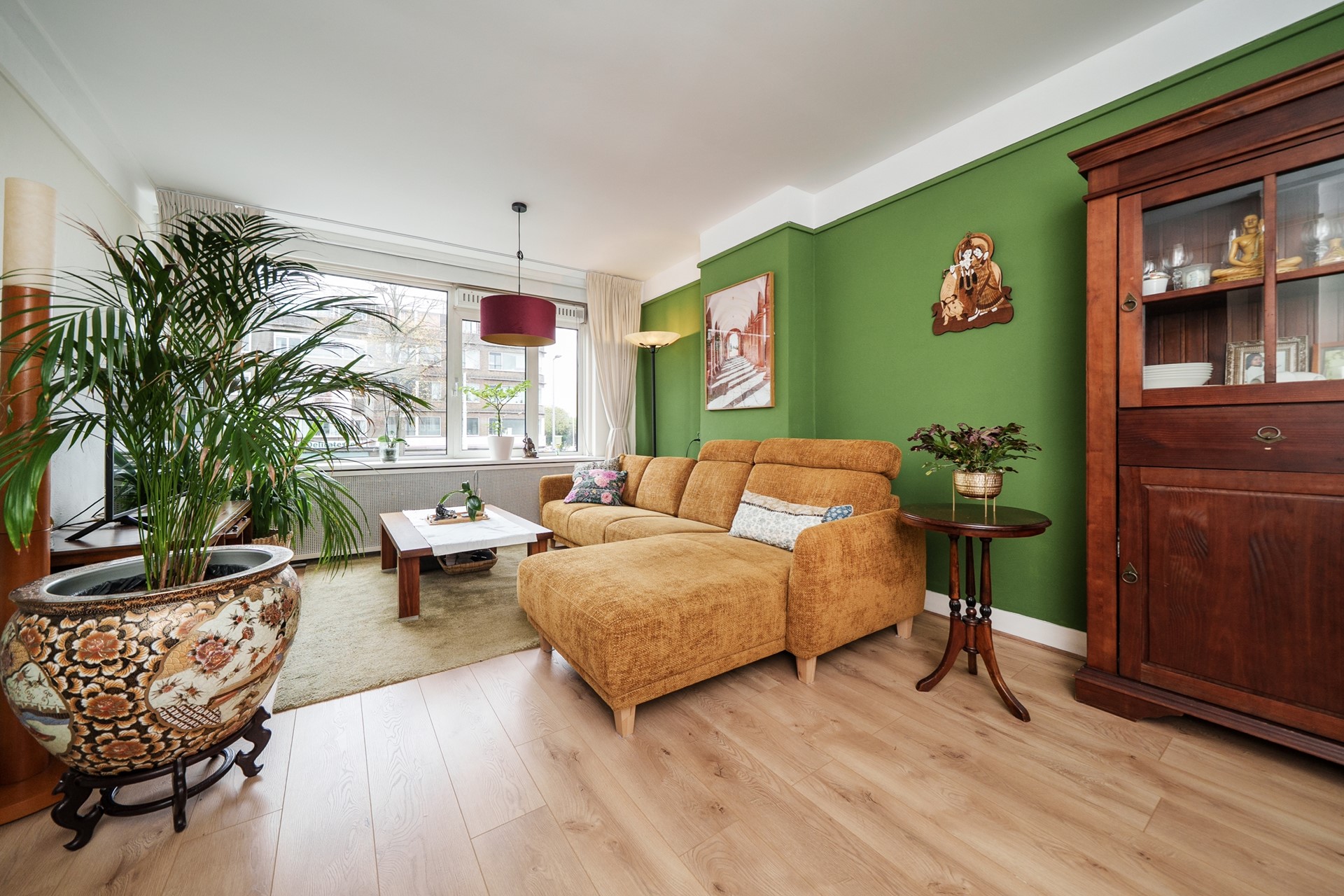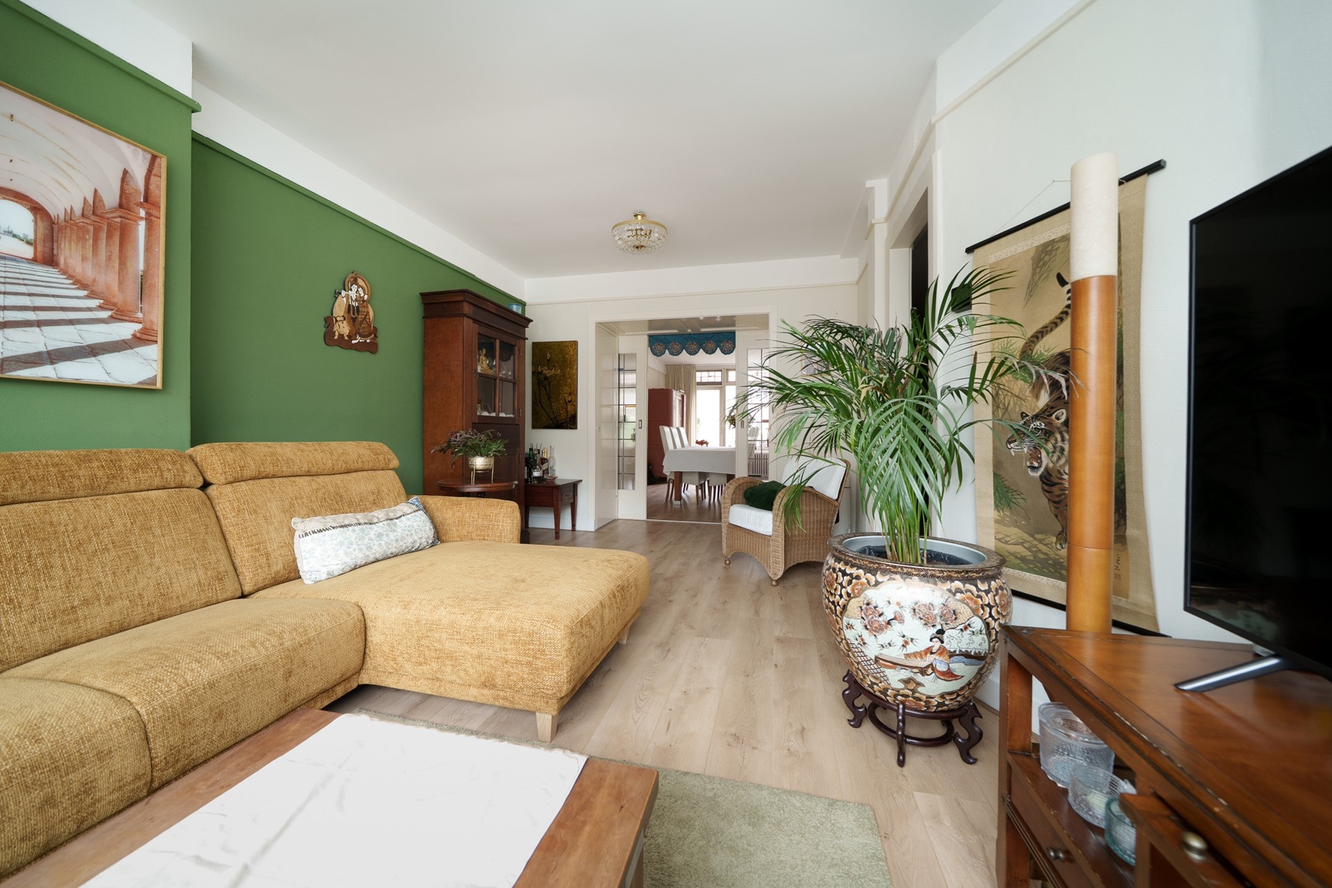 De royale woonkamer aan de voorzijde is een heerlijke plek om te ontspannen. Dankzij de grote raampartijen geniet je hier van veel daglicht, terwijl de houtlook laminaatvloer en de strak gestuukte wanden en plafonds zorgen voor een moderne en verzorgde uitstraling.