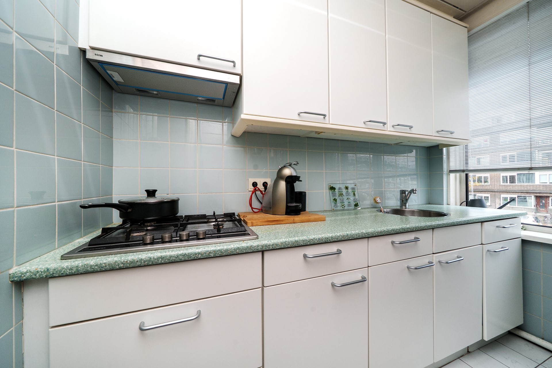 De aparte keuken ligt aan de voorzijde van de woning en heeft een frisse, lichte uitstraling. De wand is afgewerkt met charmante lichtblauwe tegels en het keukenblok beschikt over zowel onder- als bovenkasten, wat zorgt voor veel bergruimte. De keuken is voorzien van diverse inbouwapparatuur, waaronder een 4-pits gaskookplaat met afzuigkap en een RVS spoelbak met mengkraan. Of je nu houdt van uitgebreid koken of liever snel een maaltijd bereidt, deze keuken biedt alles wat je nodig hebt.