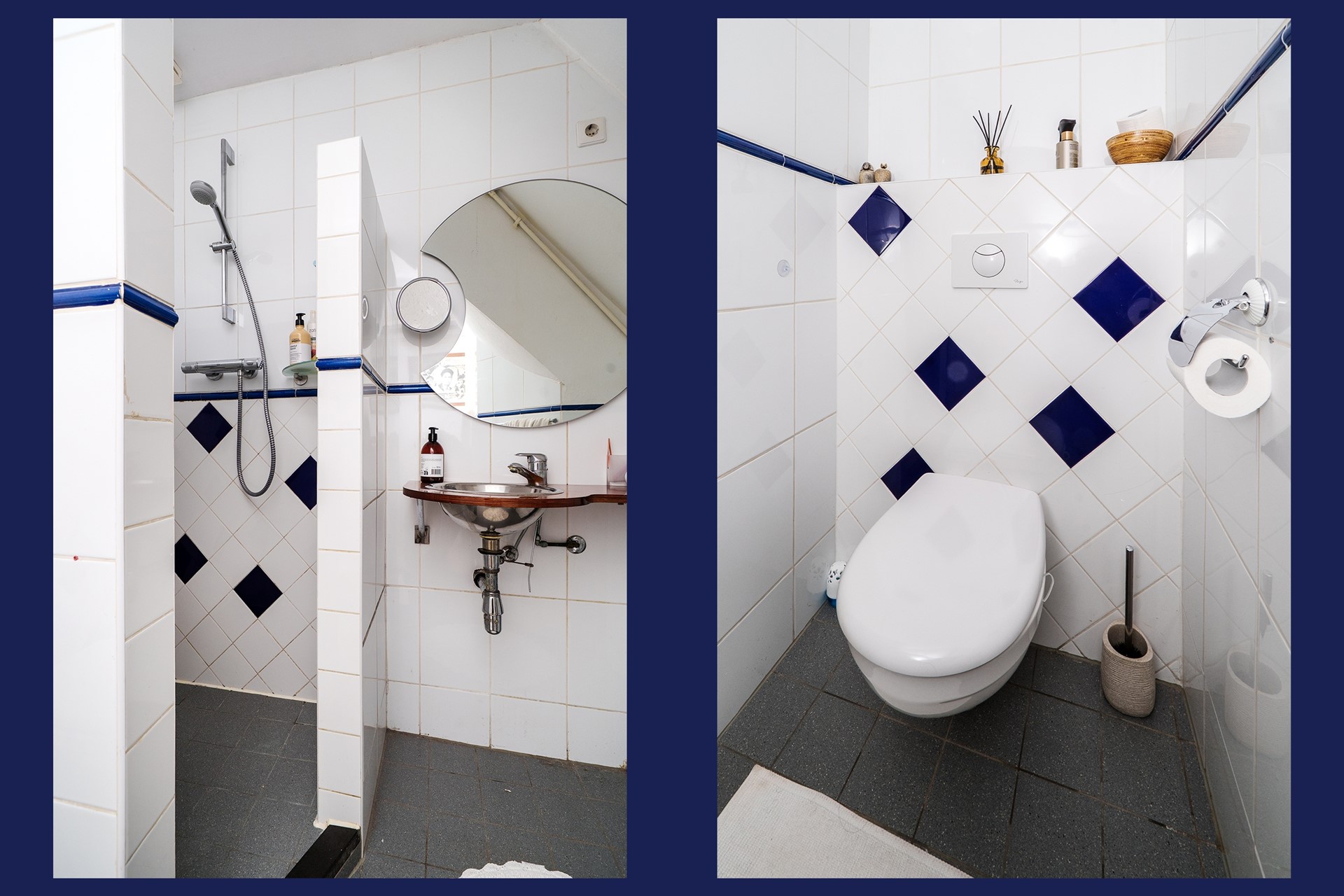 wastafel en een toilet. De witte wandtegels in combinatie met blauwe accenten geven de ruimte een moderne, frisse uitstraling.