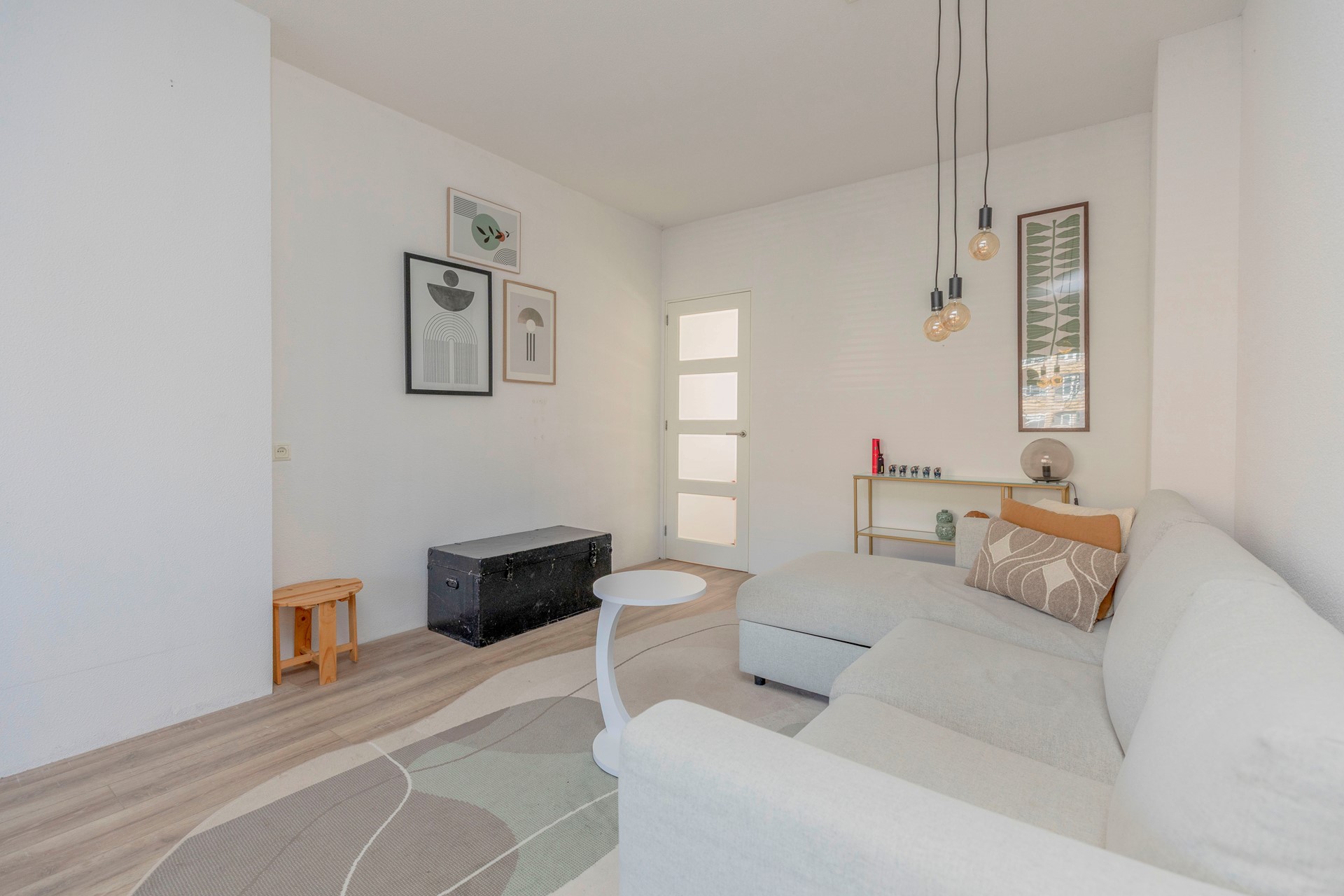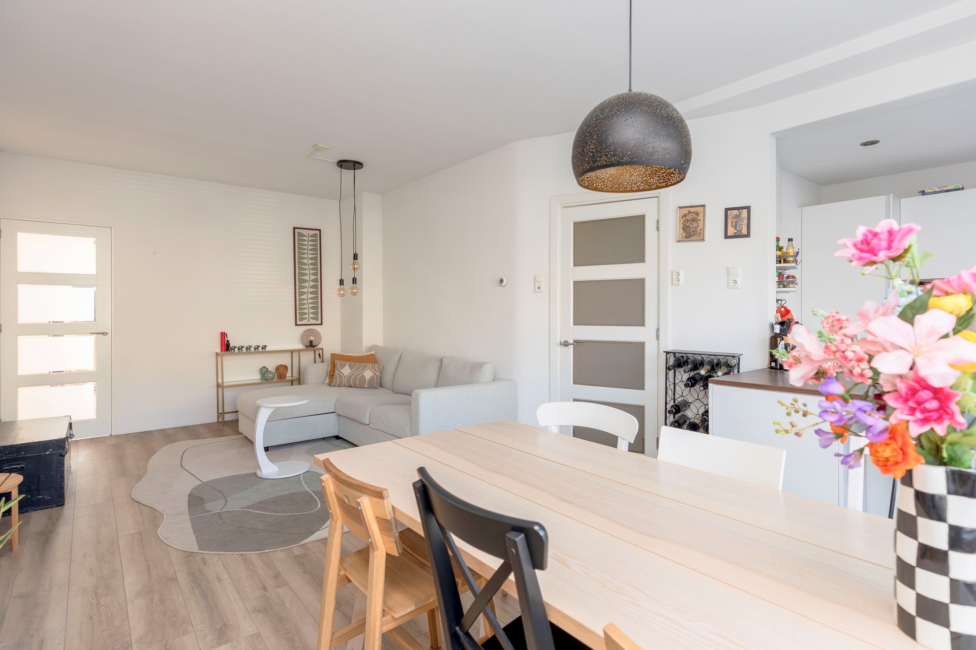 De woning is volledig voorzien van strak gestuukte wanden en plafonds en een moderne houtlook laminaatvloer, wat zorgt voor een verzorgde en eigentijdse uitstraling.