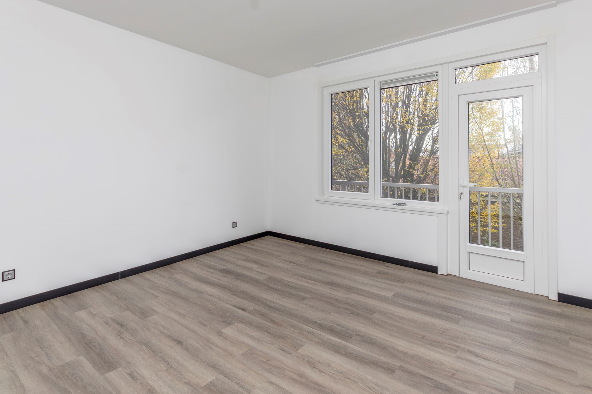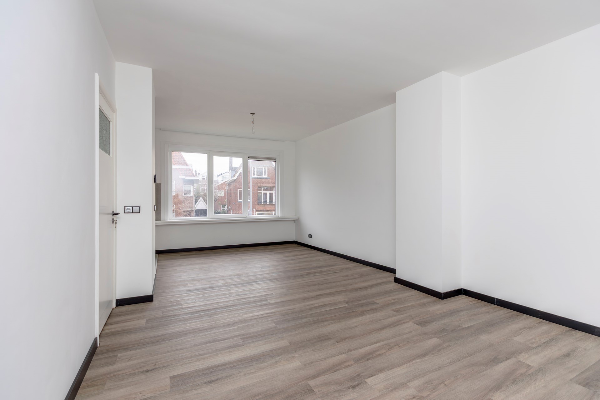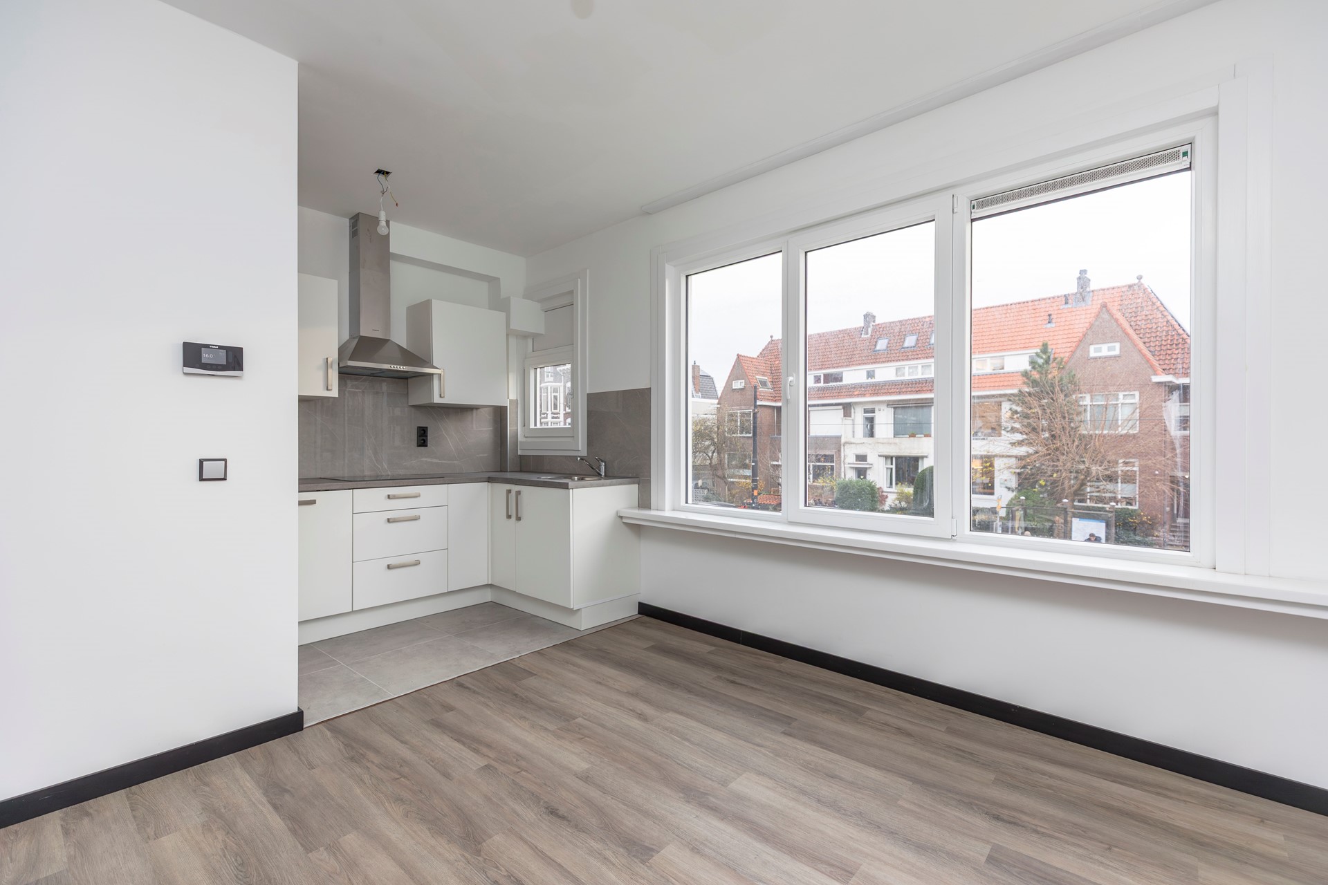 De woonkamer aan de voorzijde is een prachtige, lichte ruimte dankzij het grote raam dat uitkijkt over de brede straat. De nette laminaatvloer loopt door over de gehele verdieping, wat zorgt voor een rustige en stijlvolle uitstraling.
